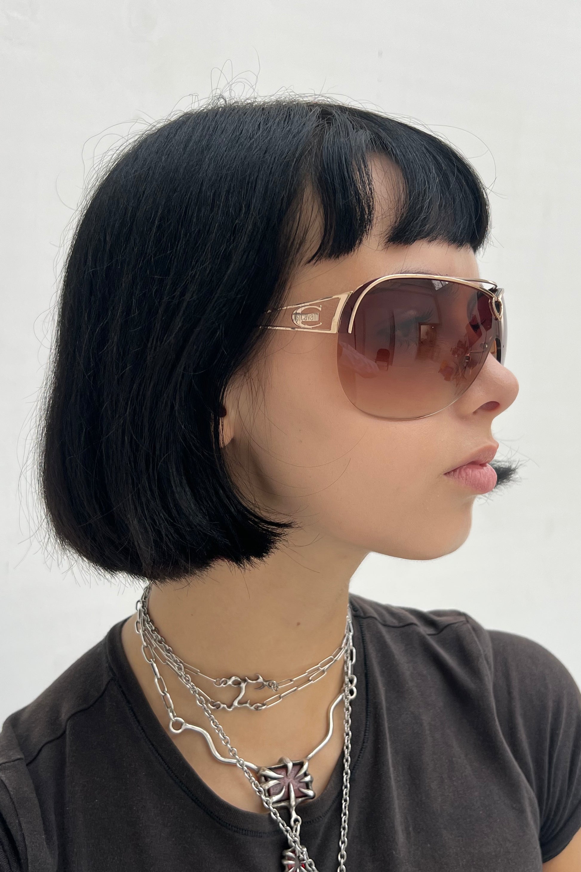 Cavalli sunglasses that come in a mask-shape in brown with a golden frame. The frame has a mini heart in the middle.