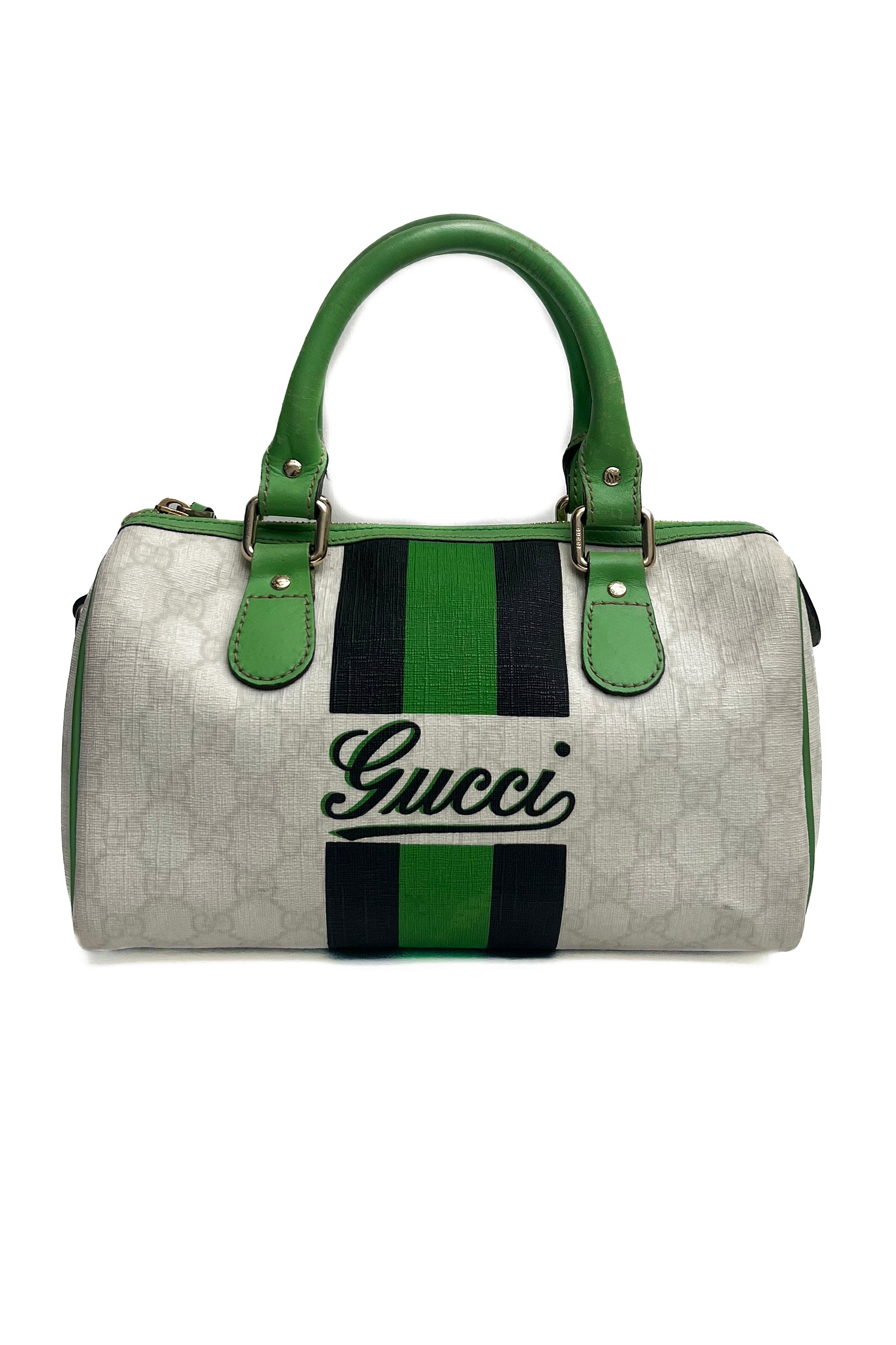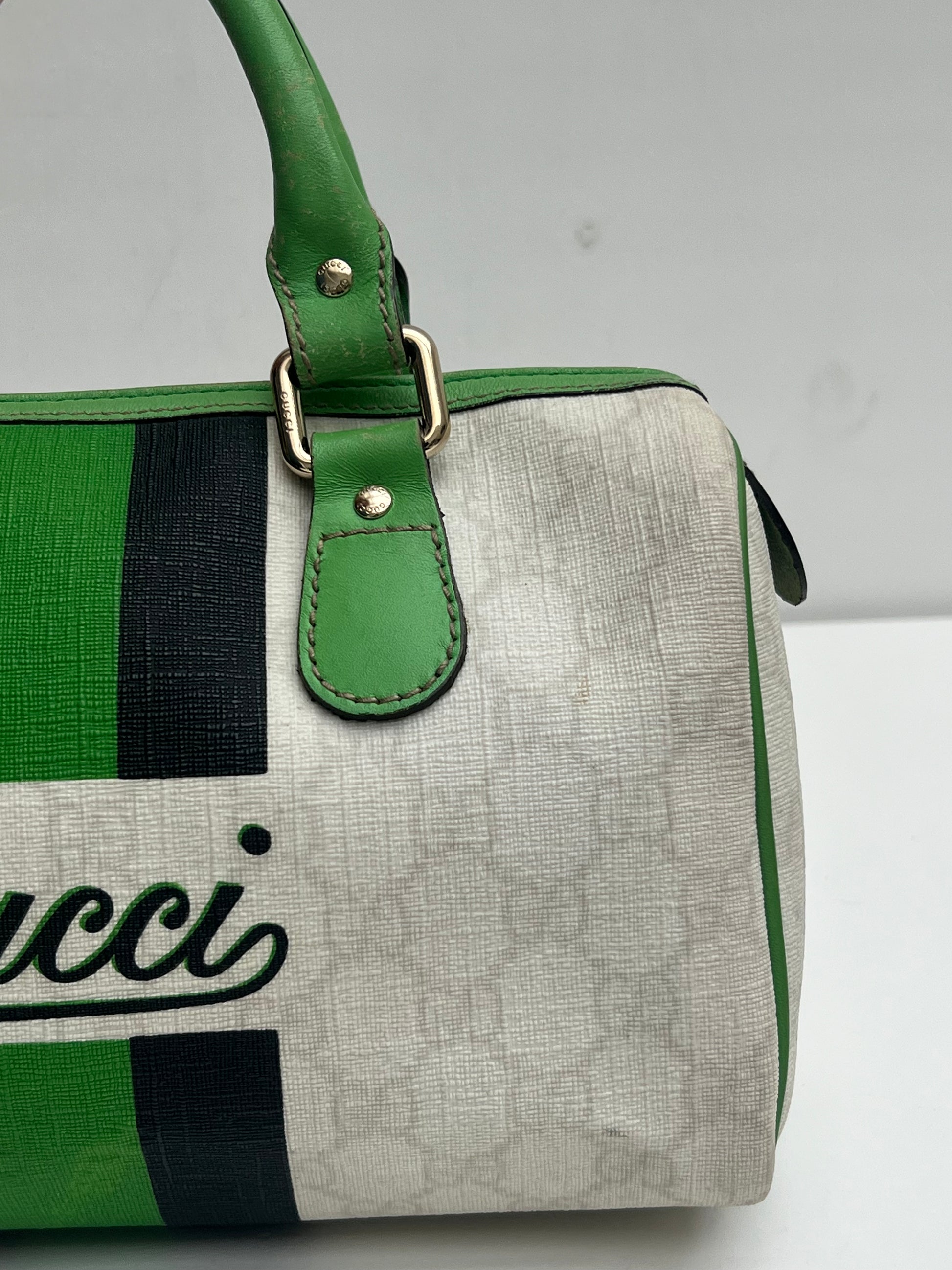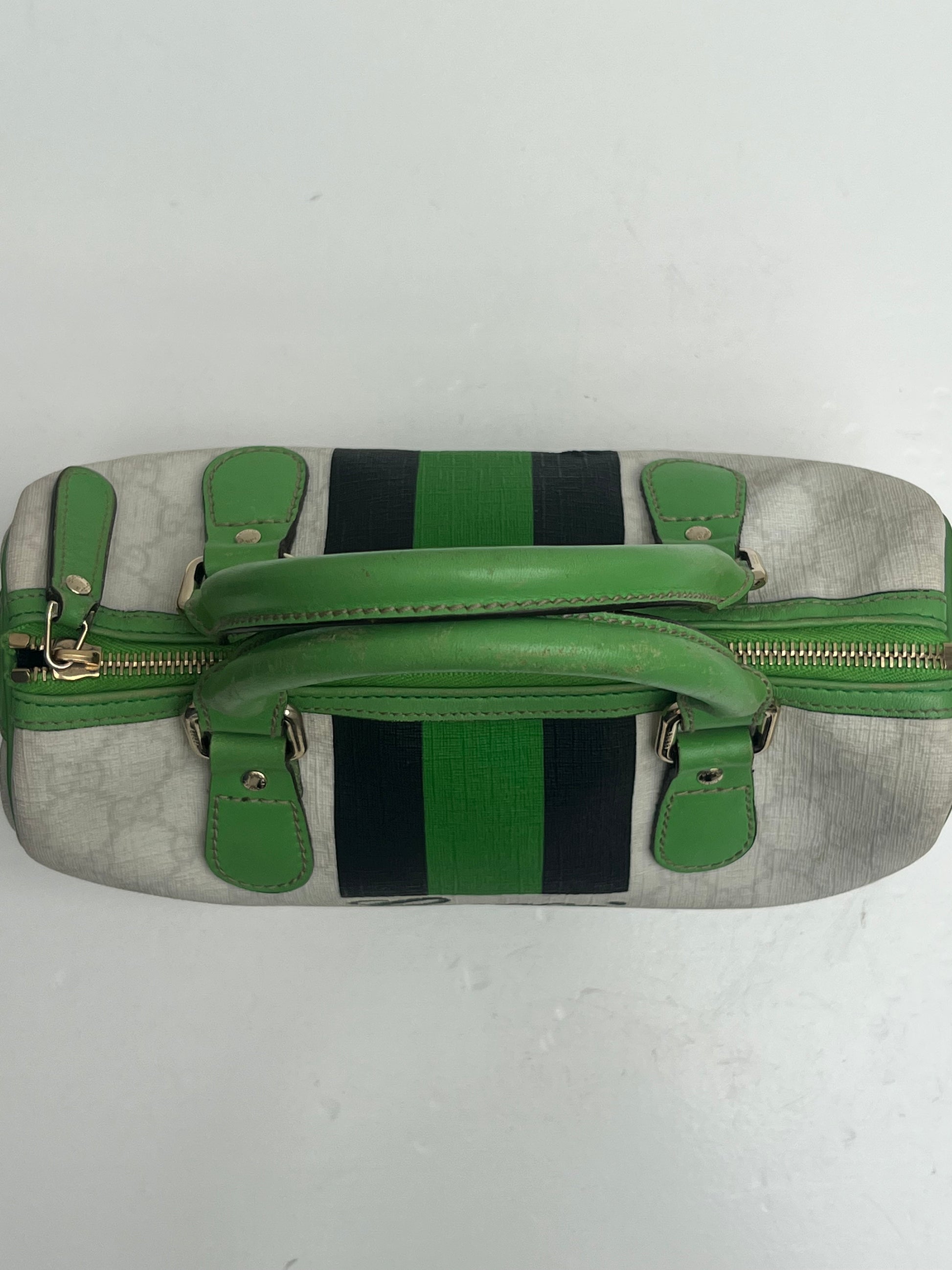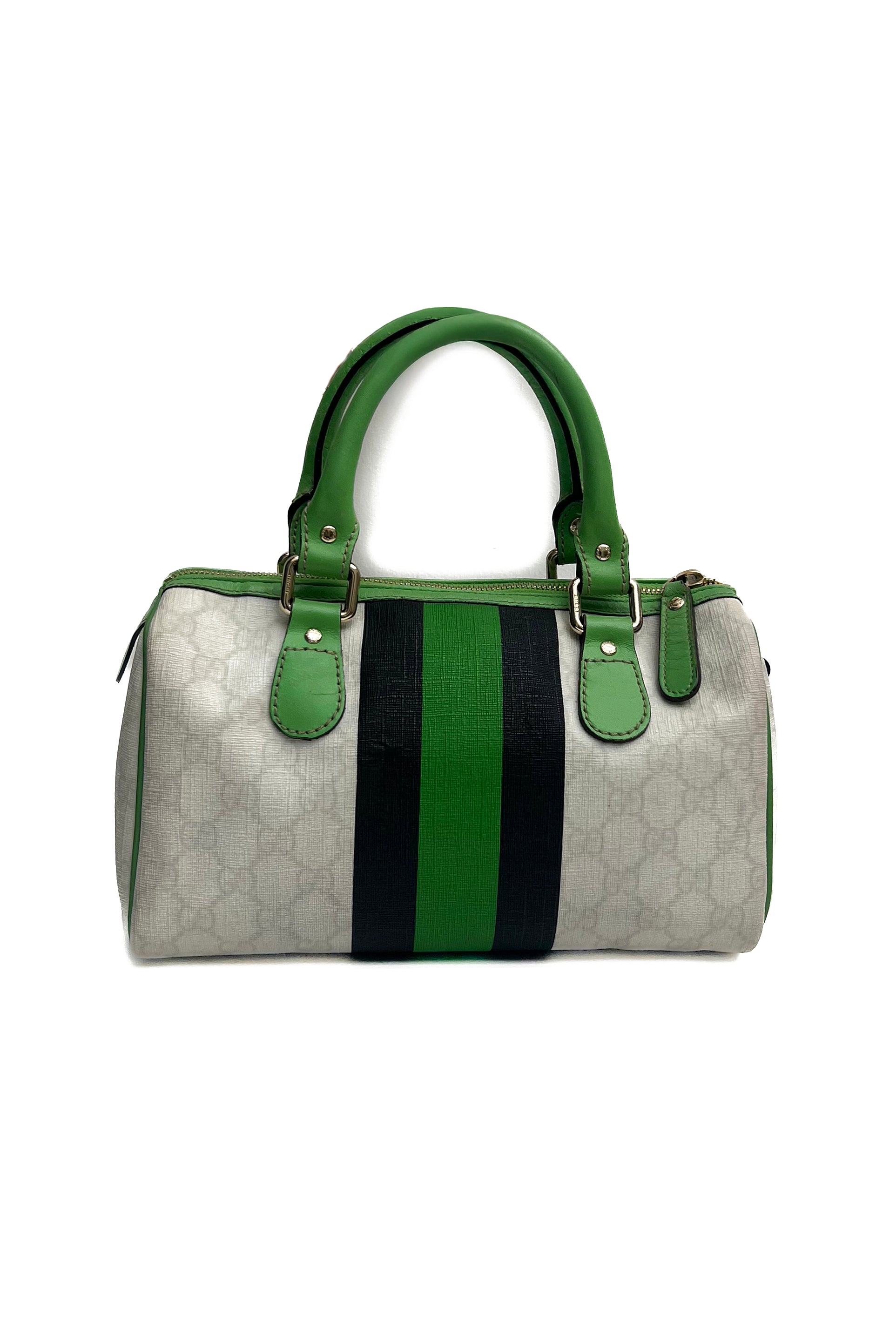 Gucci Boston Joy hand bag with green, black & white. She comes in coated canvas with green leather details and the interior has a small separate pocket.