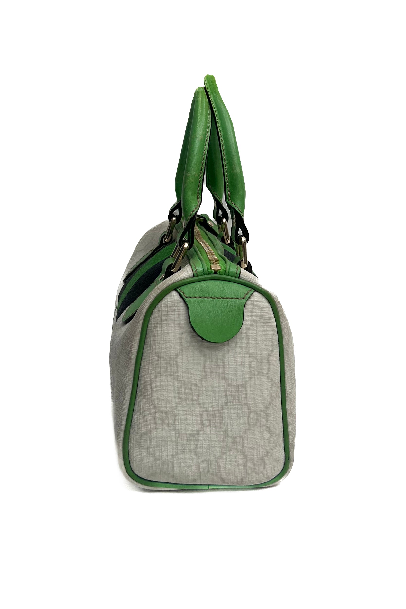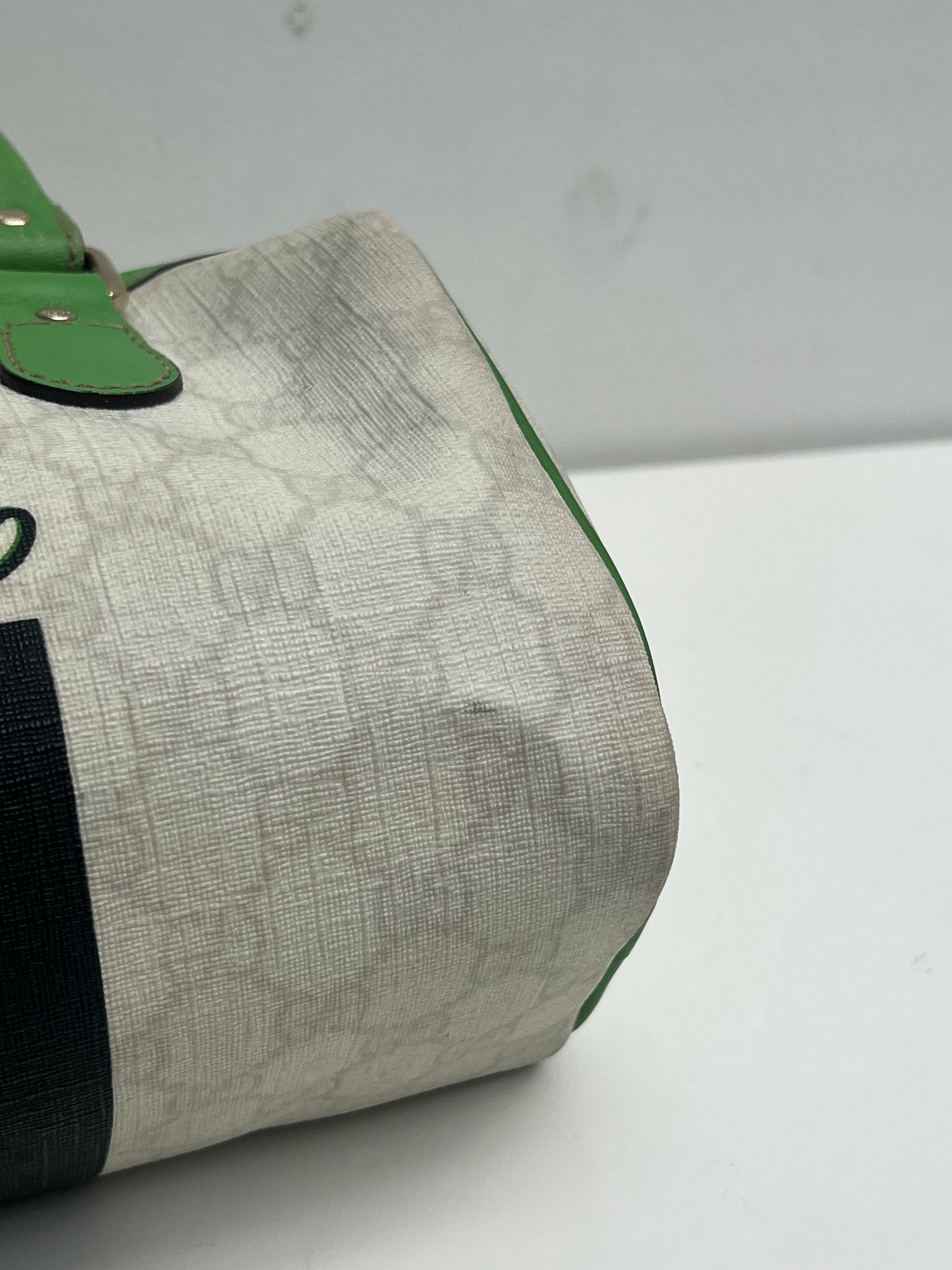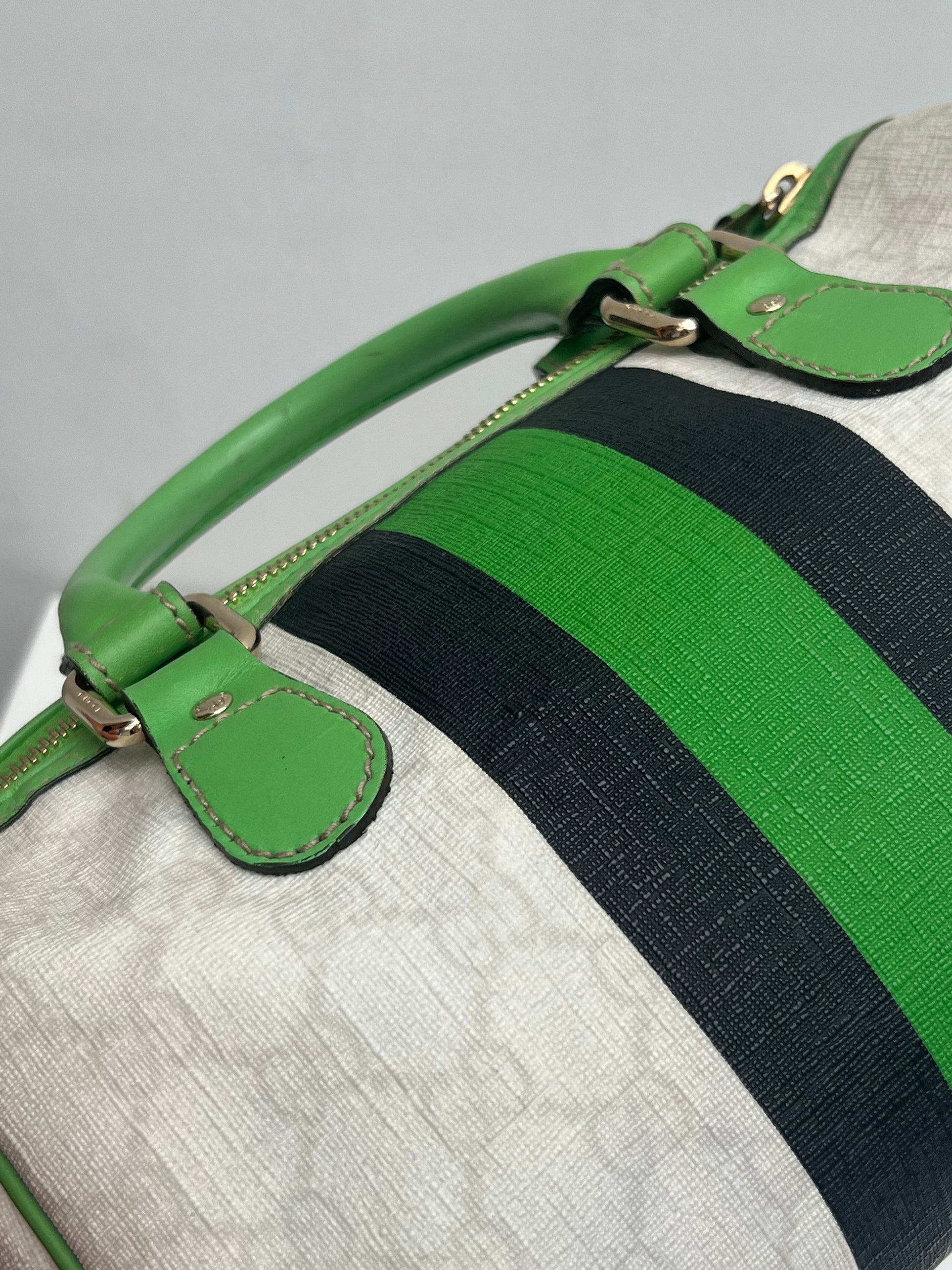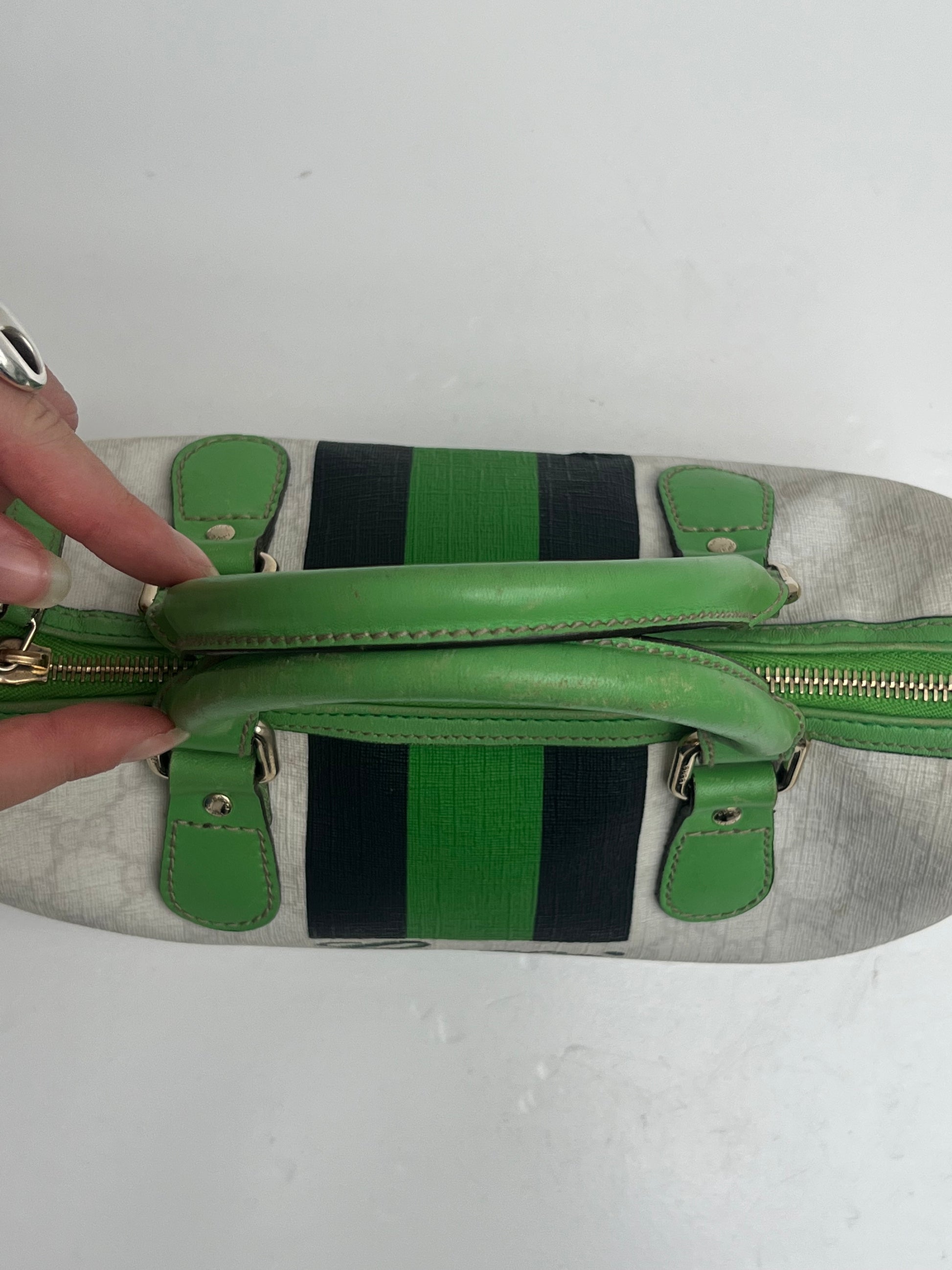 Gucci Boston Joy hand bag with green, black & white. She comes in coated canvas with green leather details and the interior has a small separate pocket.