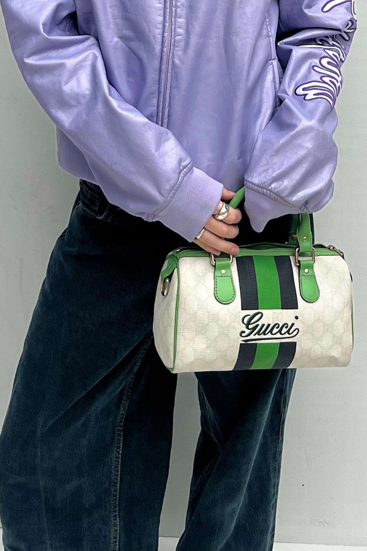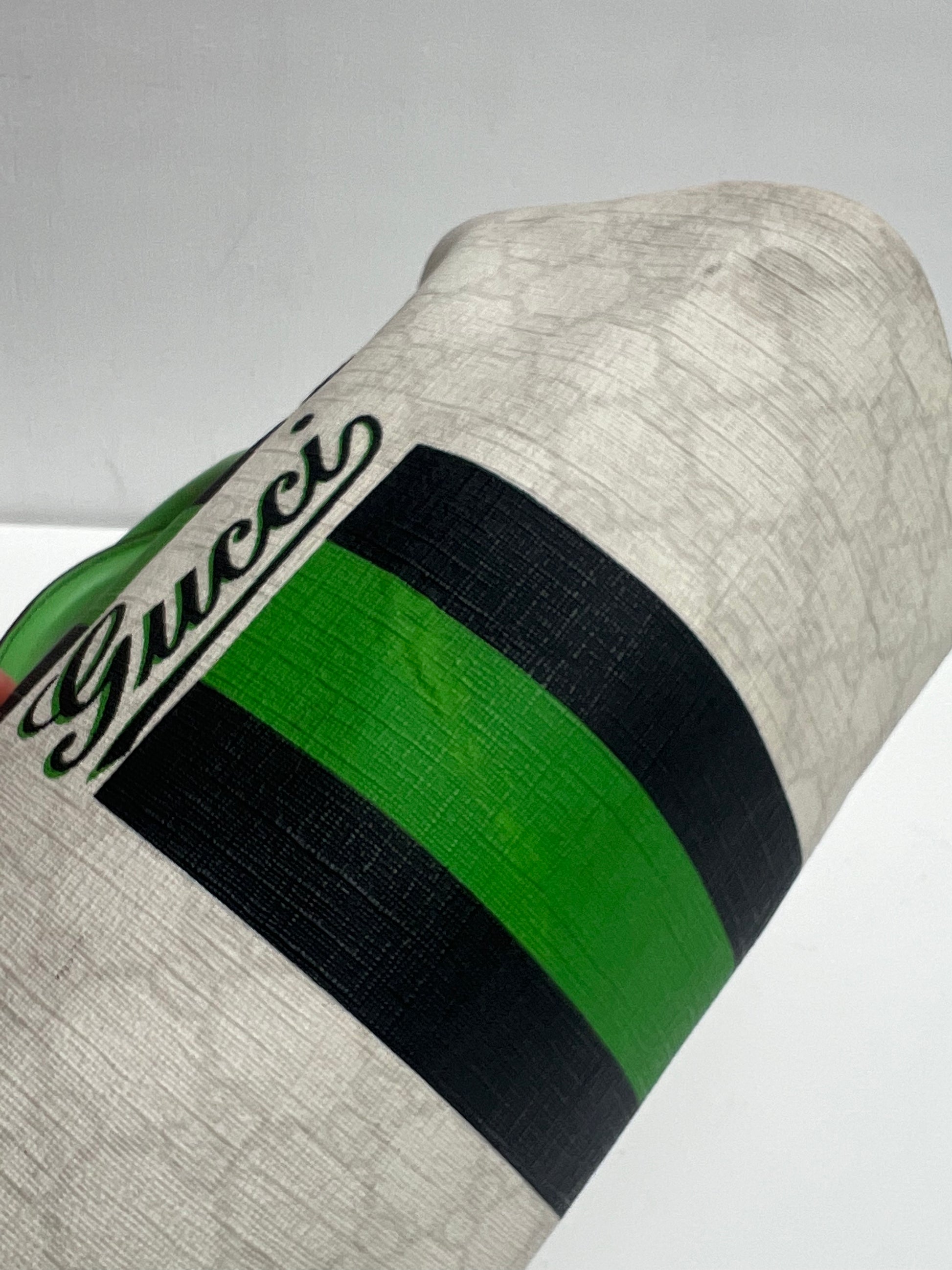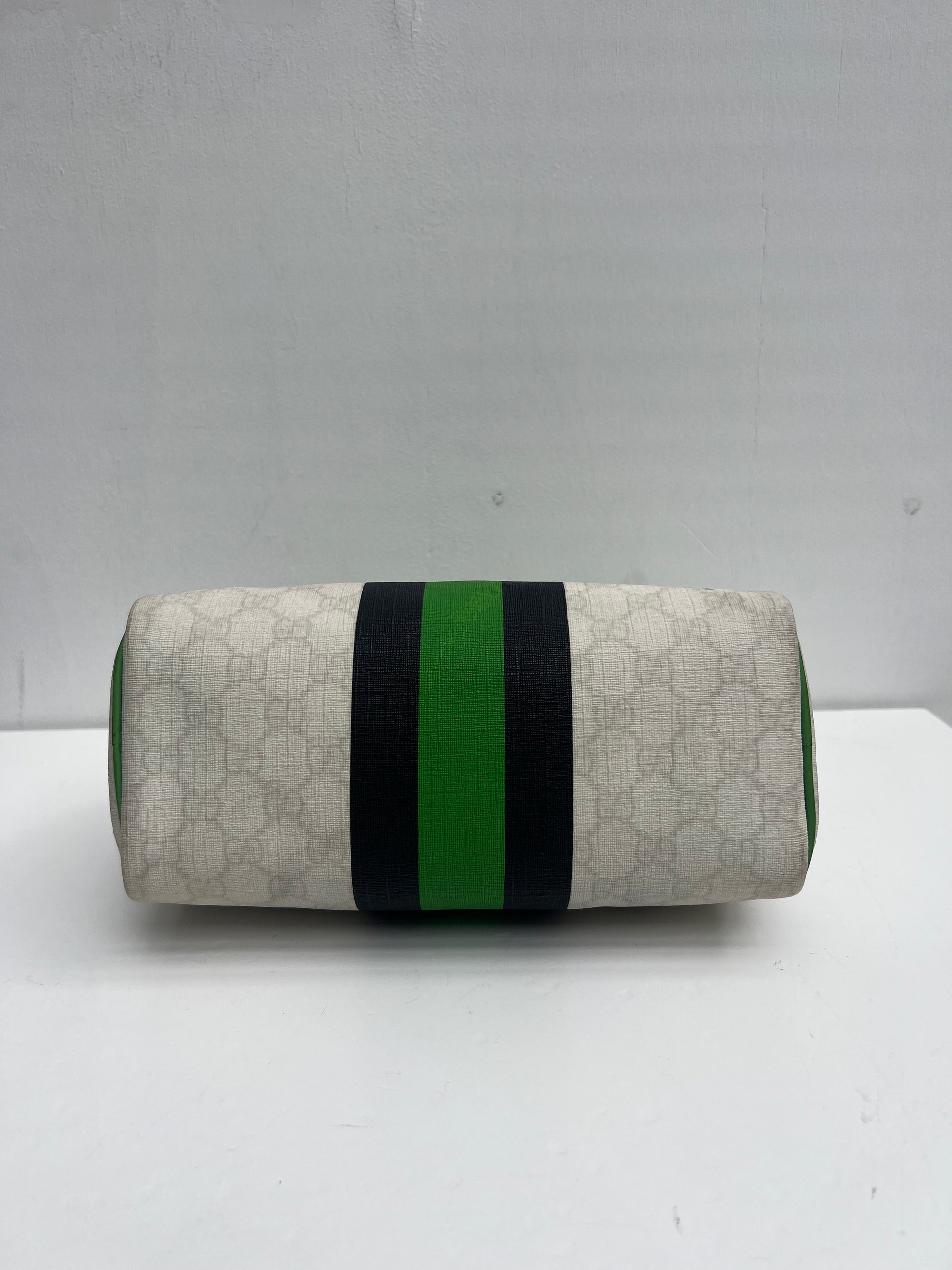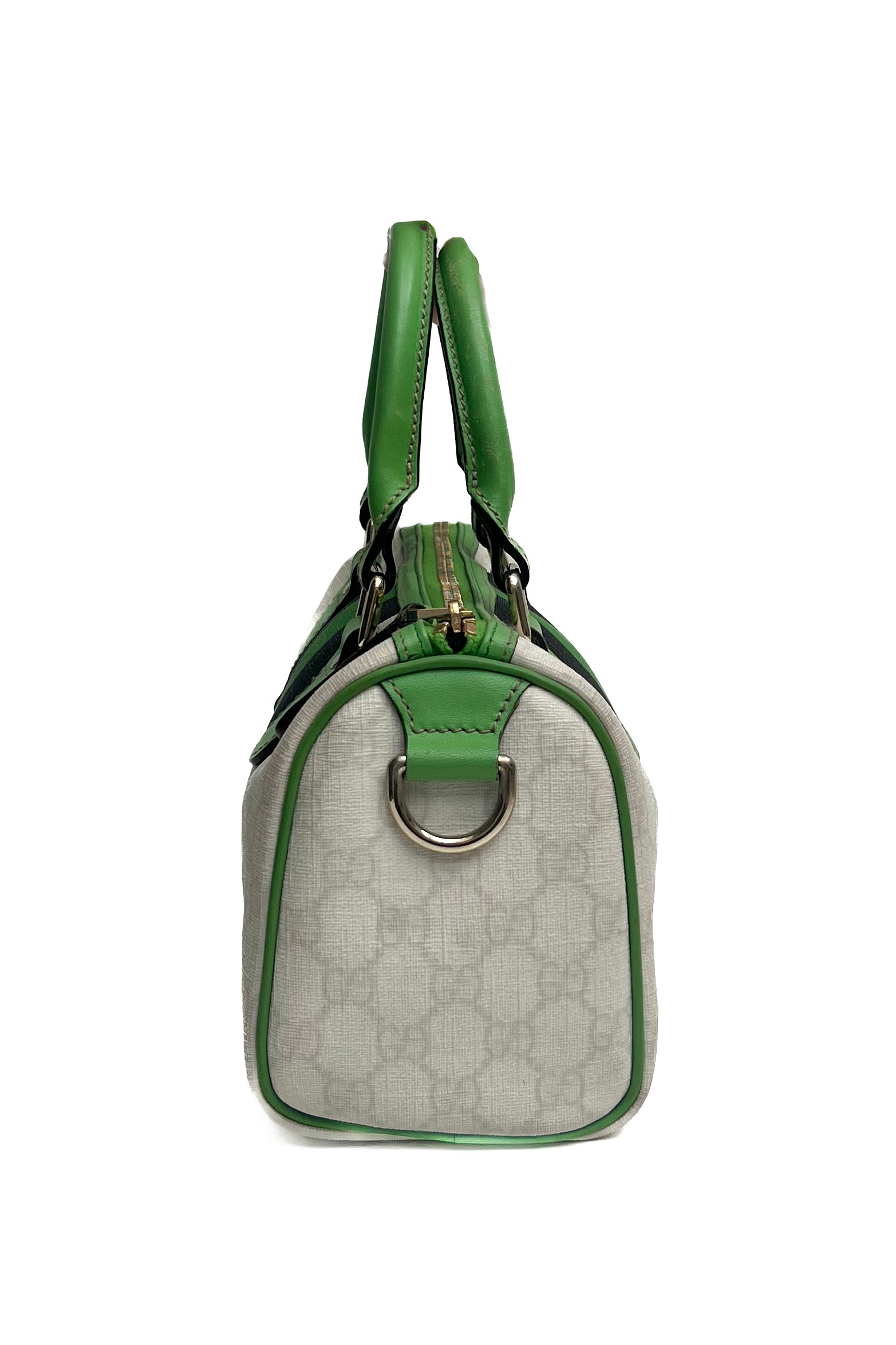 Gucci Boston Joy hand bag with green, black & white. She comes in coated canvas with green leather details and the interior has a small separate pocket.