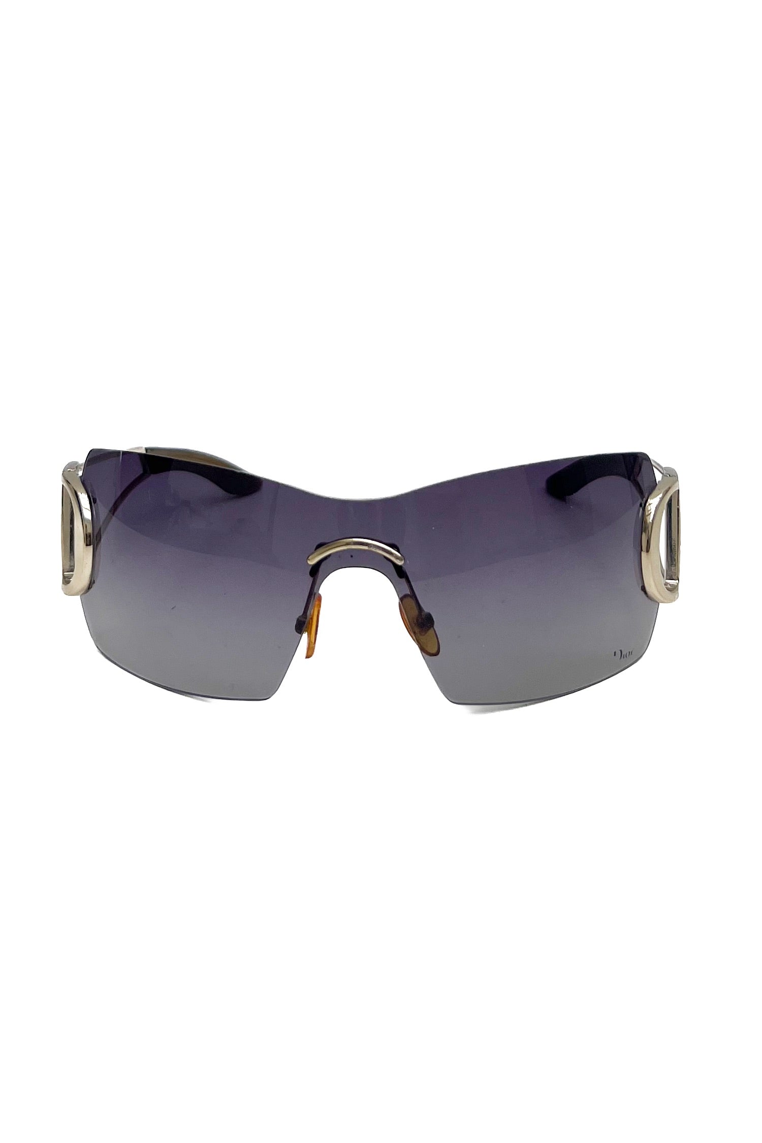 Vintage Christian Dior rimless mask sunglasses with purple lenses and golden 'D' shaped arms.