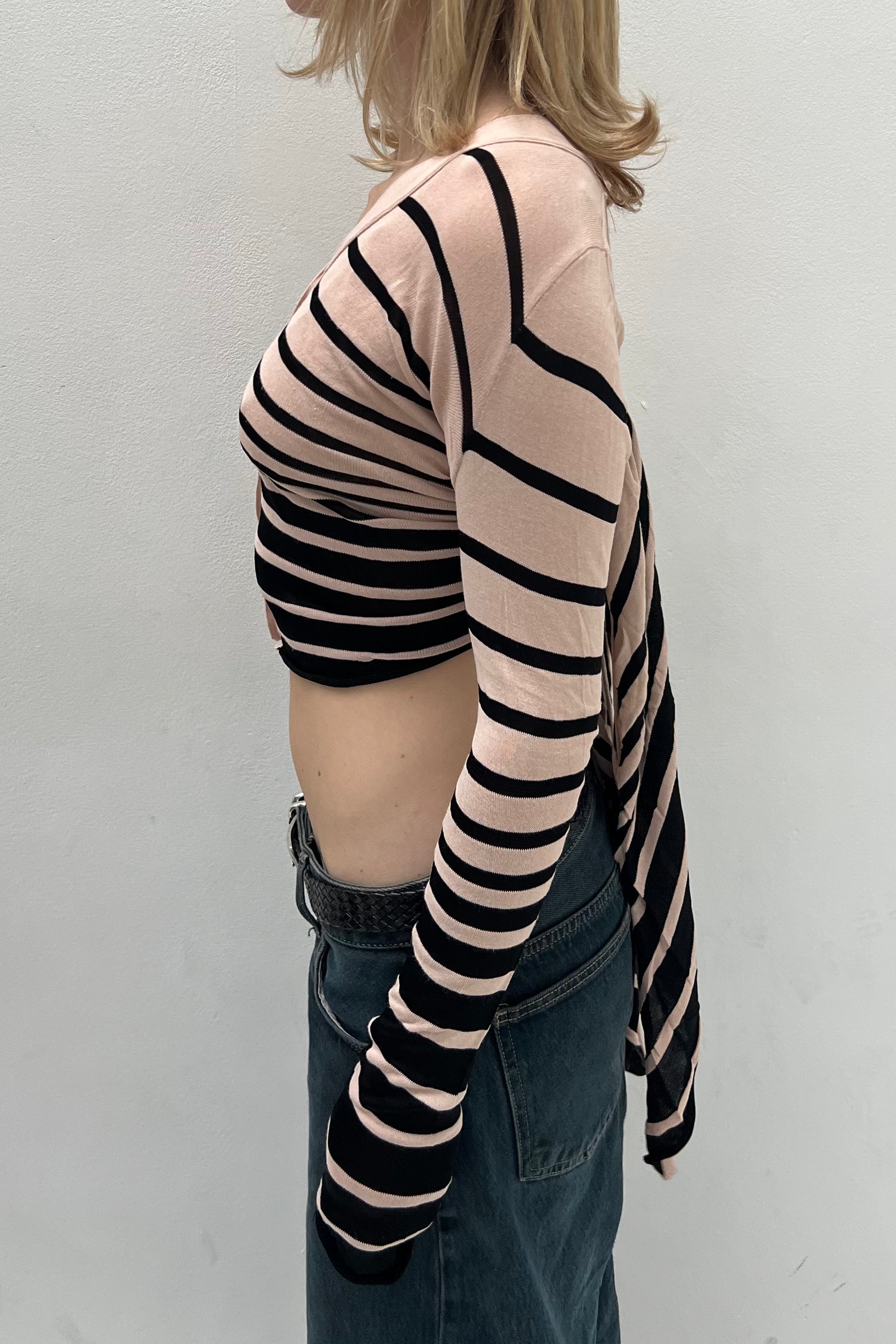 Vintage Jean Paul Gaultier dusty pink striped cardigan featuring an open back with a large bow-tie closure and pearl button fastening at the front.