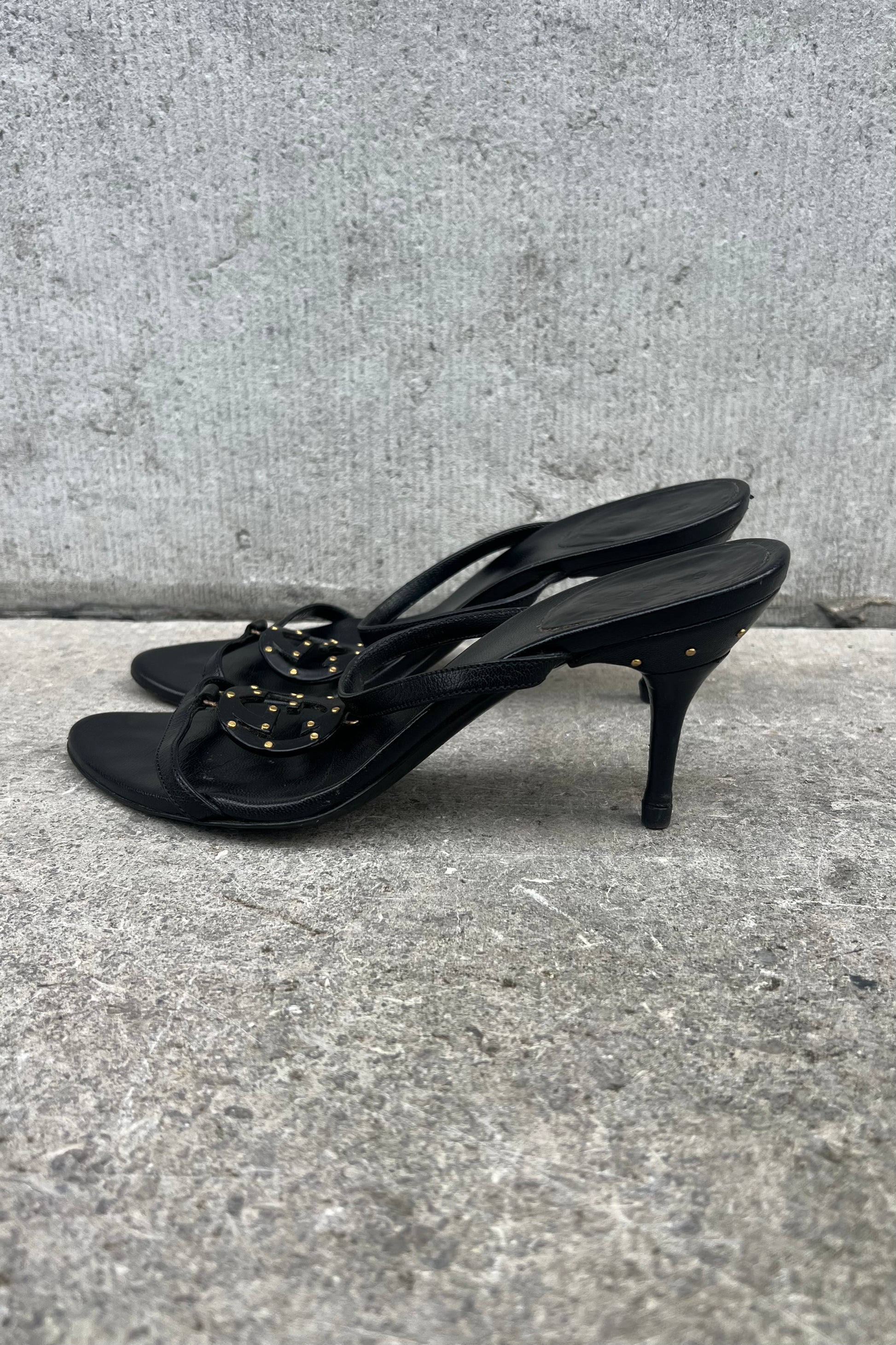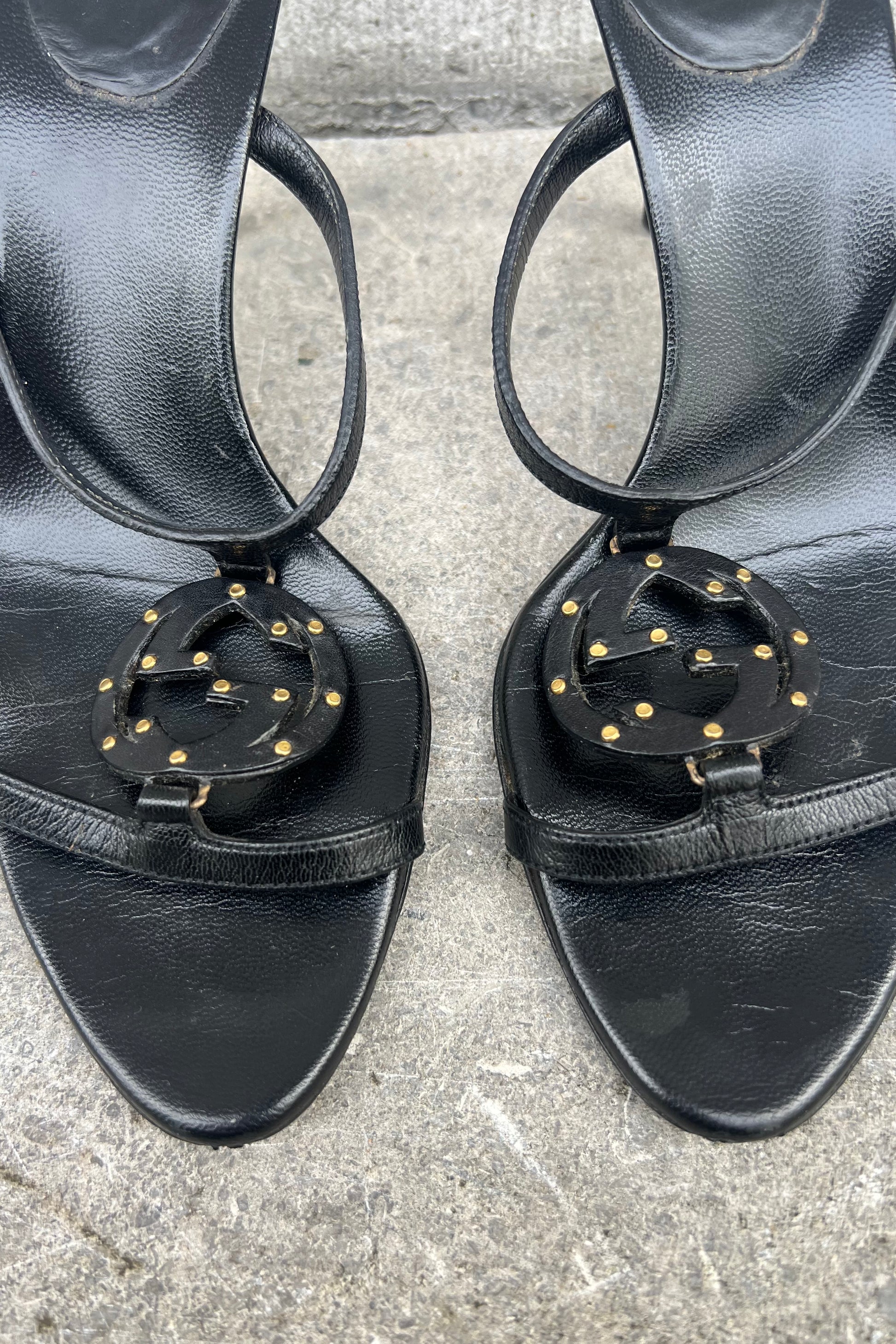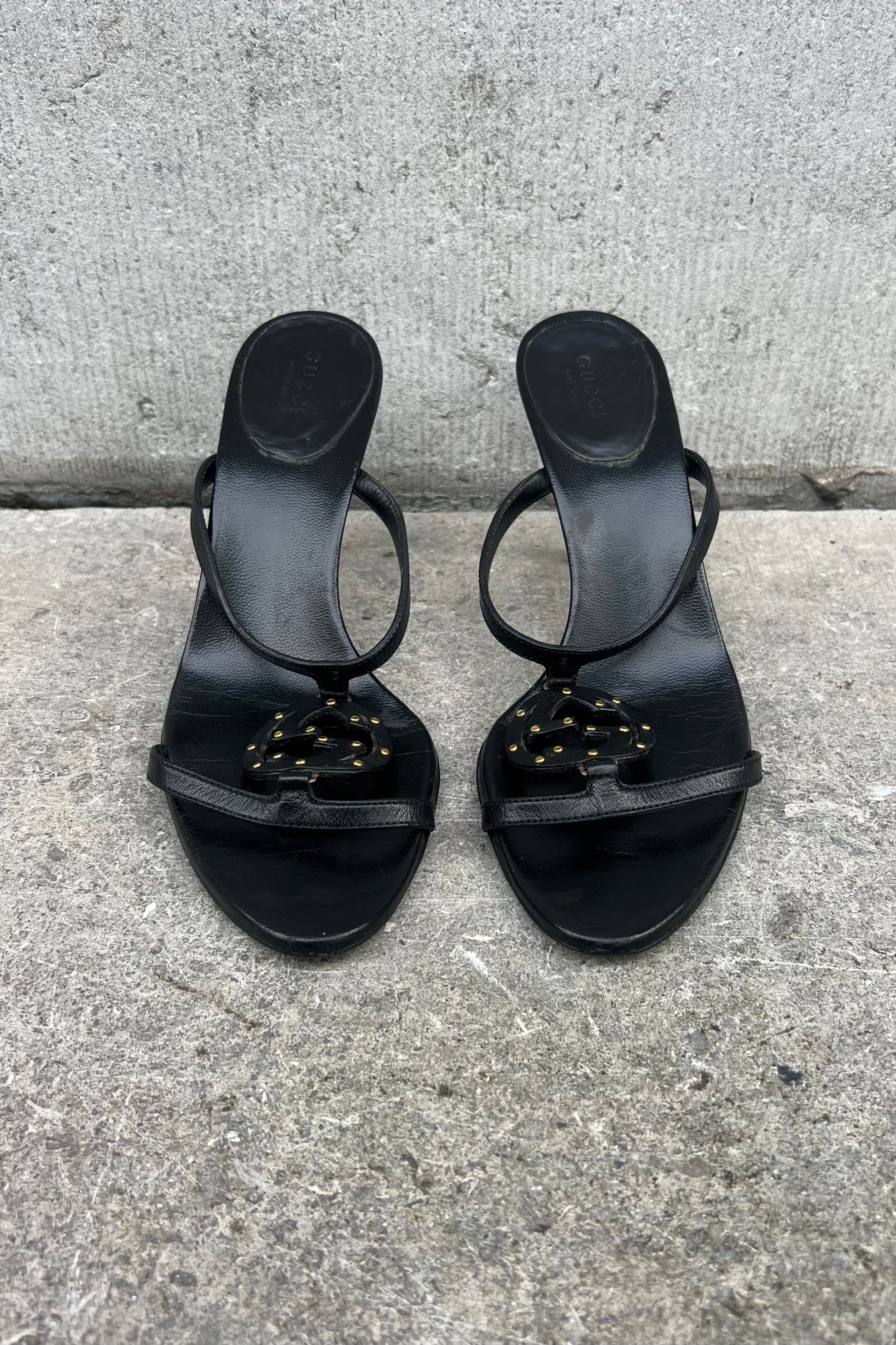 Vintage Black Leather Mini Studs Logo Mules. Features golden studs on the GG logo & around the heel.