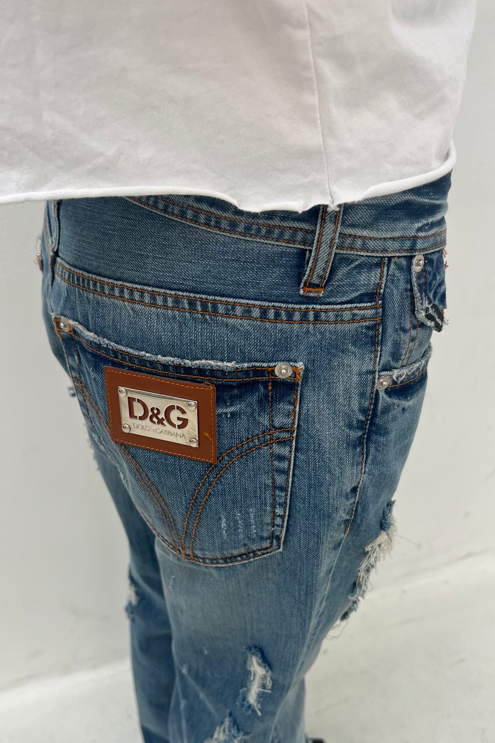 Vintage D&G distressed low-rise denim pants featuring double pocket detailing at the front and a silver metal logo patch on the back.