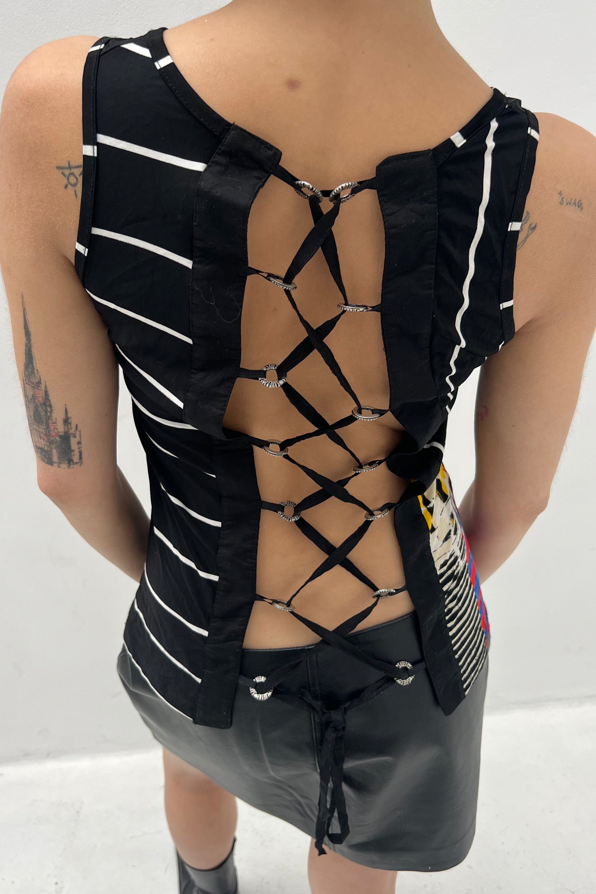 Vintage black stripped top with tattoo patch in the front and open back lacing.