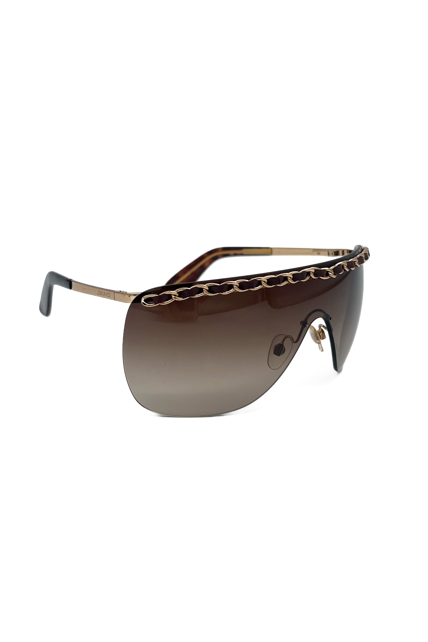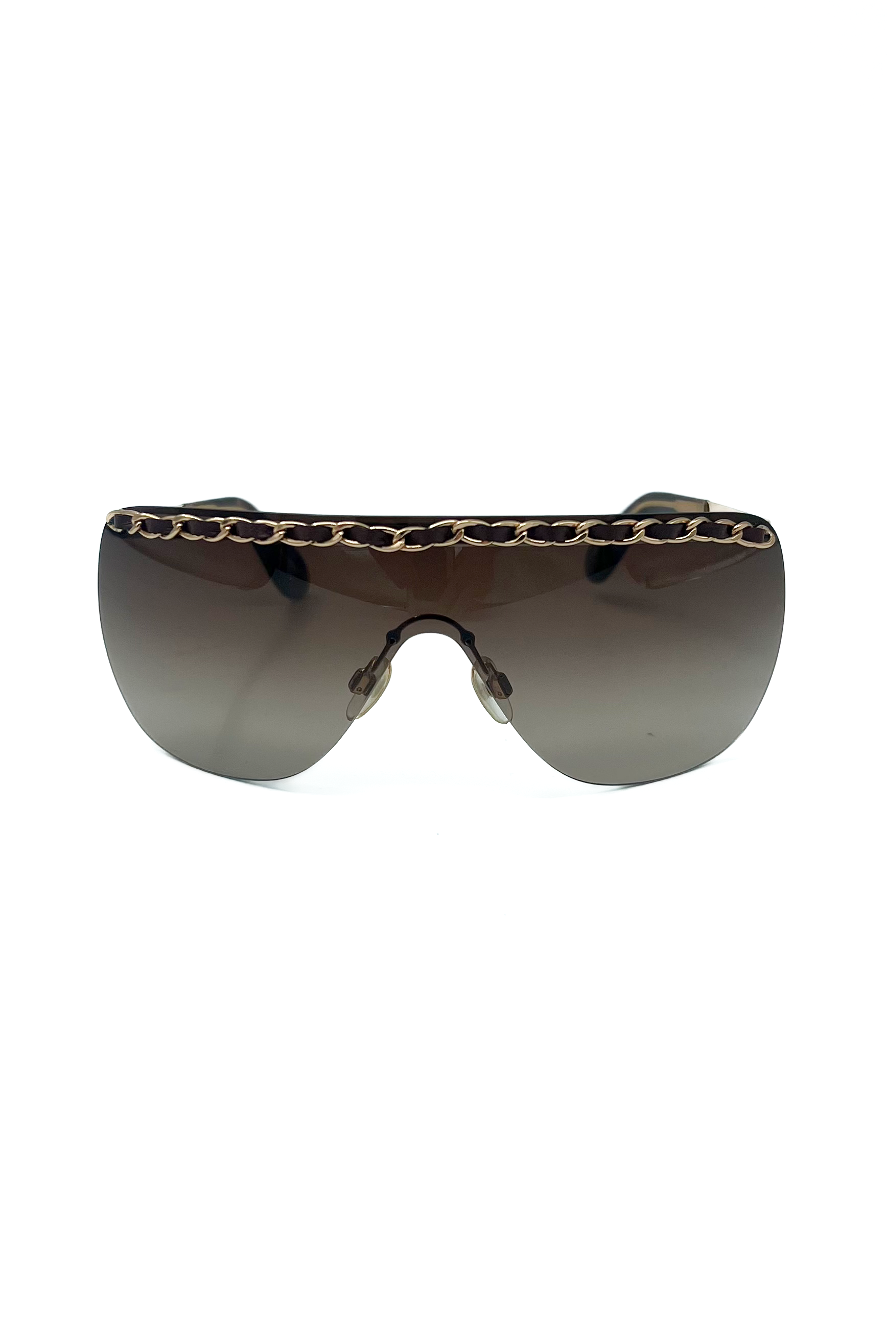 Vintage Chanel mask sunglasses in a brown shade. They have a gold & leather chain detail on the lenses.