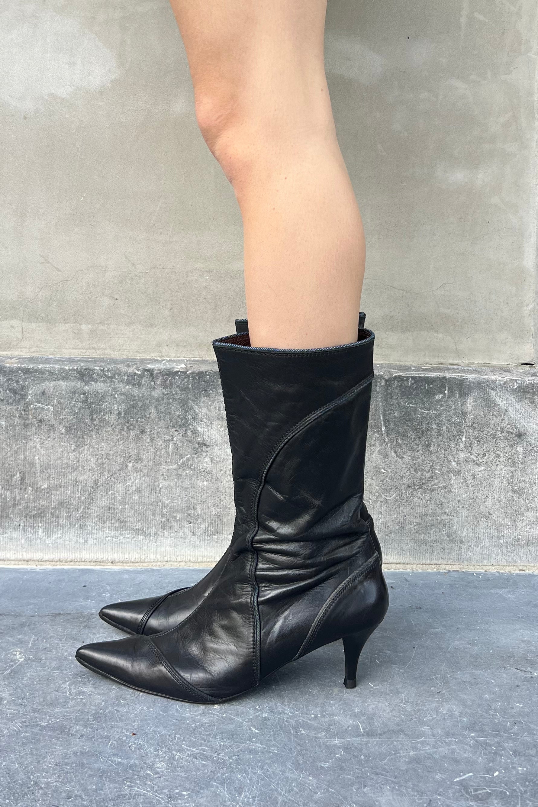 Vintage Miss Sixty boots made from black leather with a kitten heel. They feature asymmetric stitching, a side zip closure, and an embroidered logo at the top. Finished with cute denim details along the upper edge.