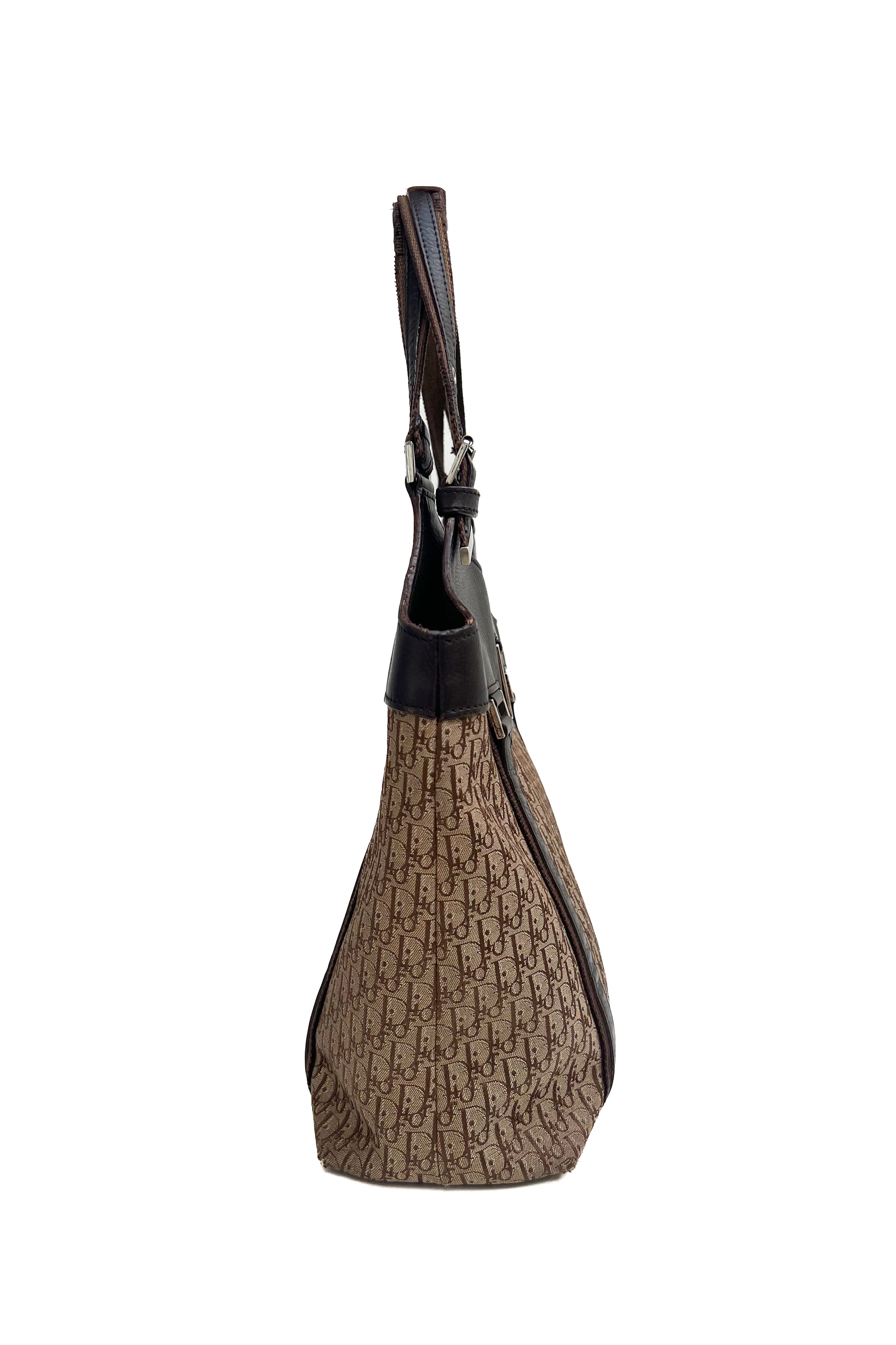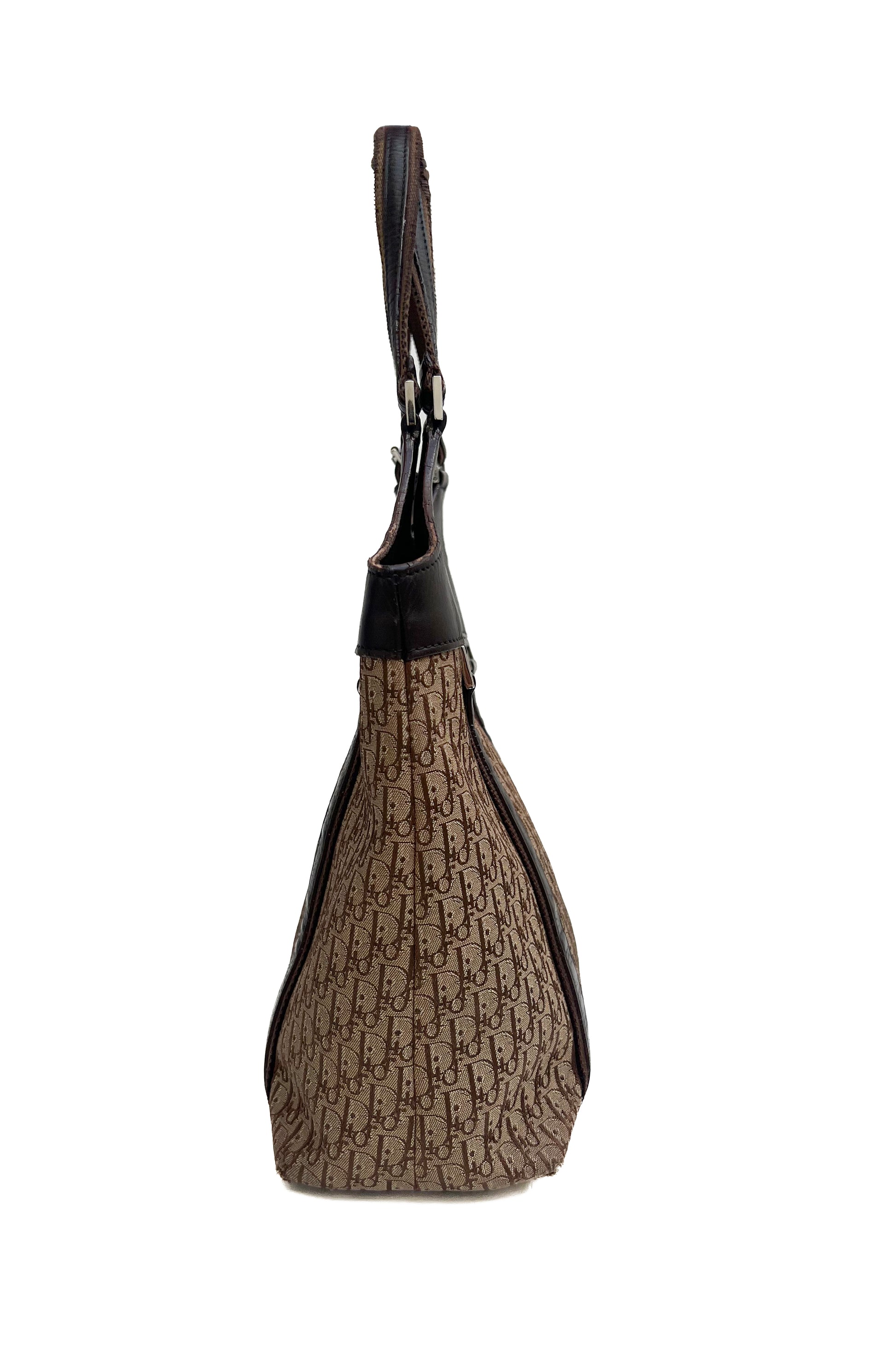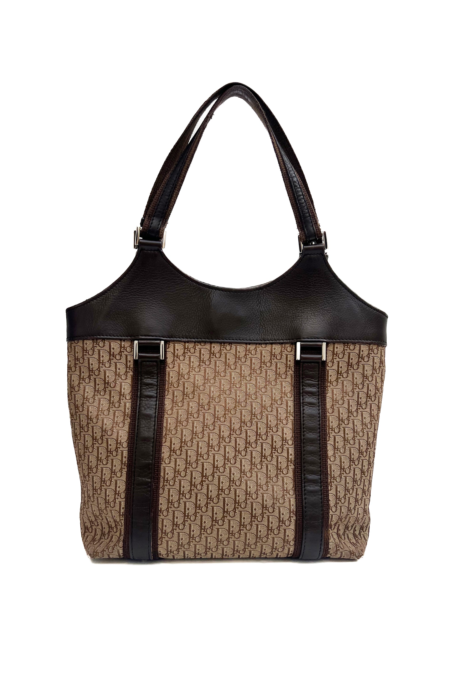 This Dior tote bag features the iconic trotter monogram canvas and silver hardware including a Dior logo plaque. It has leather and canvas handles and detailing.