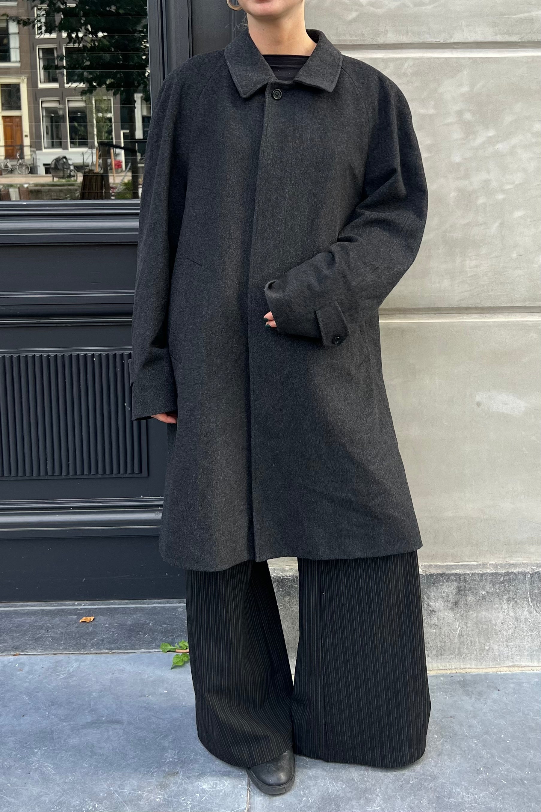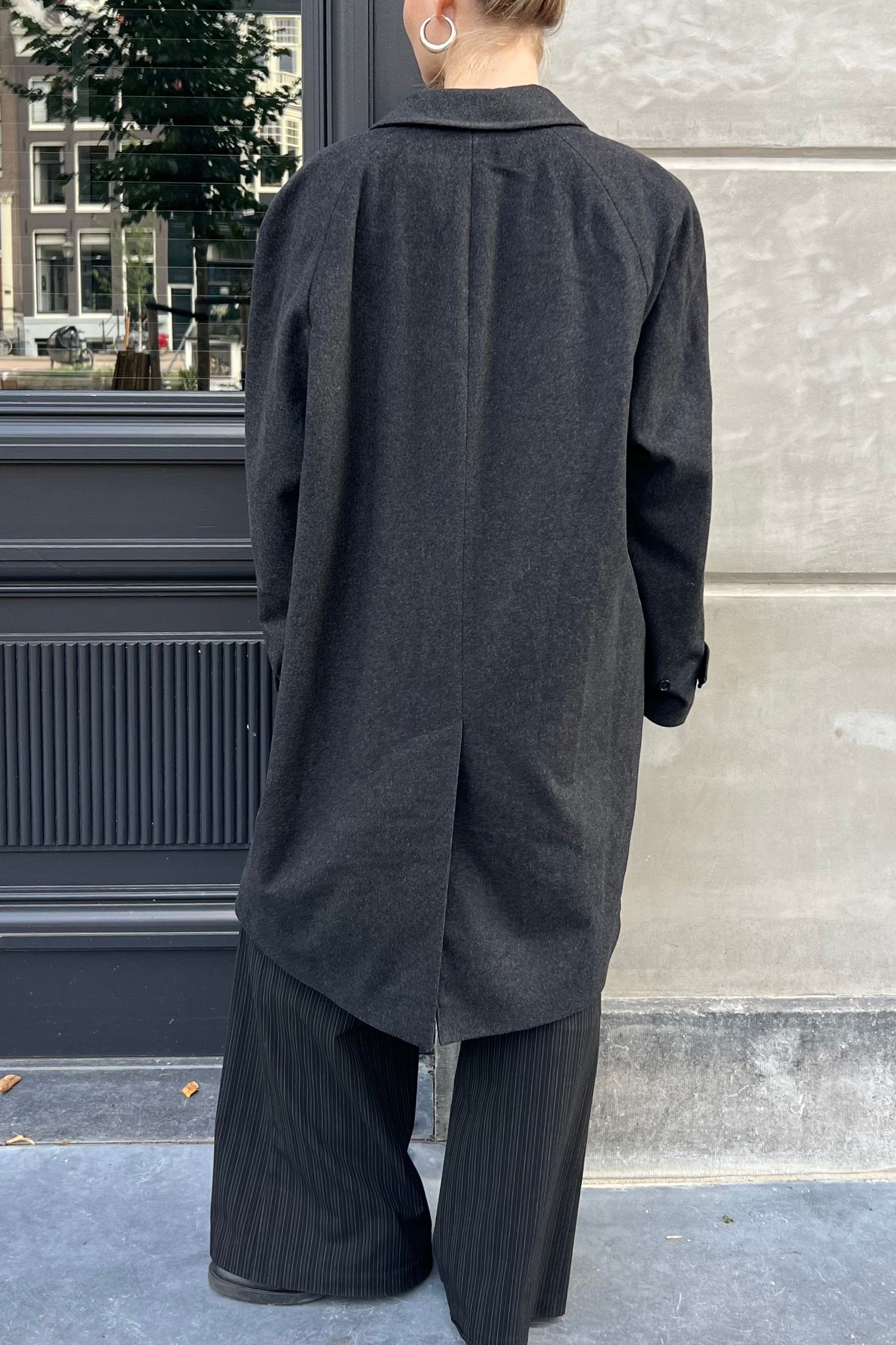 Vintage classic Burberry straight coat in grey, crafted from a high-quality wool and cashmere blend. Features the iconic straight-cut trench silhouette with a full front button closure, and a back vent for ease of movement.