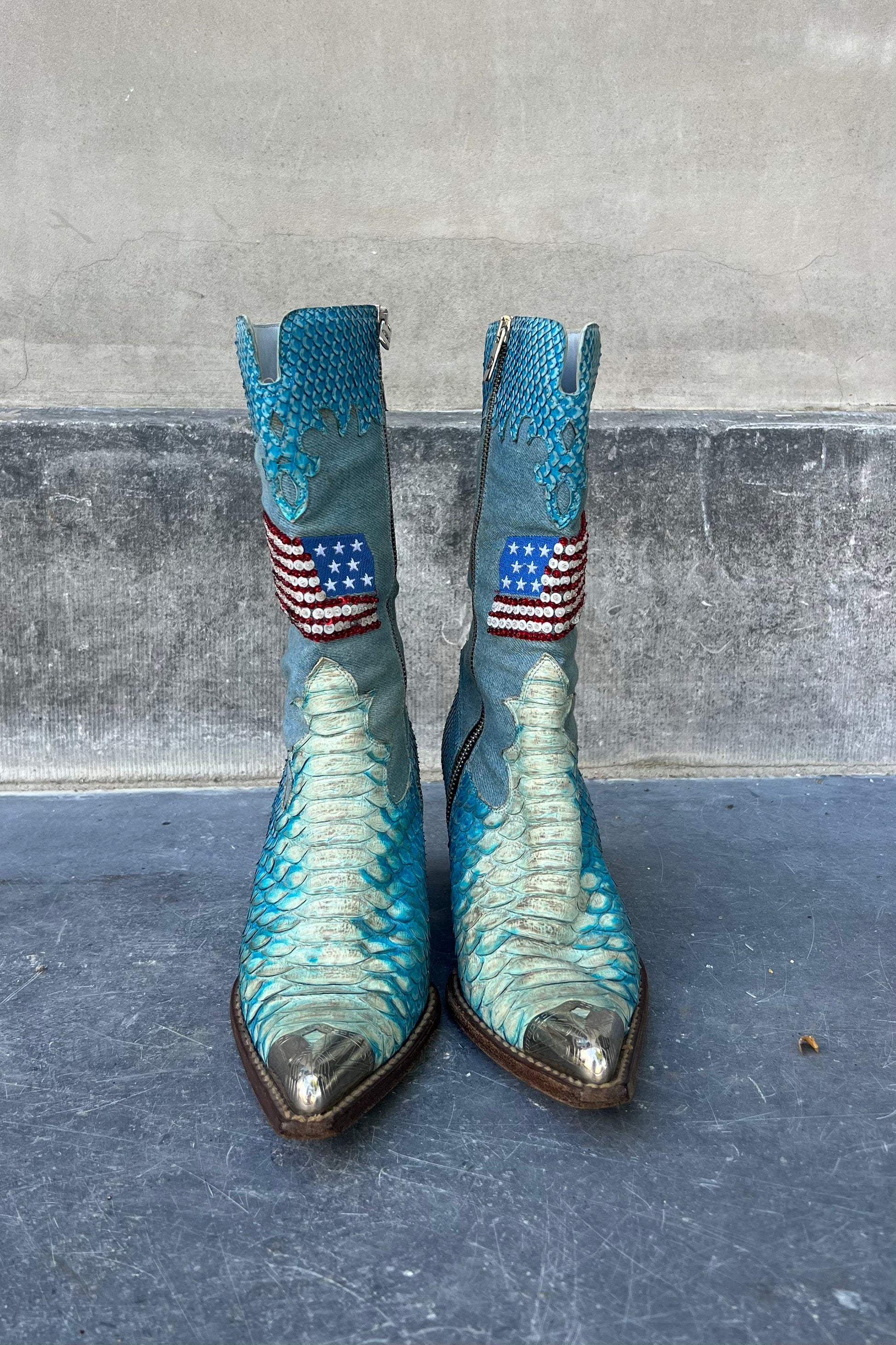 Nando Muzi Vintage pointed toe boots in turquoise. these boots have it all. From a silver toe cap, an embroidered flag and real python skin to denim details.