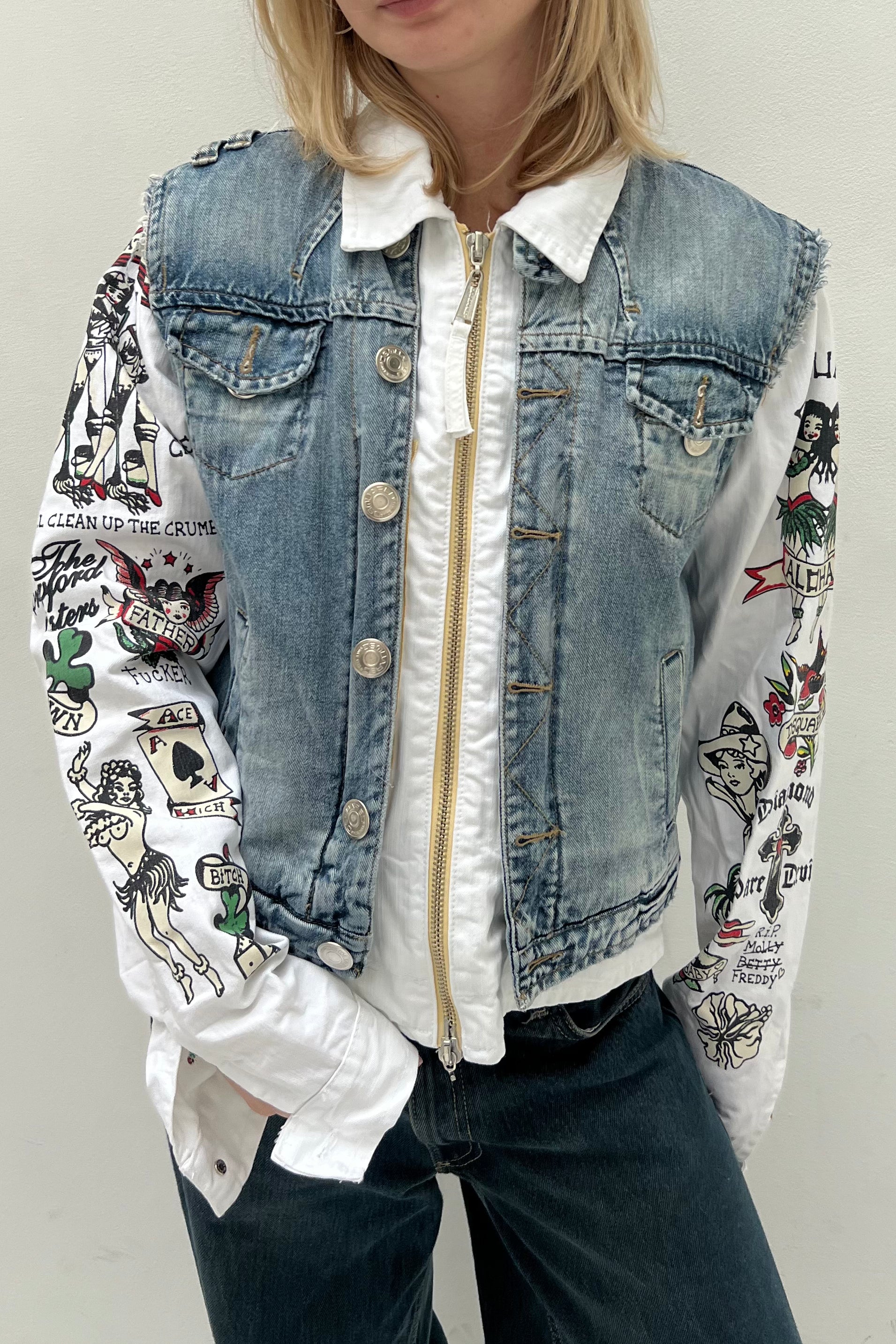 Vintage Dsquared layered denim jacket. Features tattoos print on both sleeves, two inside pockets and both zipper and buttons closure.