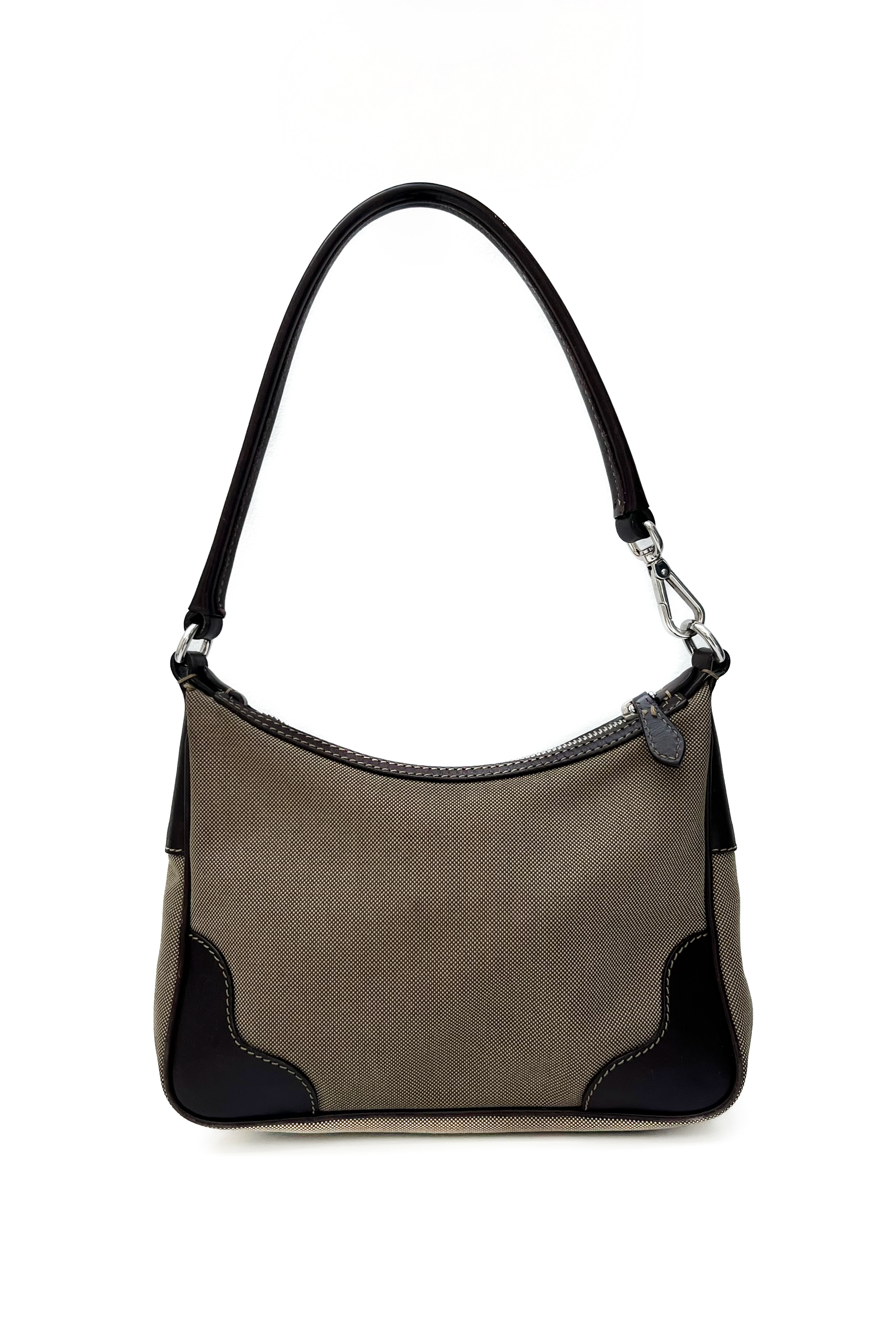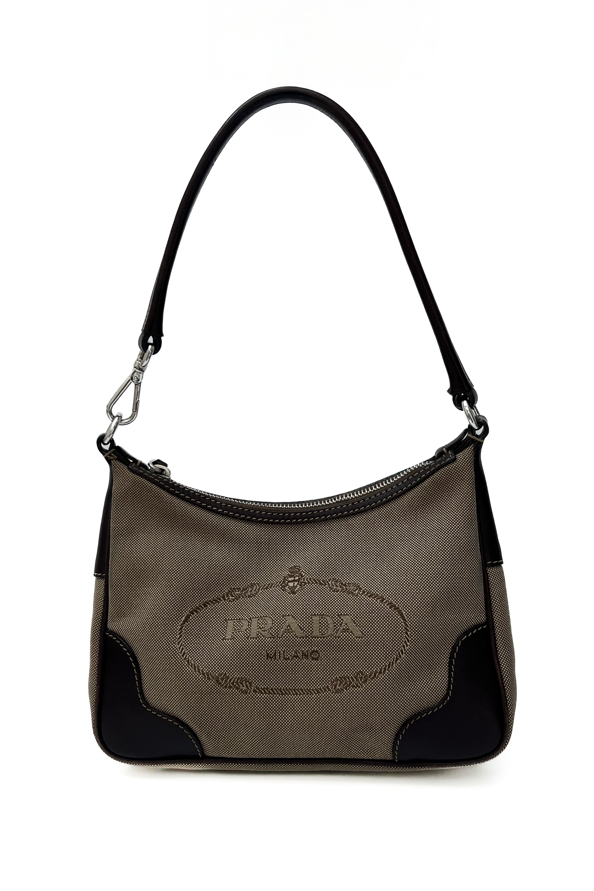 Prada canvas hand bag with big spell-out logo on the front woven into the material. The bag comes with chocolate leather details and handles.