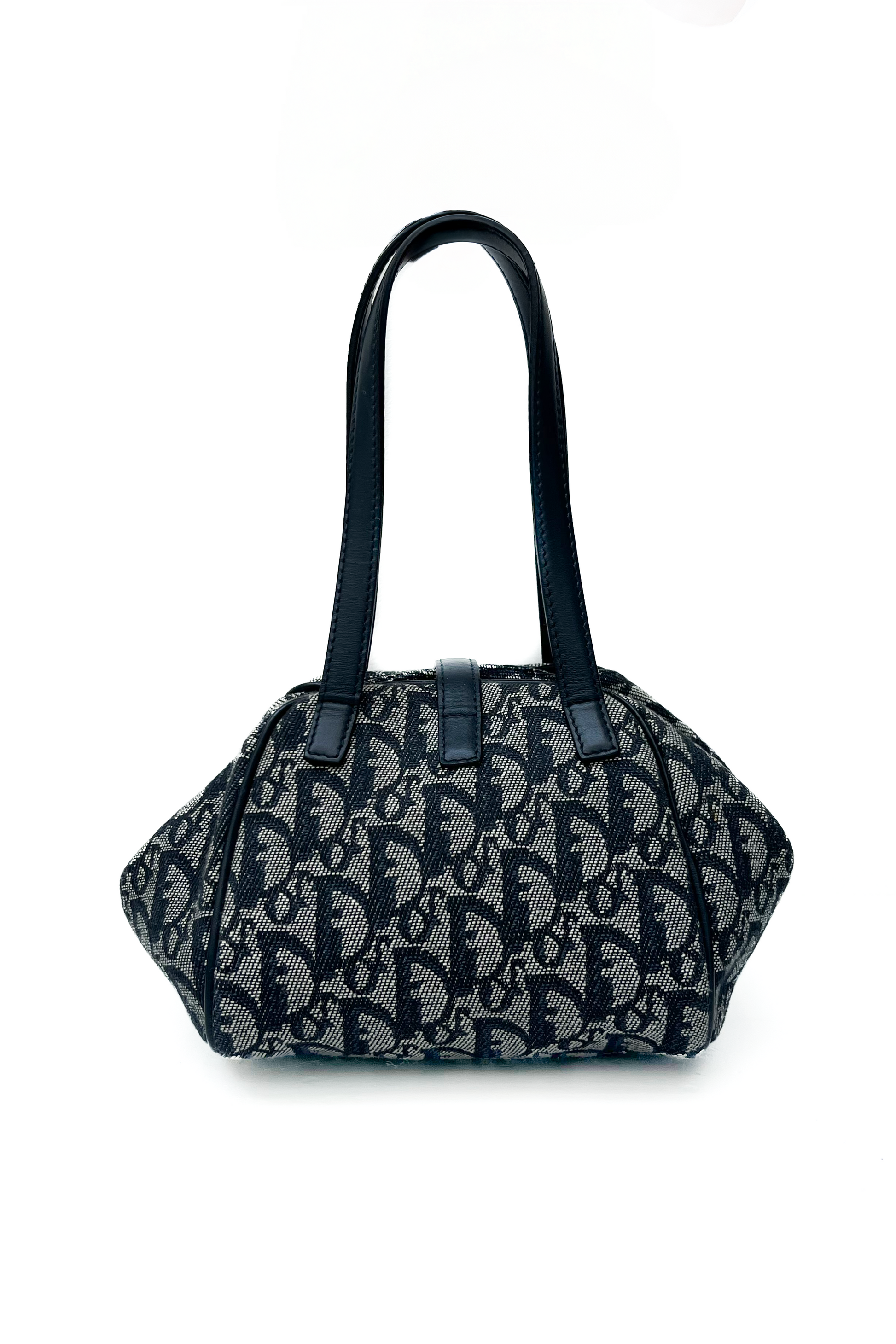 Classic Christian Dior navy monogram pouch bag. Features a golden D shaped charm and leather handles.