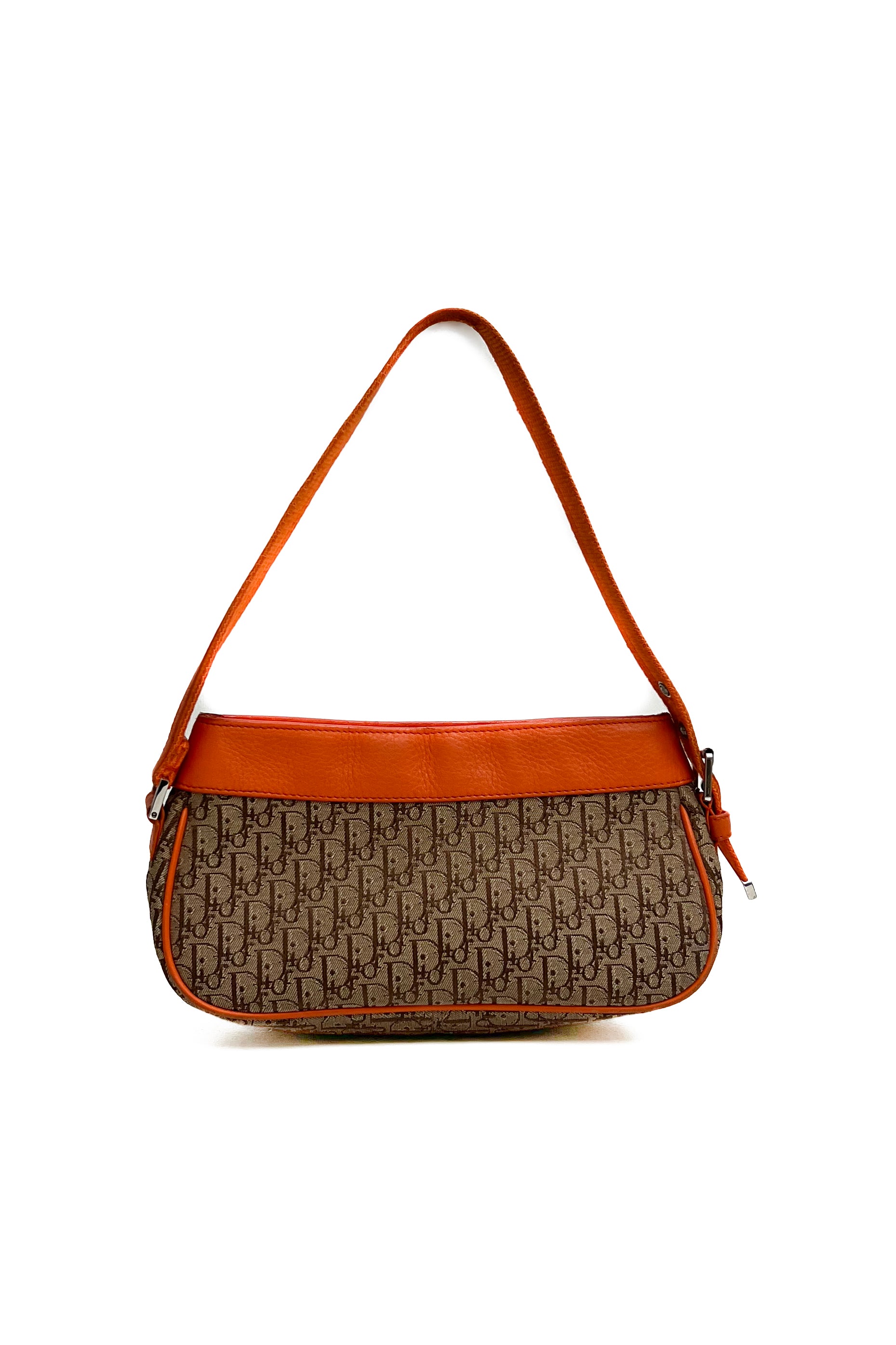This Christian Dior mini pochette comes in brown canvas with the Dior monogram print all over. It has leather details and an orange handle that is adjustable. A silver hardware detail on the front showcases the Dior logo.