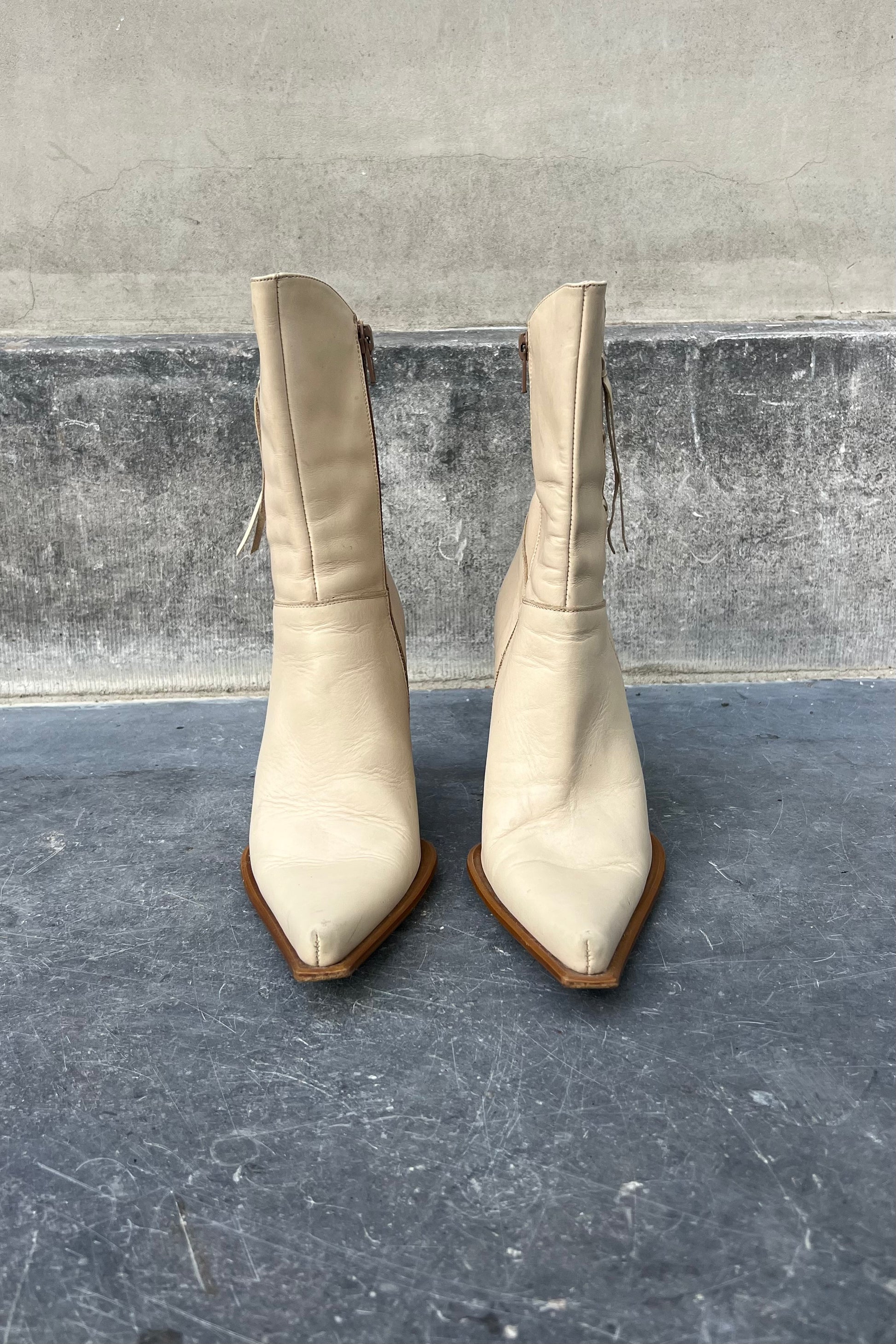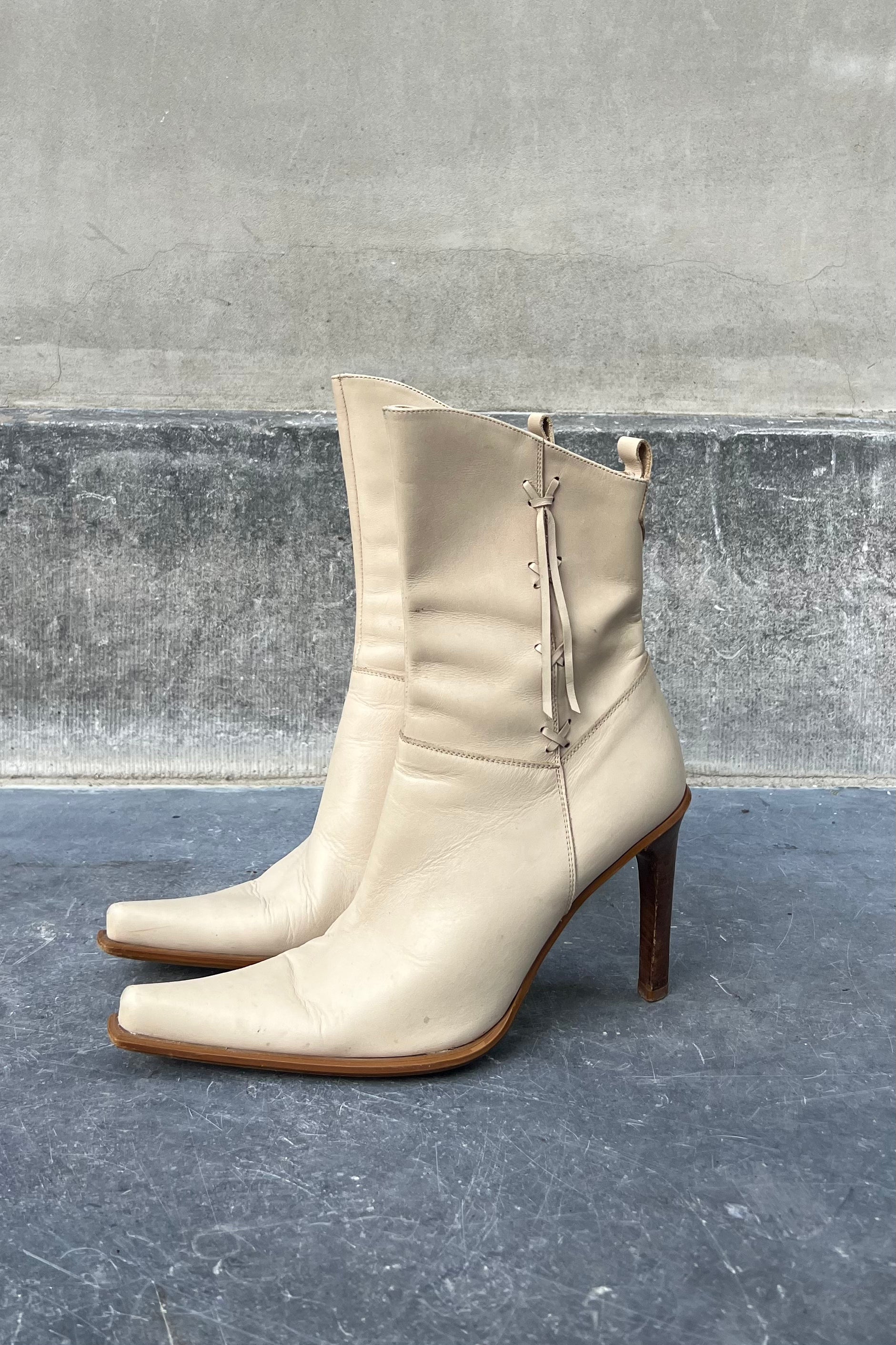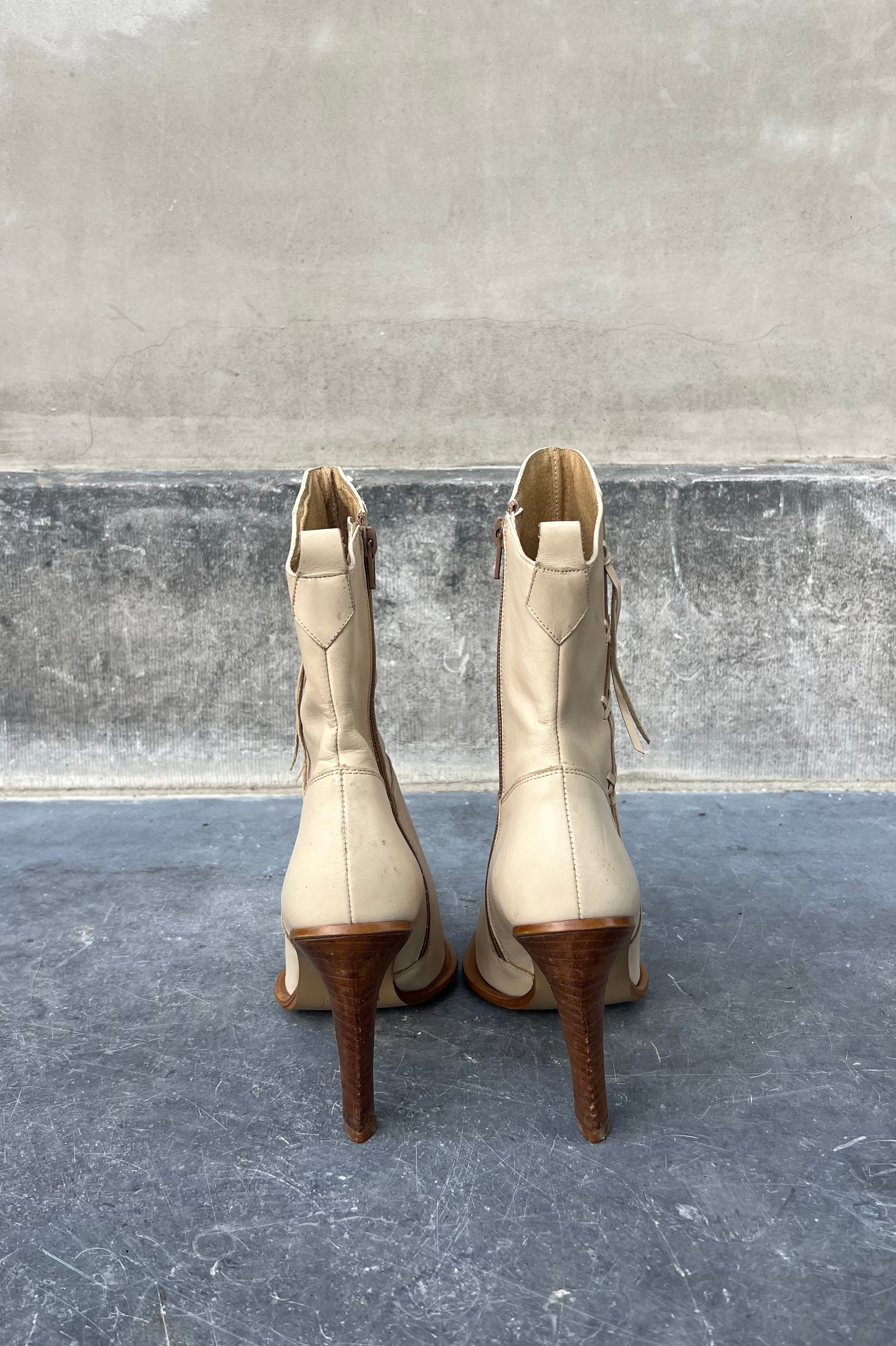 Vintage Fluxa boots made of smooth cream leather. They have beautiful wooden heels and decorative stitched details.