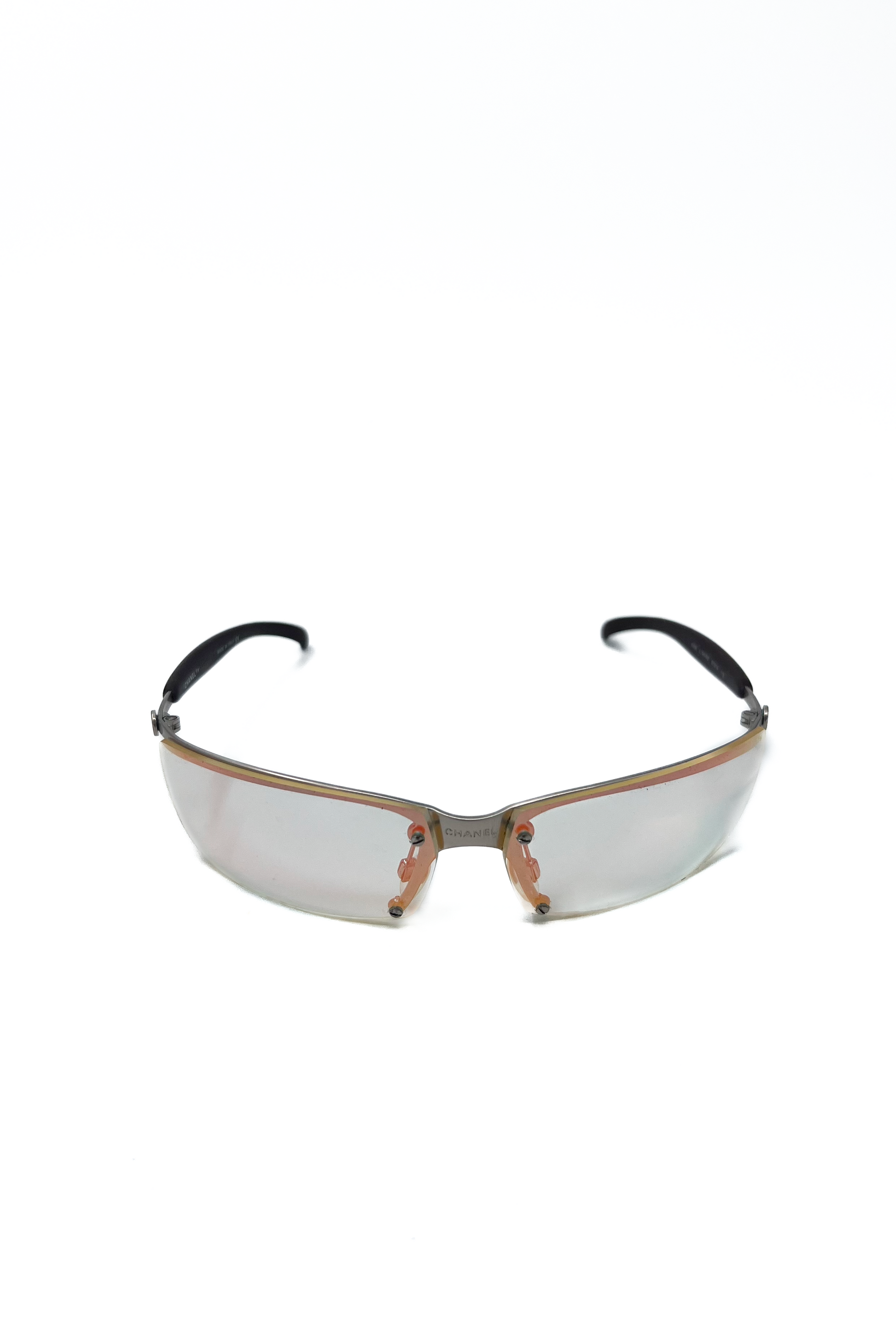 Iridescent transparent Chanel sunglasses with silver frame, finished with a signature Chanel logo at the bridge.