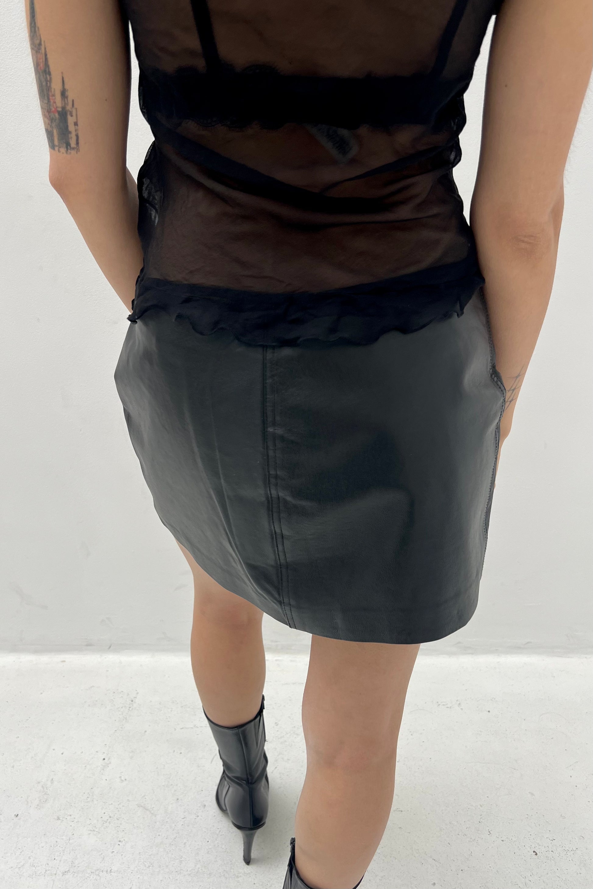 Vintage Phard black leather mini skirt. Features white 03 patch in the front.