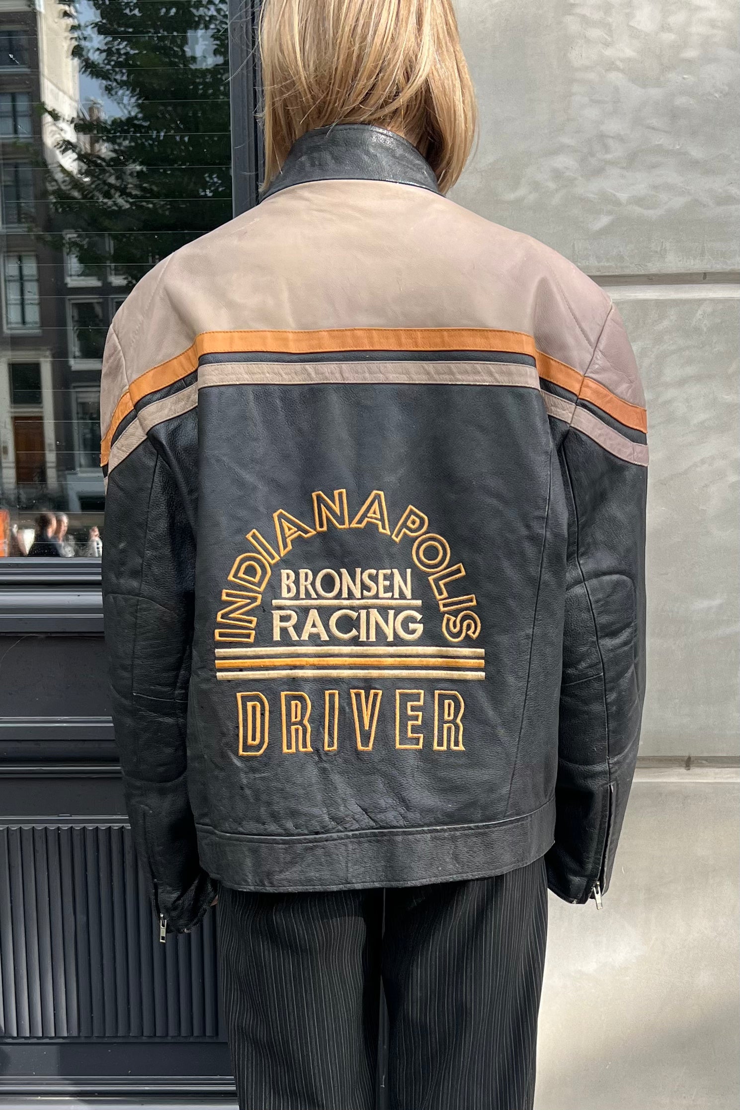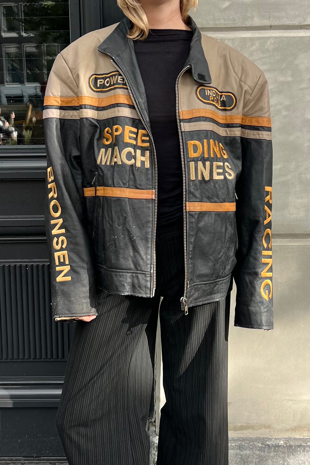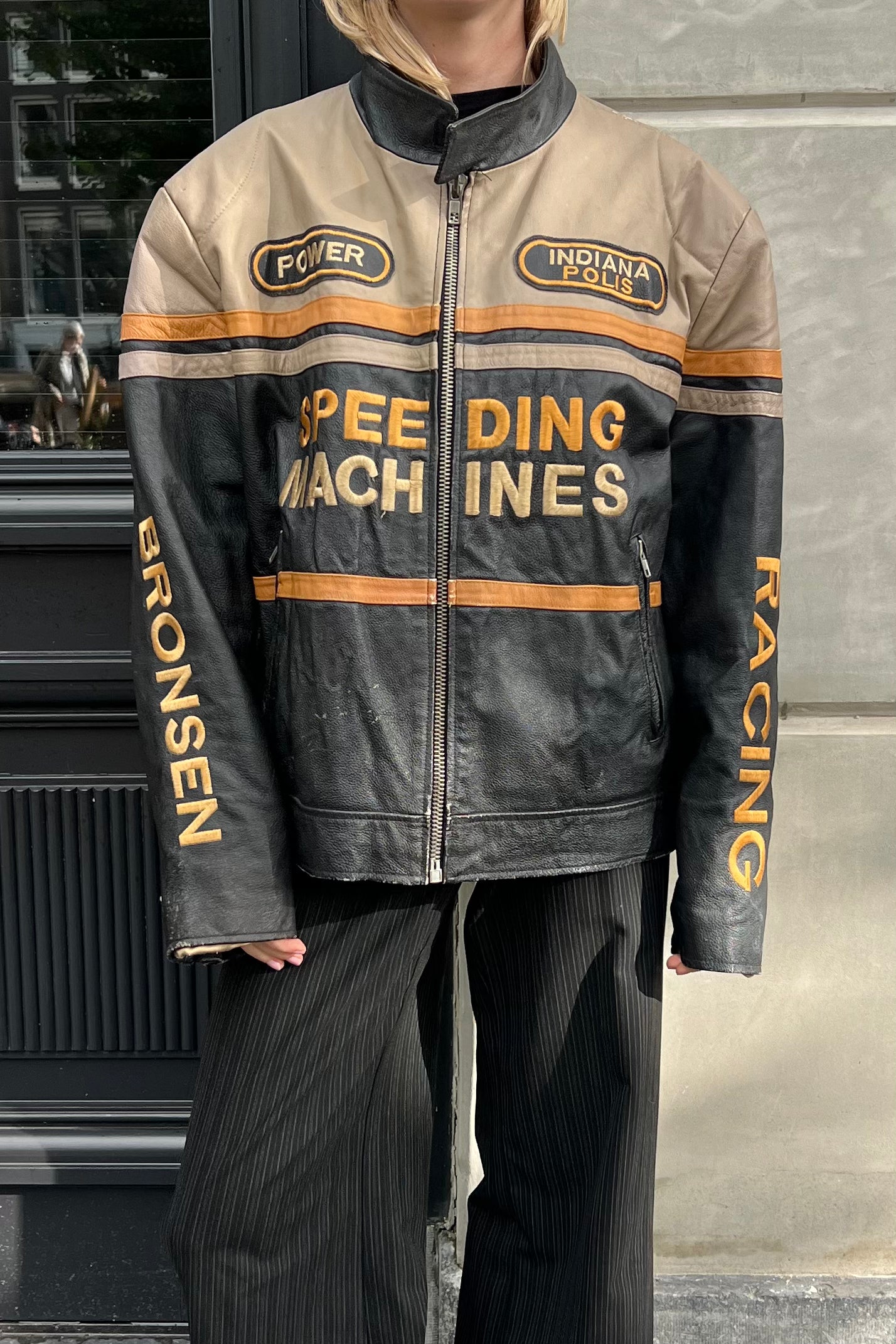 This iconic Indianapolis racing jacket comes in black, orange and beige. It includes embroidered patches like Power and Indianapolis. The front is dominated by the text "Speeding Machines". The sleeves feature "Bronsen" & "Racing". The back features a big logo, saying " Indianapolis Bronsen Racing Driver"
