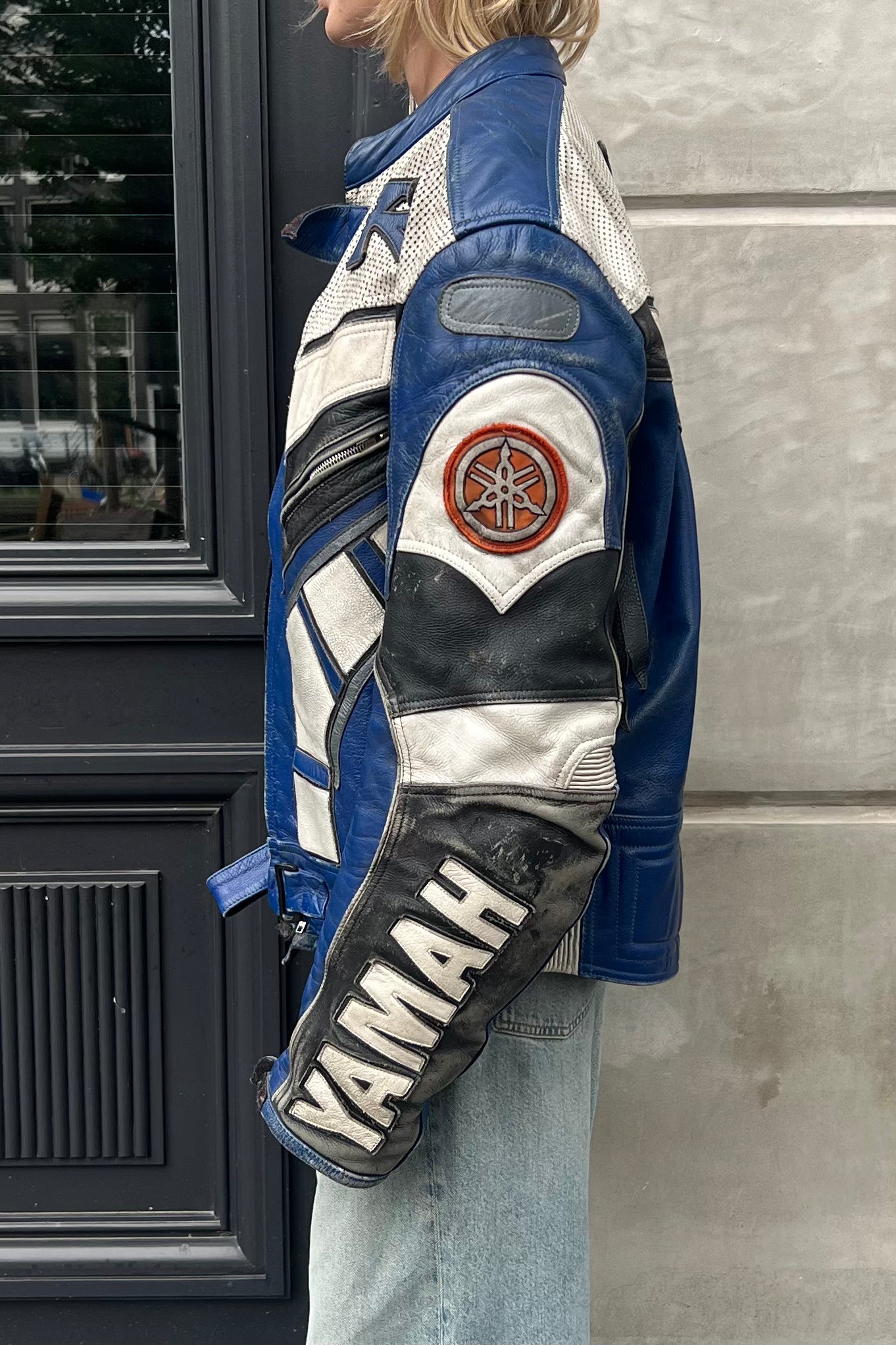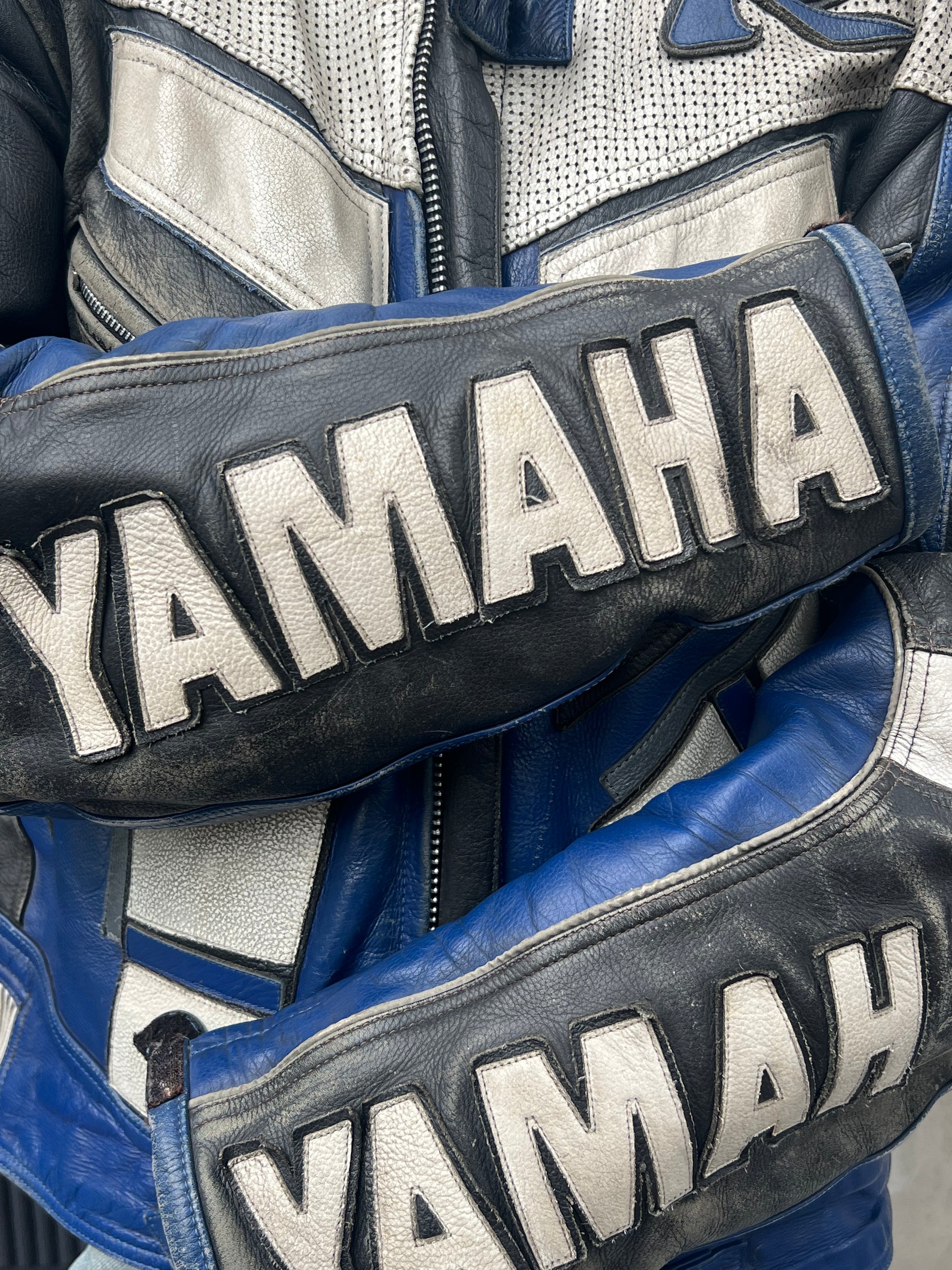 This bold Yamaha racing jacket comes in blue, black and white. It includes patches like R and Yamaha. Both sleeves are also branded with "Yamaha" in white.