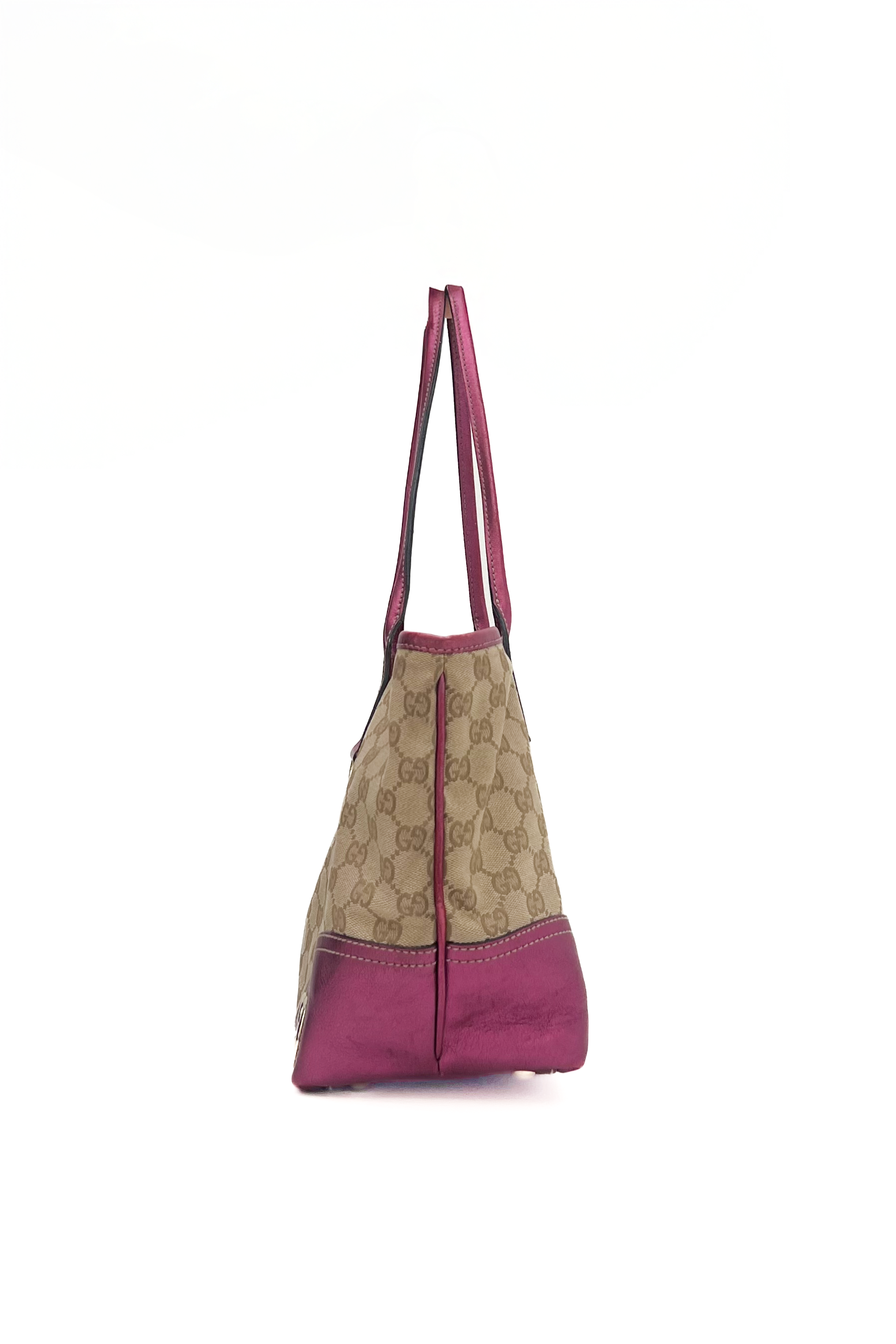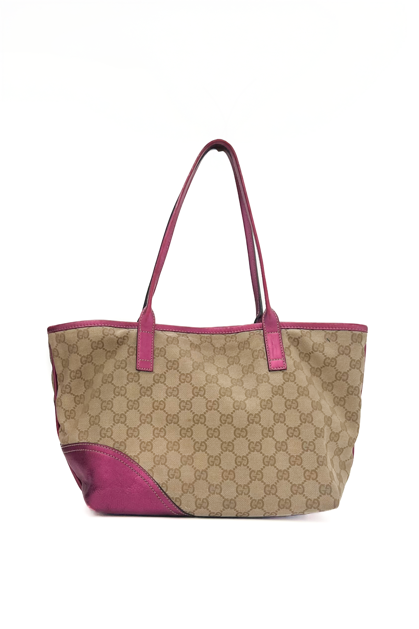 Gucci monogram shopper bag with all-over classic GG canvas, designed with pink metallic leather details and gold interlocking logo.