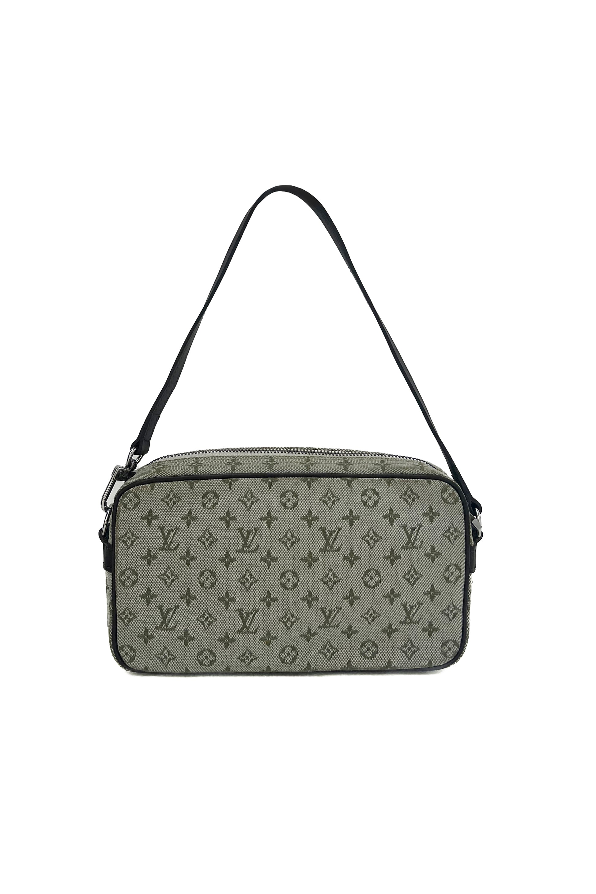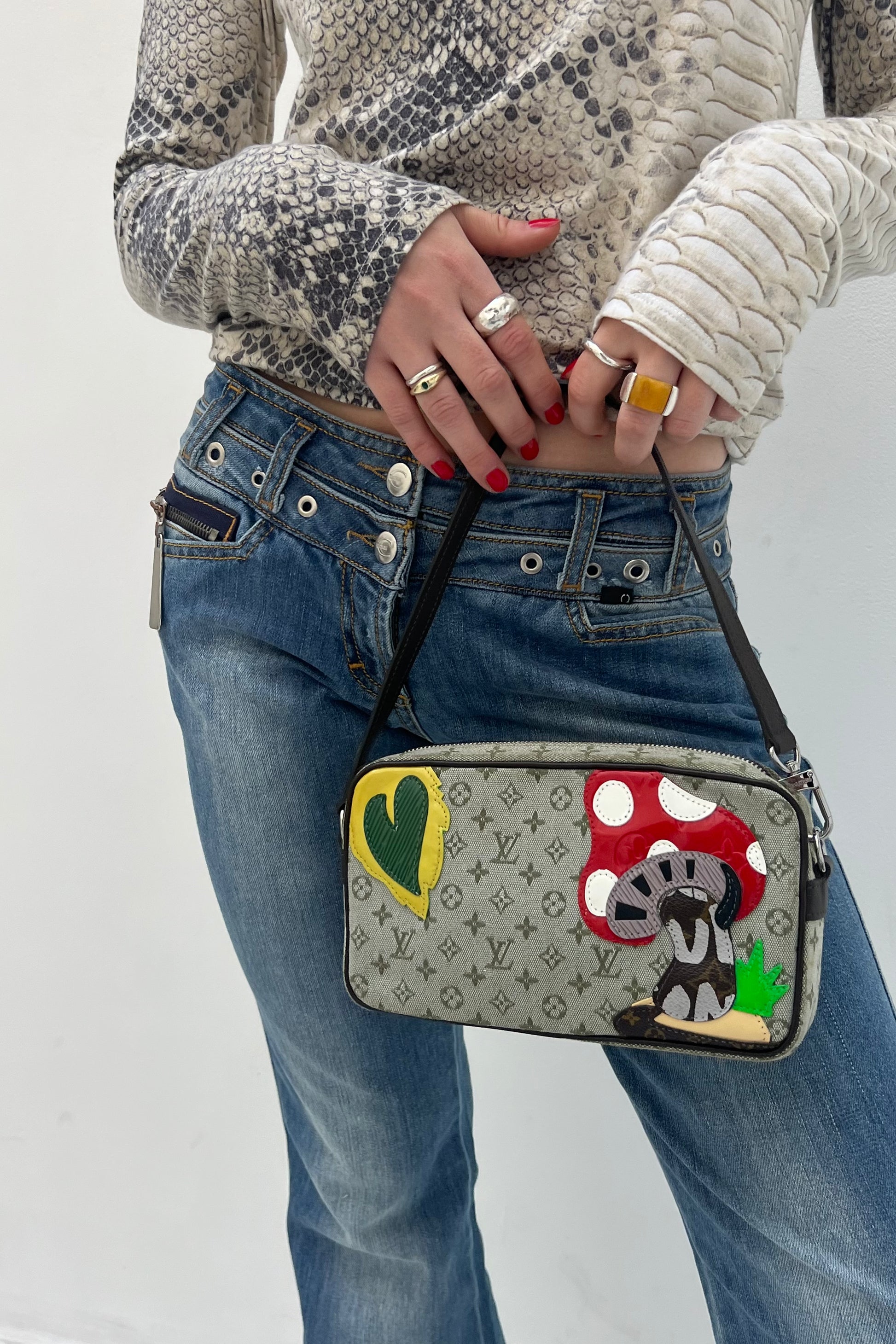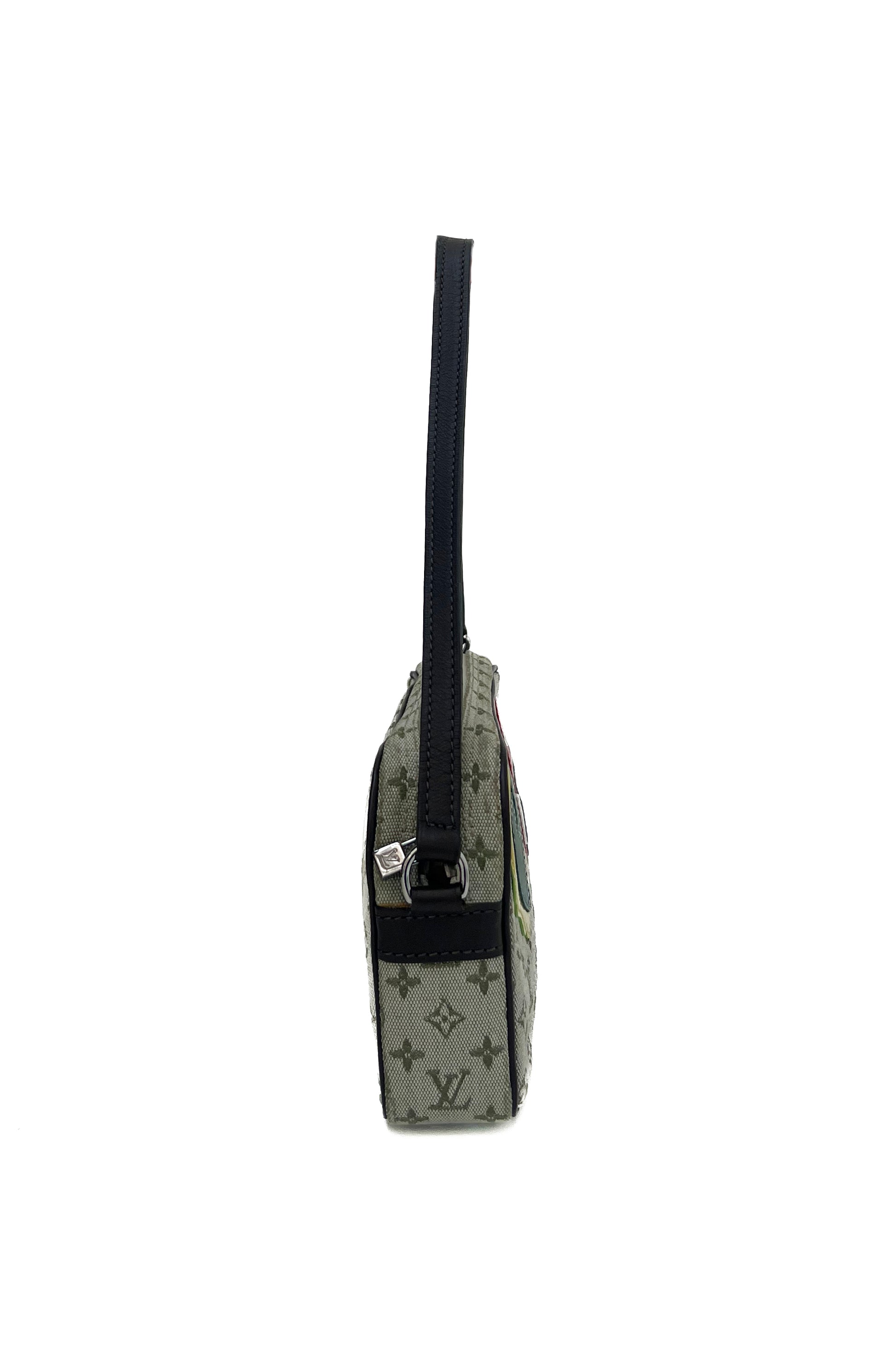 Cutest Louis Vuitton pochette. The bag comes in a green mini monogram canvas with mushroom and heart details. It has a black leather strap and silver hardware details. This bag comes from the 2002 Conte de Fees limited edition collection in collaboration with the illustrator Julie Verhoeven.