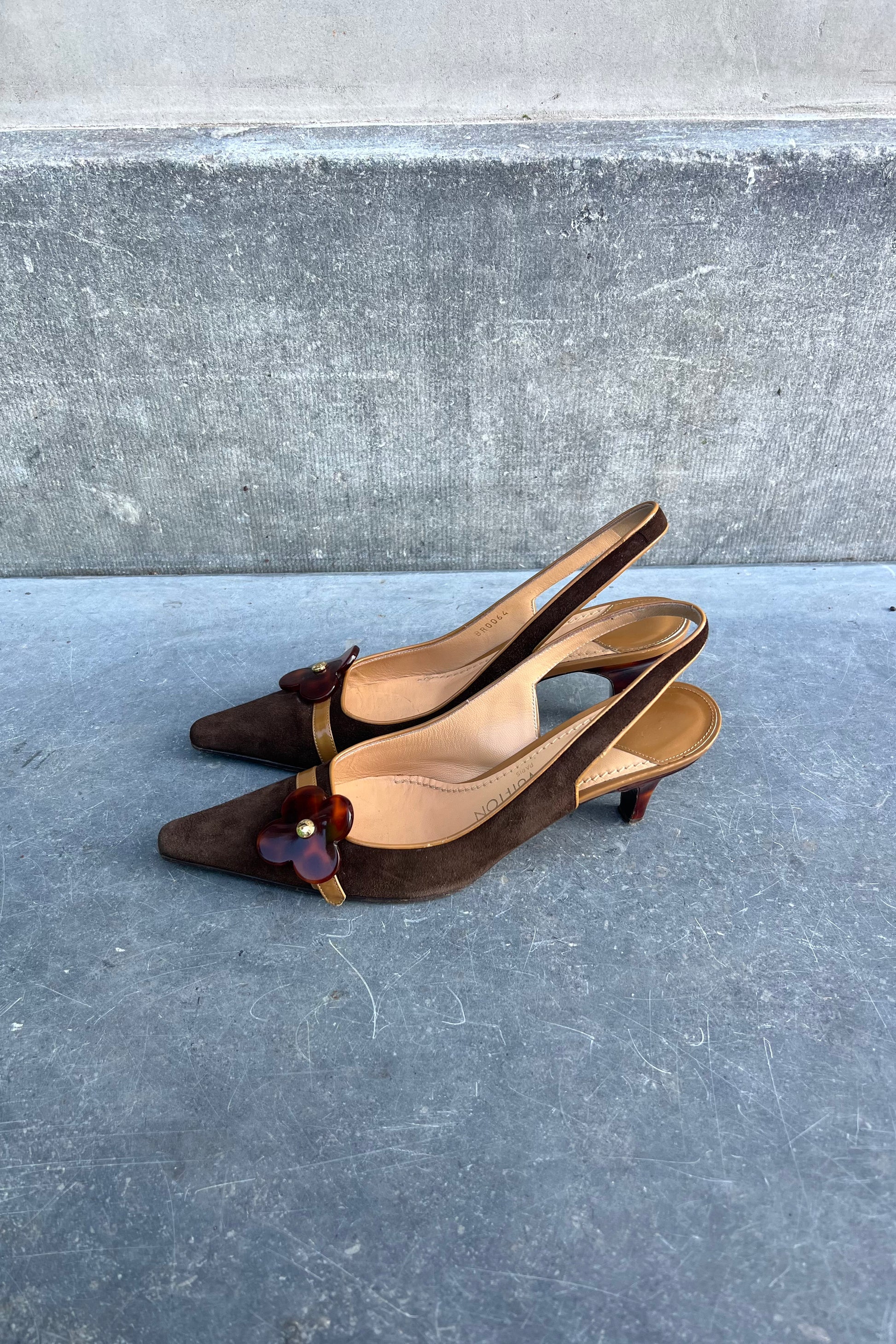 Vintage Louis Vuitton brown suede kitten heels. Featuring a tortoiseshell heel. Designed with a tortoiseshell flower set on a beige leather strap. The center of the flower is engraved with “Louis Vuitton.”