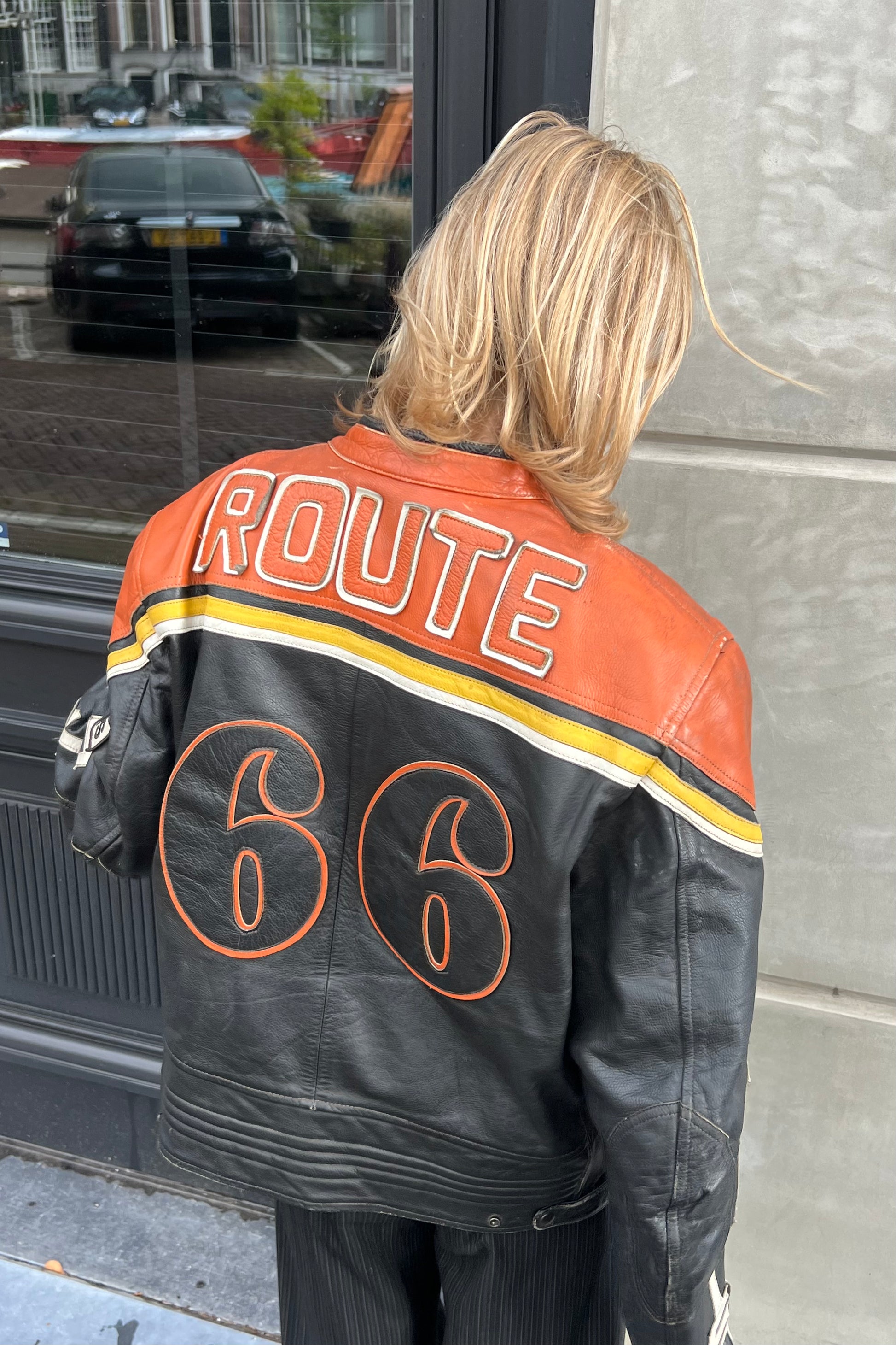 This iconic racing jacket comes in orange, black and white. It also has some yellow detailing. It includes embroidered racing patches like Arai, Arrow, and Alpine. The front features "California". The back is dominated by the number "66" and "Route".