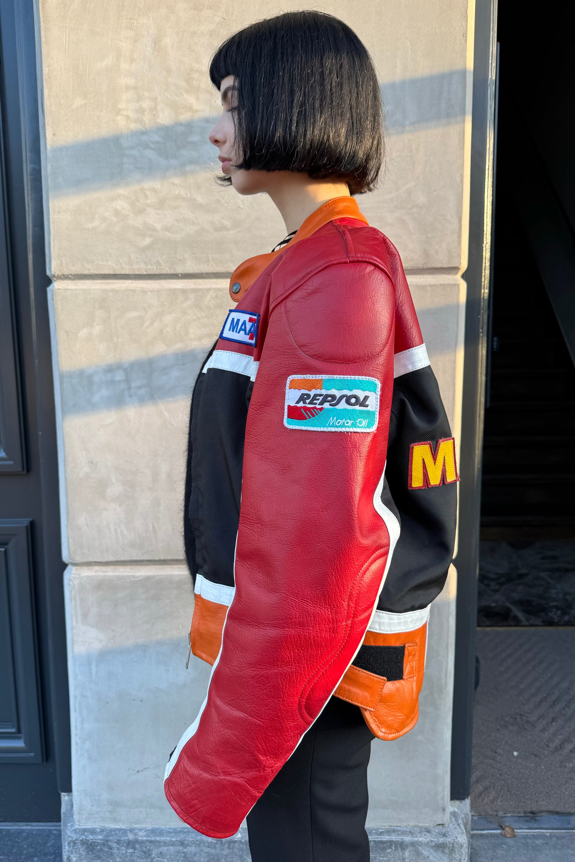 This bold Repsol racing jacket comes in red and orange leather mixed with black fabric. It includes patches like 'MAAKSON' on the back but also embroider patches on the back & sleeves.