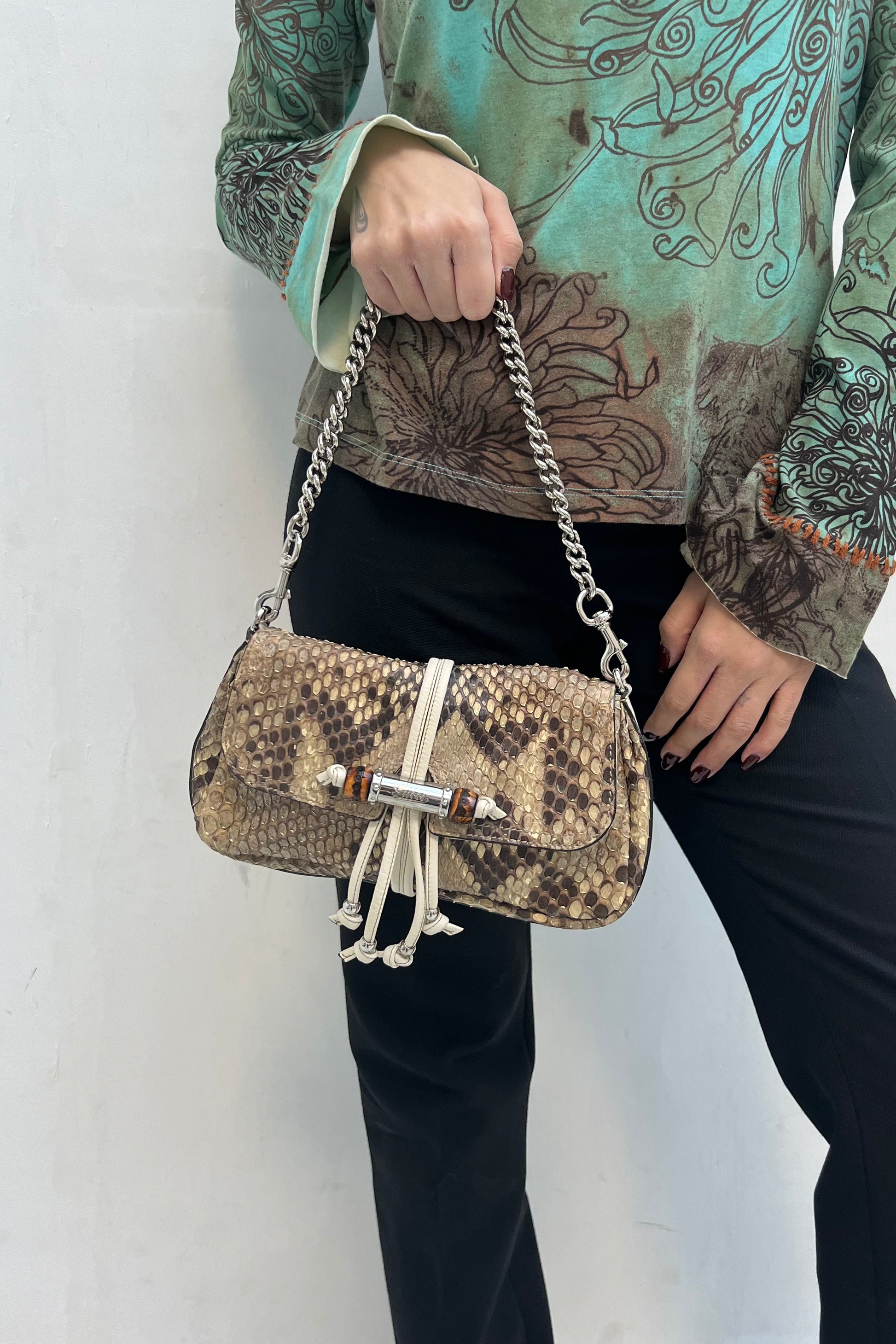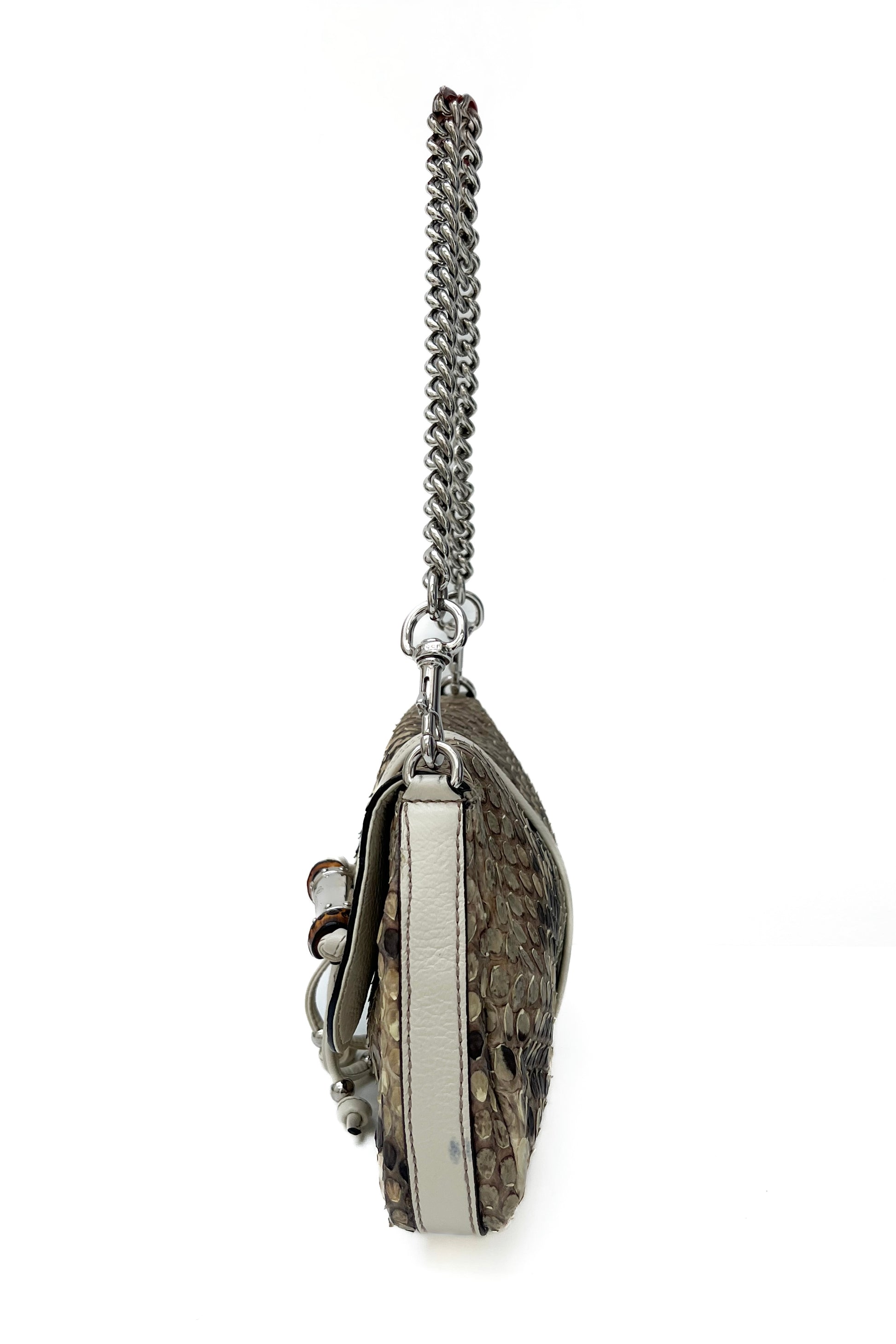 Beautiful vintage python leather Gucci pochette. Has a silver chain handle and a cute little bamboo detail in the front.