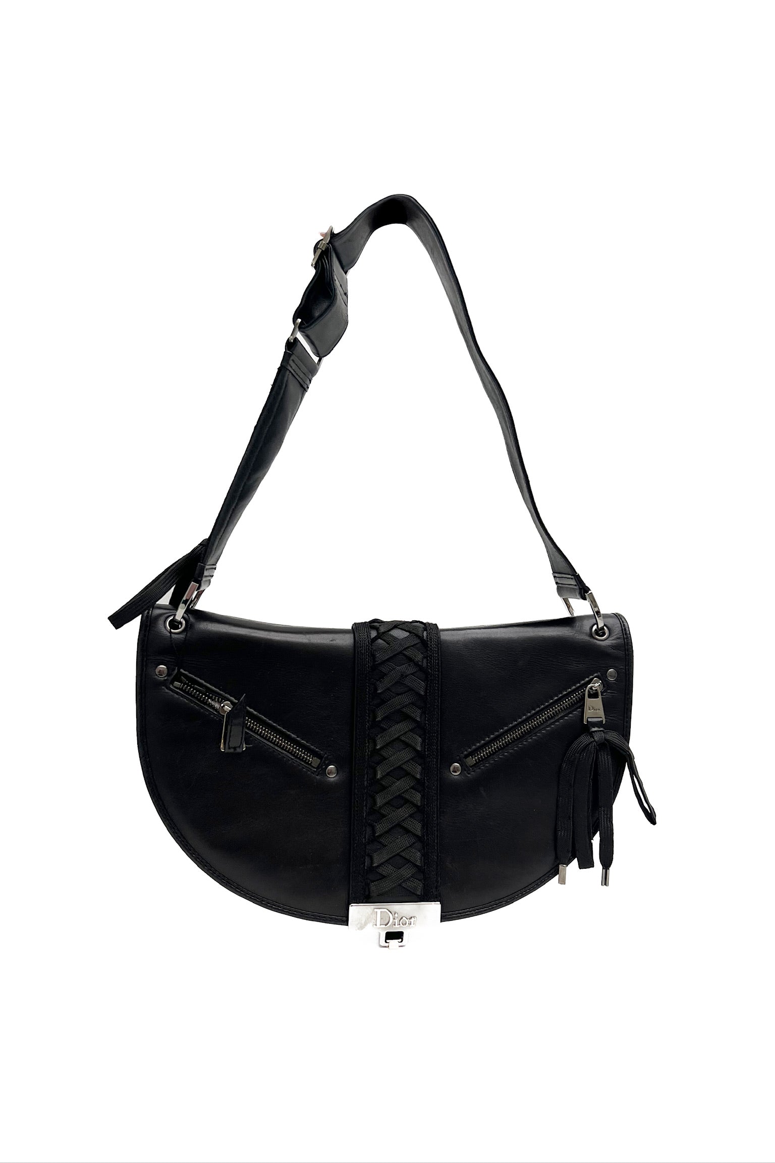 Beautiful vintage Christian Dior leather shoulder bag with corset-style details and two front pockets. Finished with silver hardware.