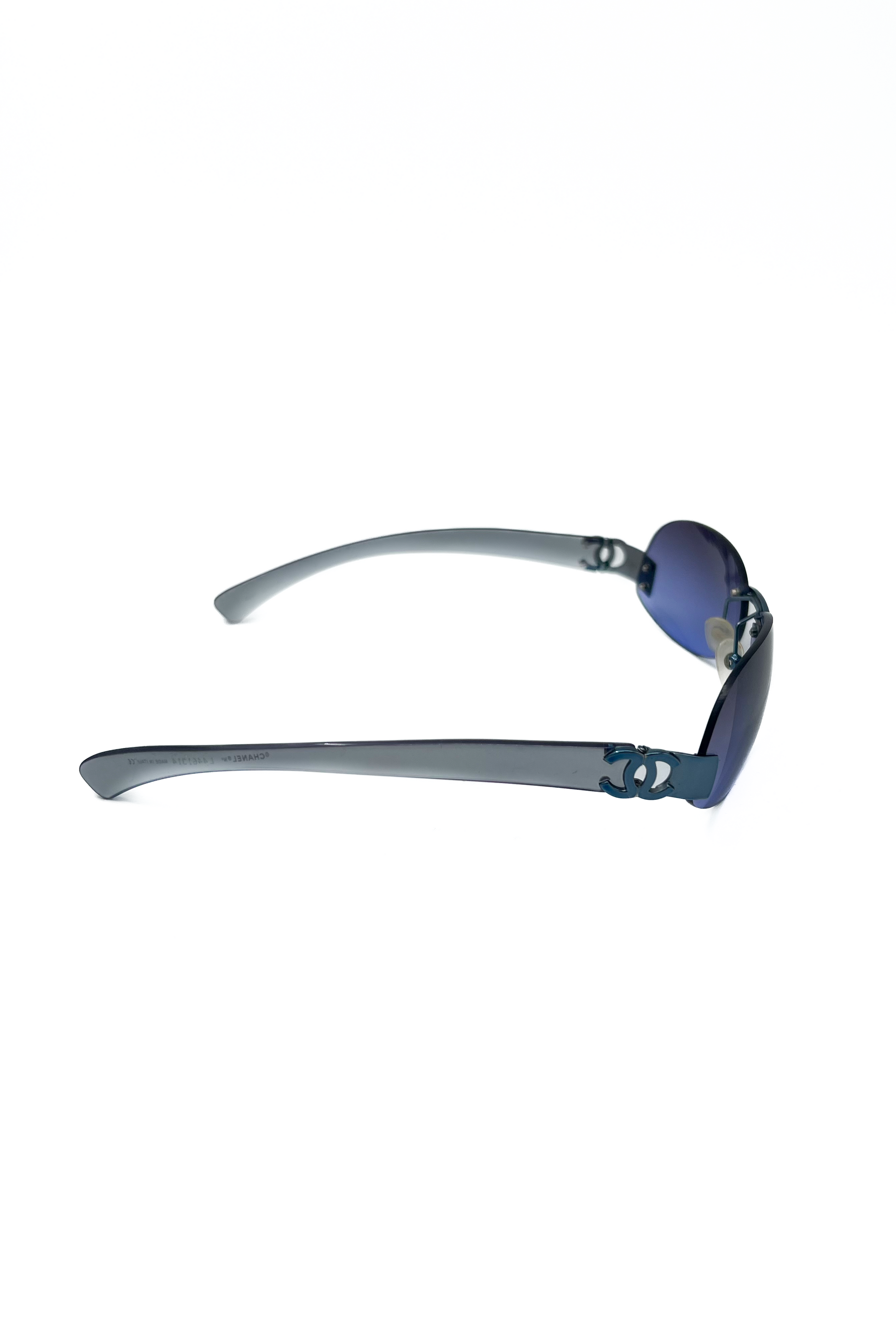Chanel rimless sunglasses with purple transparant oval lenses and a sleek CC logo detail.