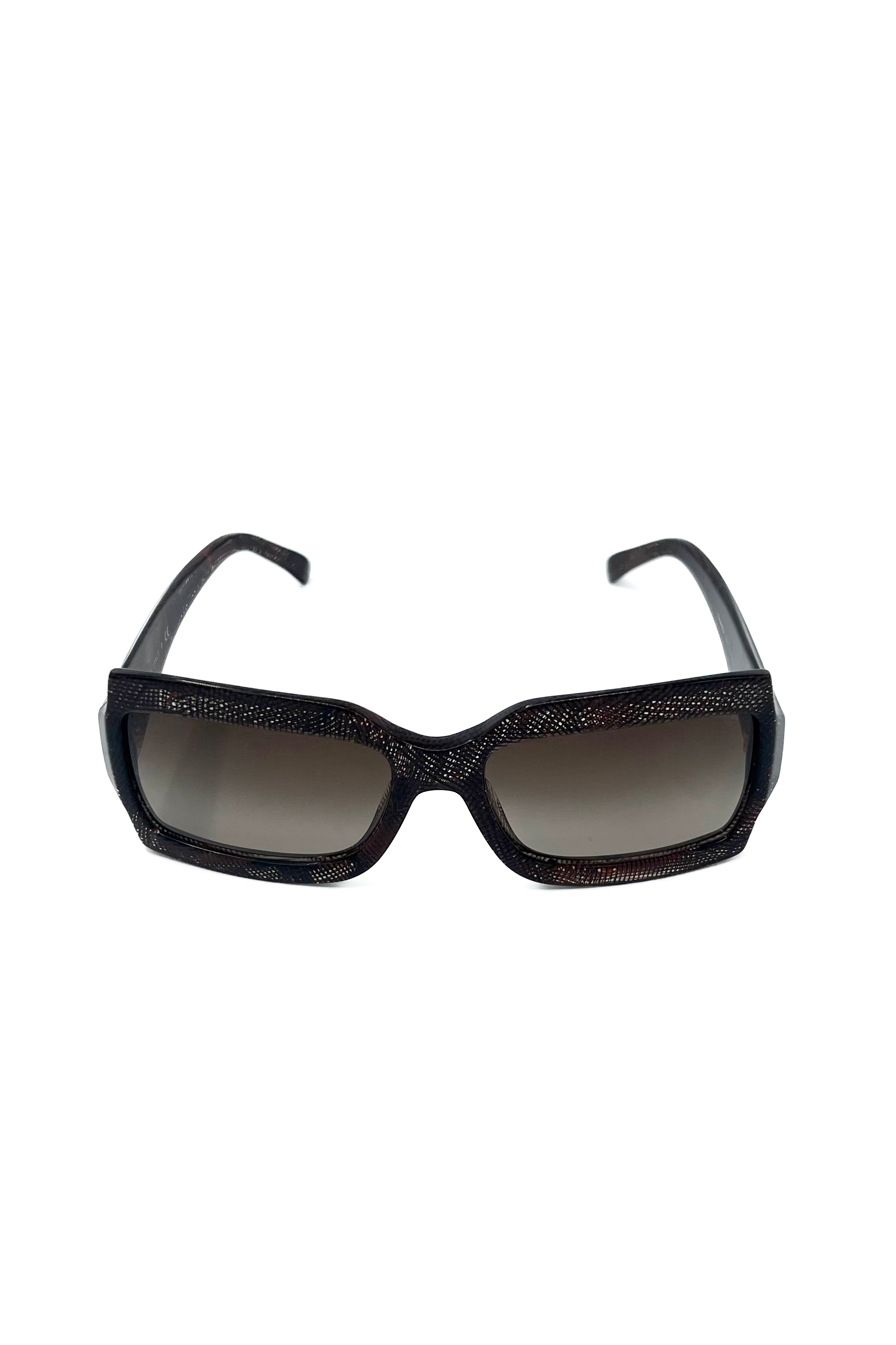 Chanel sunglasses with chocolate brown squared lenses. Designed with a lace print and a sleek CC logo detail.