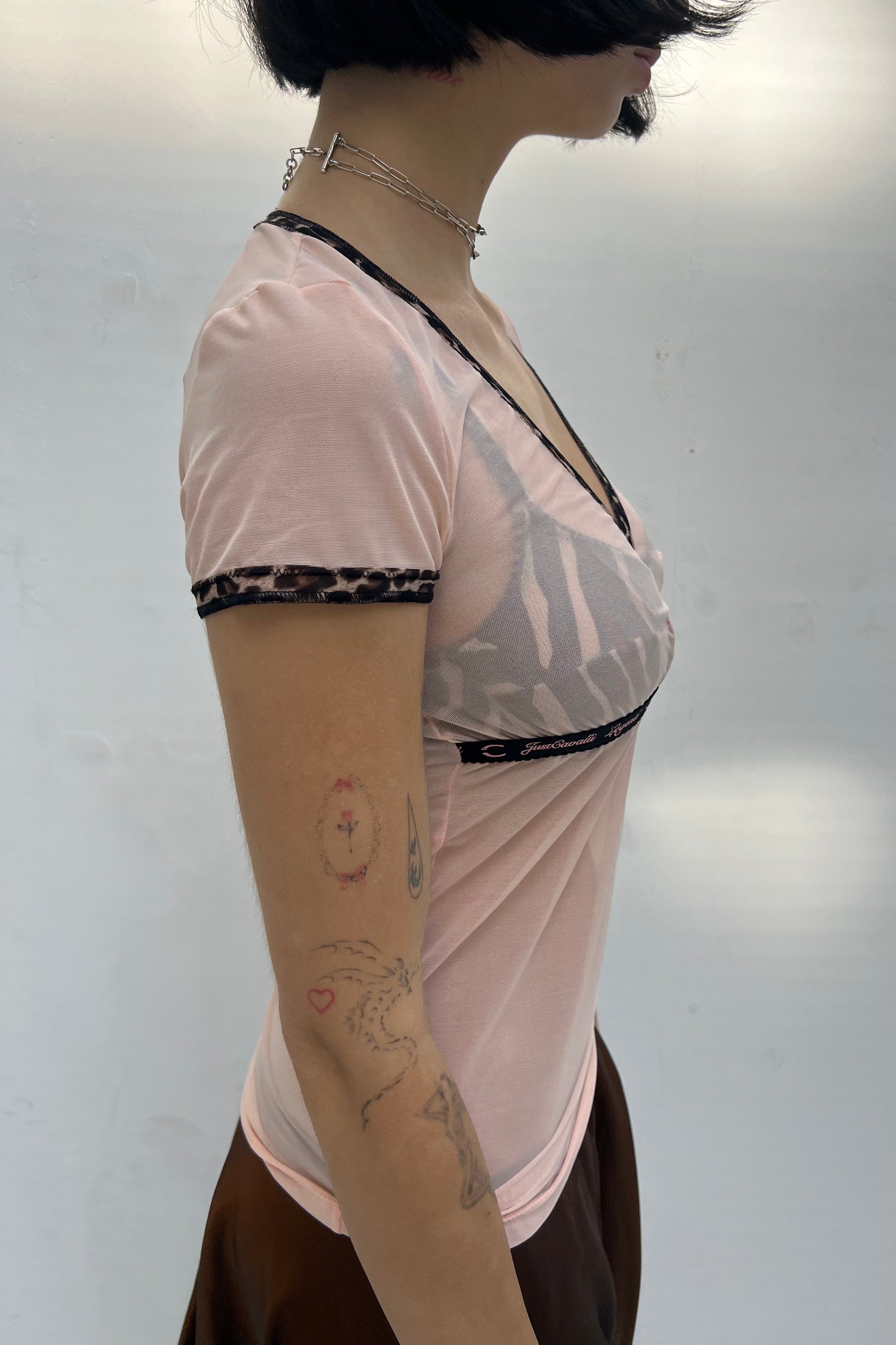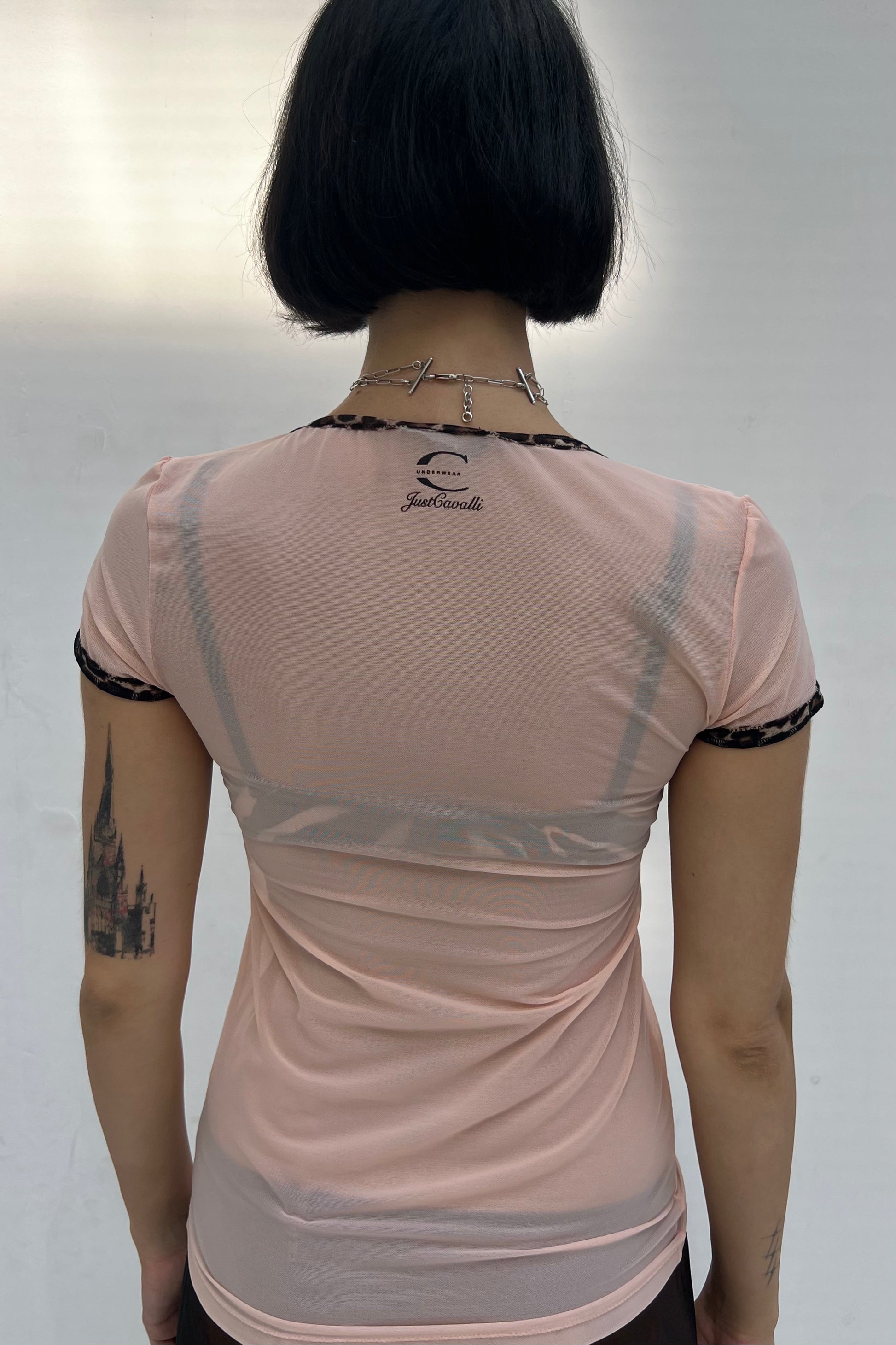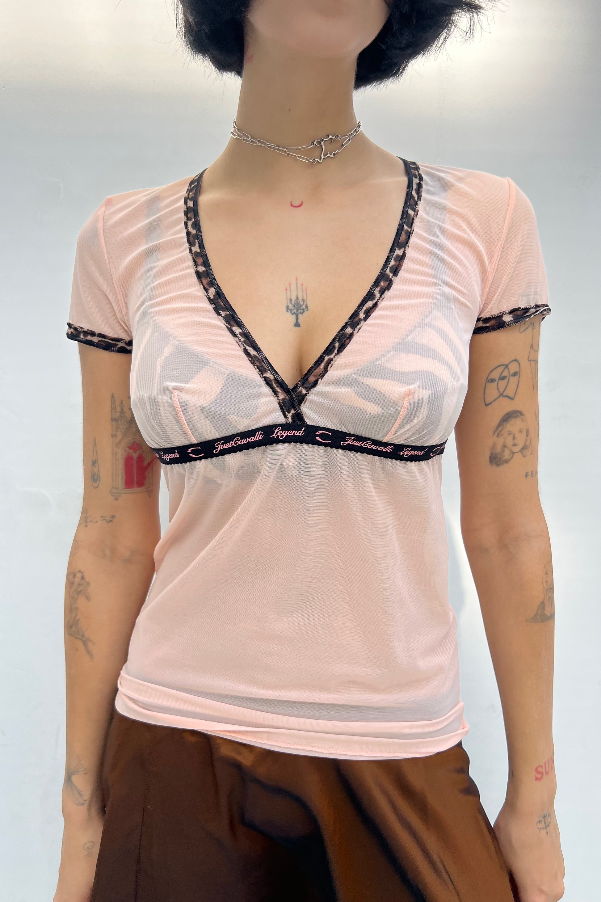 Vintage Just Cavalli short sleeved mesh tee with a V-neck and logo underbust. The top has beautiful leo print finish around the neckline and sleeves.
