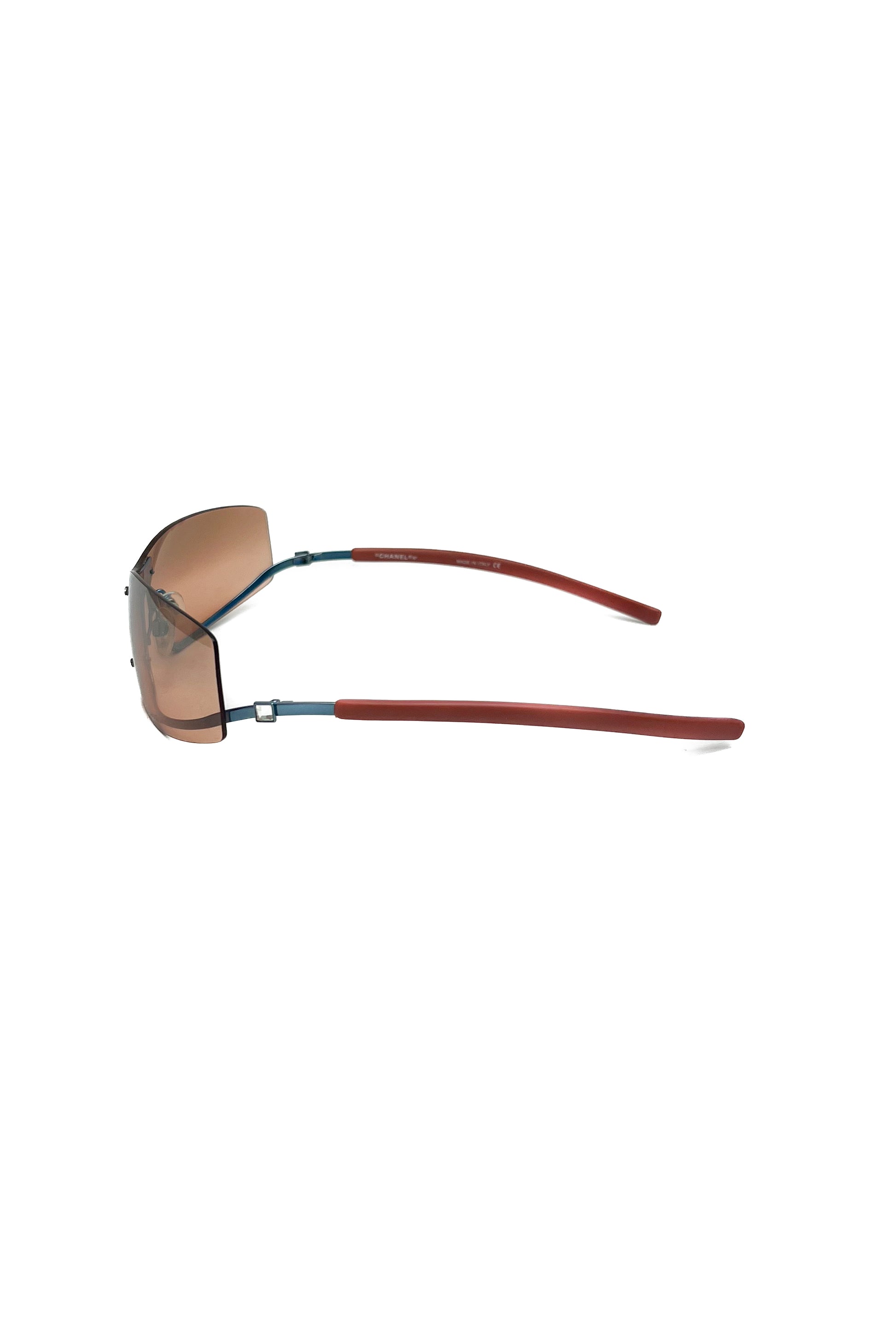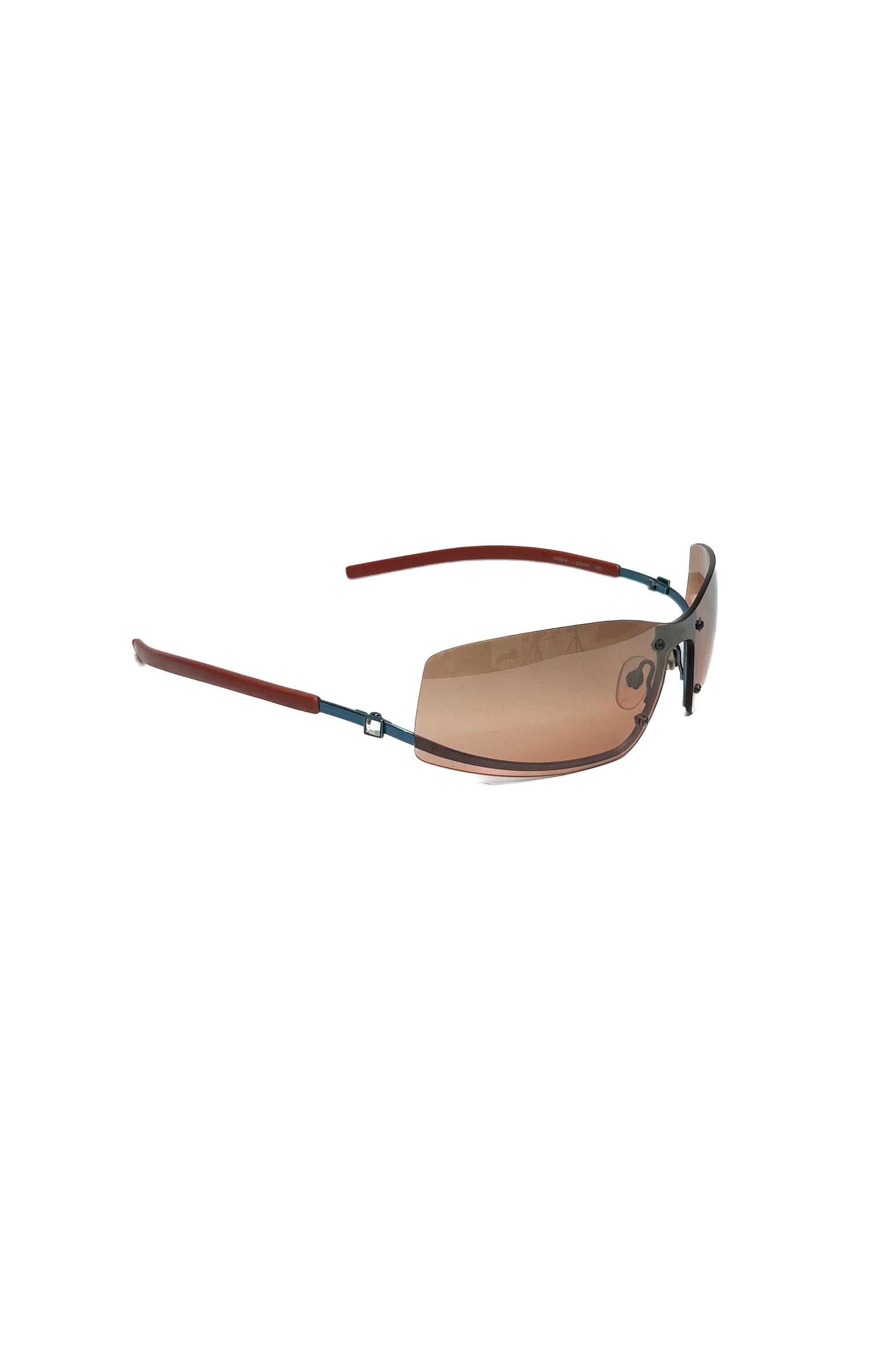 Vintage Chanel rimless sunglasses with orange gradient lens and silver stones on the sides.