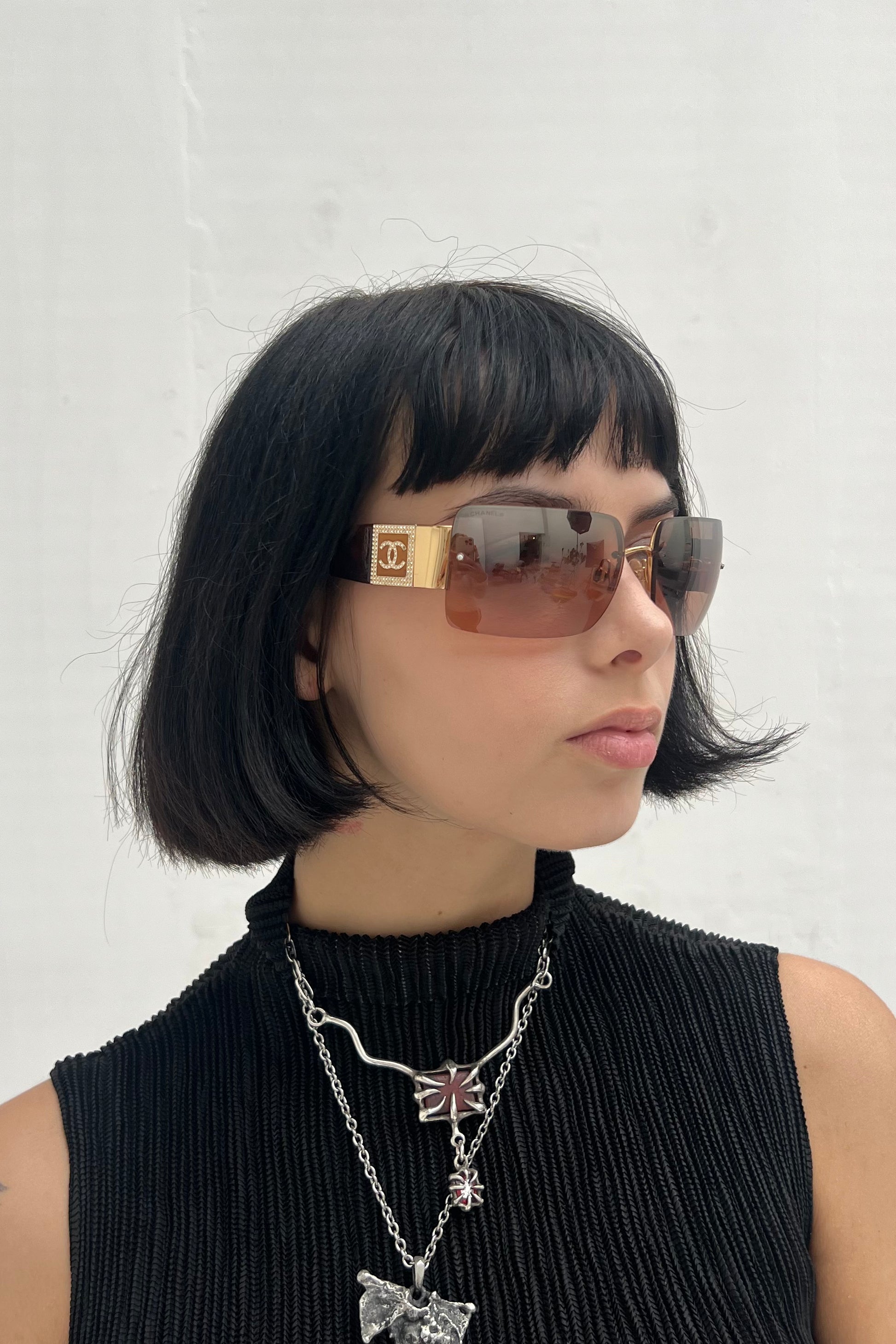 Chanel Rimless sunglasses with tortoise arms and CC logo's embossed with swarovski stones.
