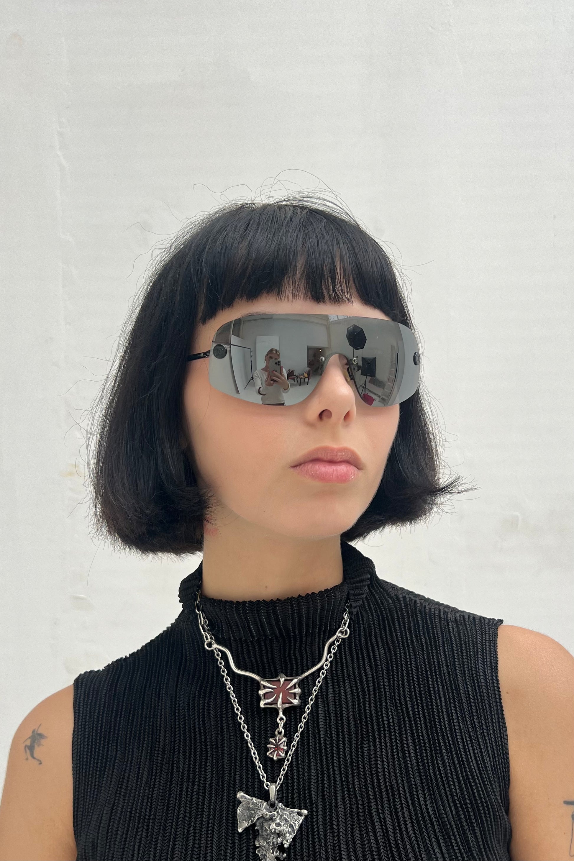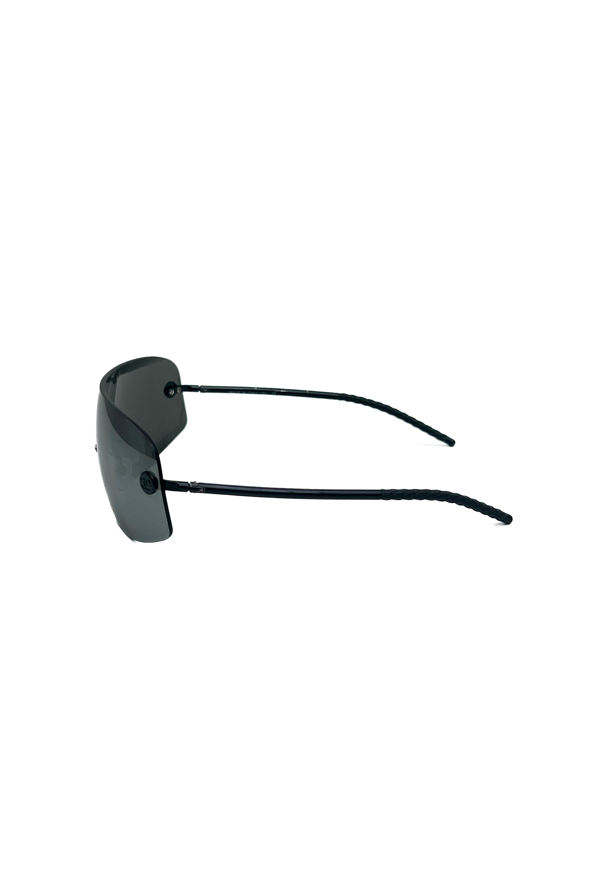 Chanel Rimless Black mask sunglasses with black CC logo detail on the sides and black arms.