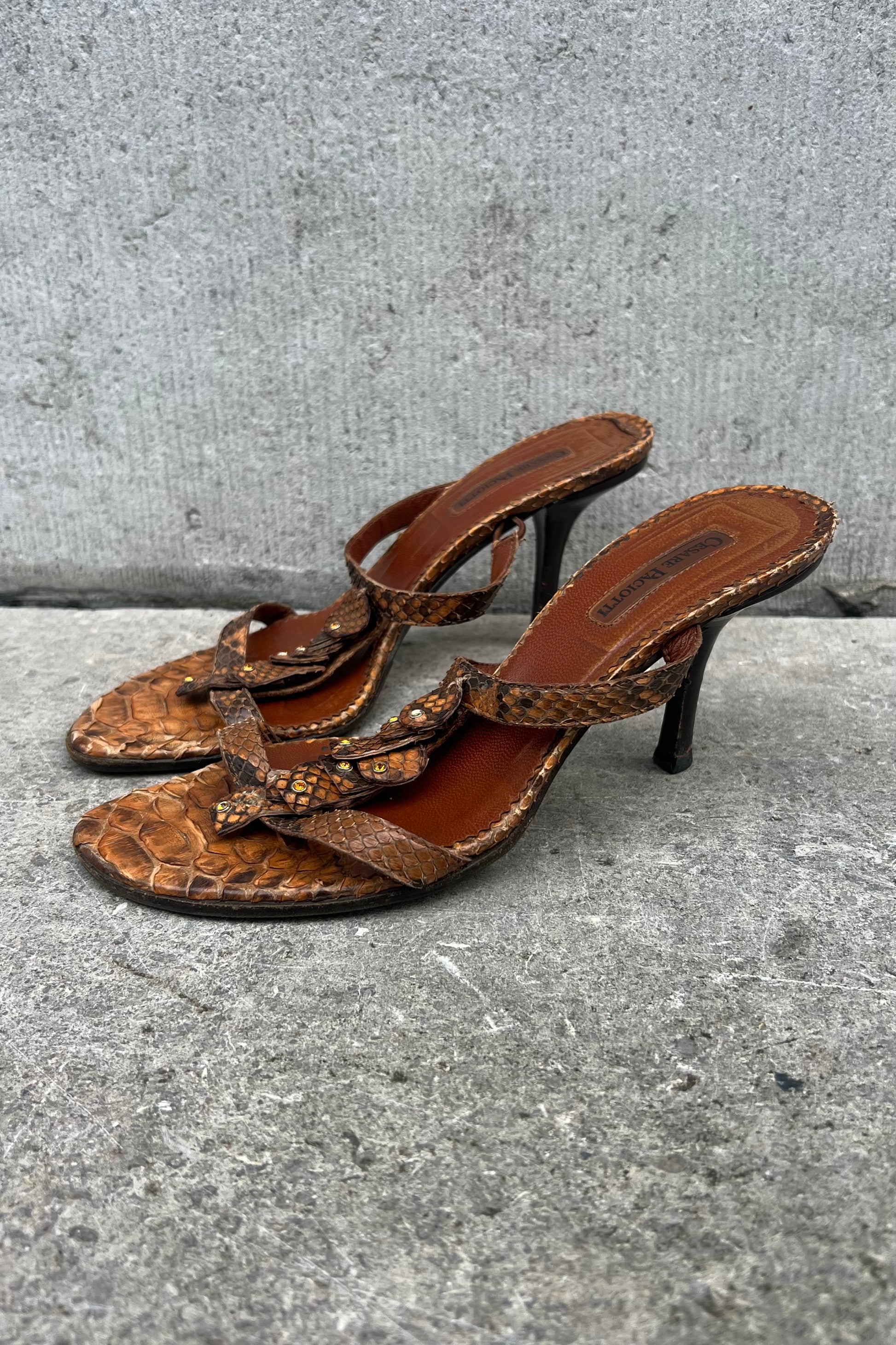 Vintage Cesare Paciotti Heels with beautiful python leather fringes & little orange strass stone details.