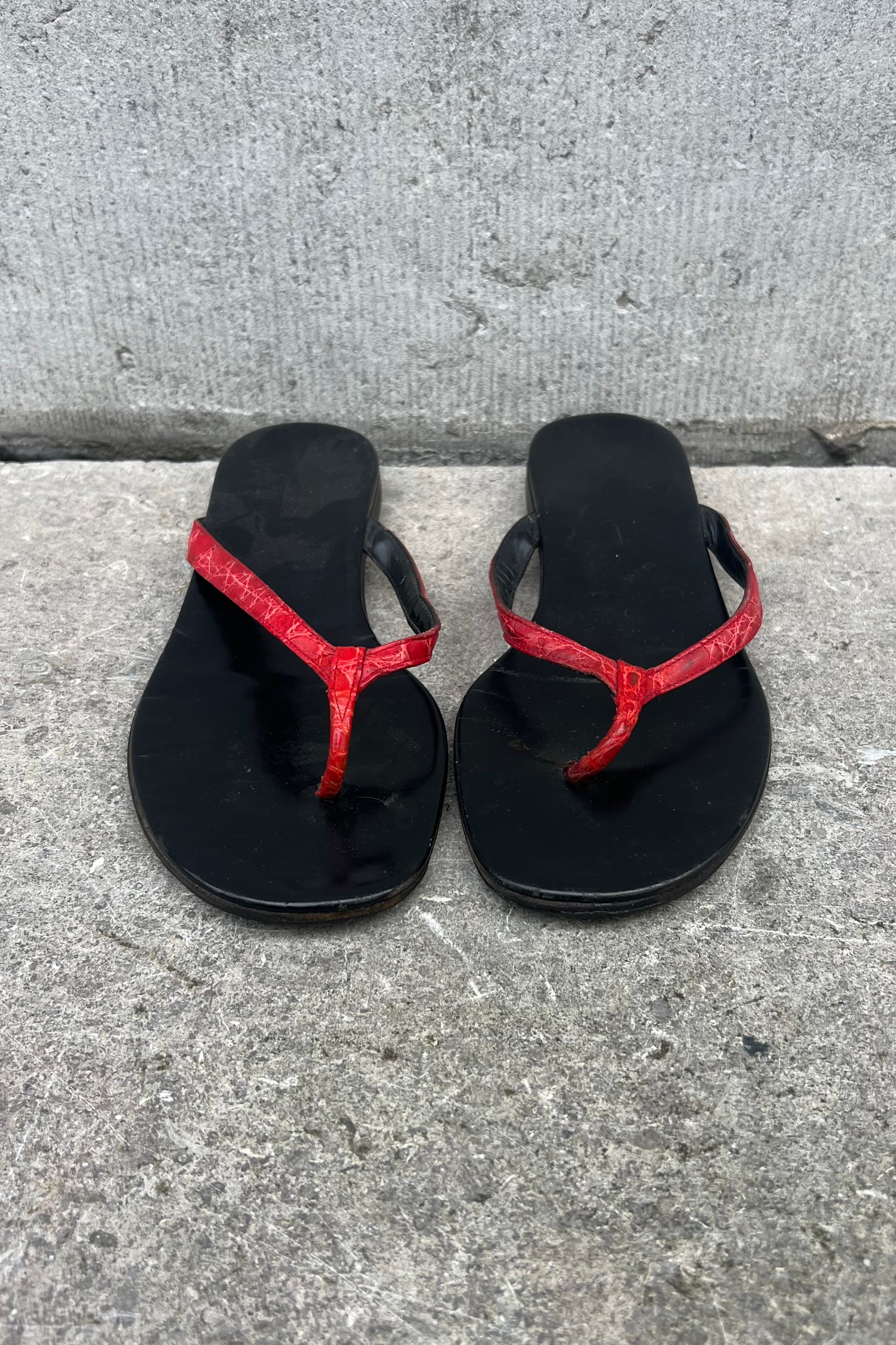 Vintage Gucci thong sandals featuring red croco leather thong strap.