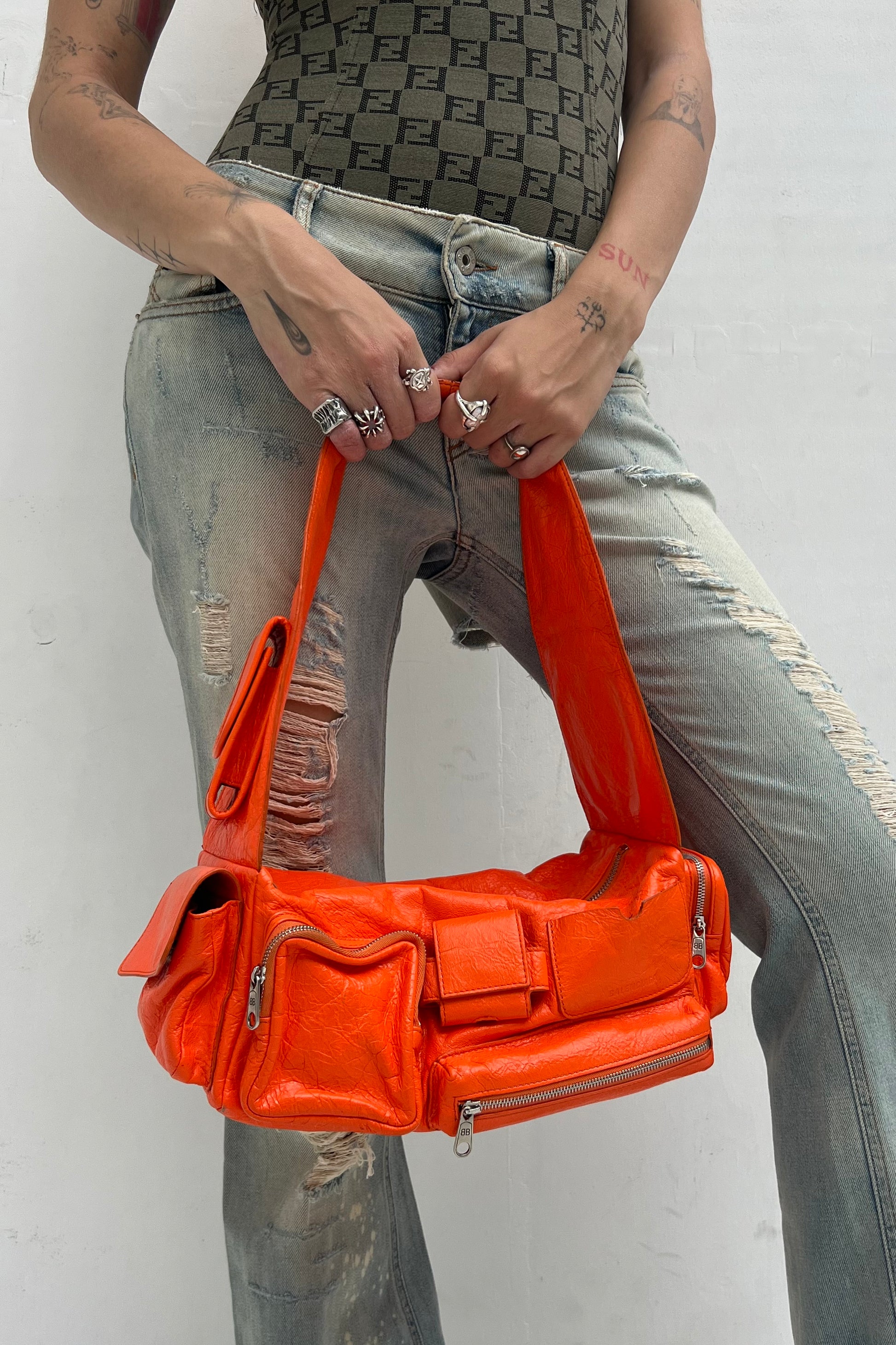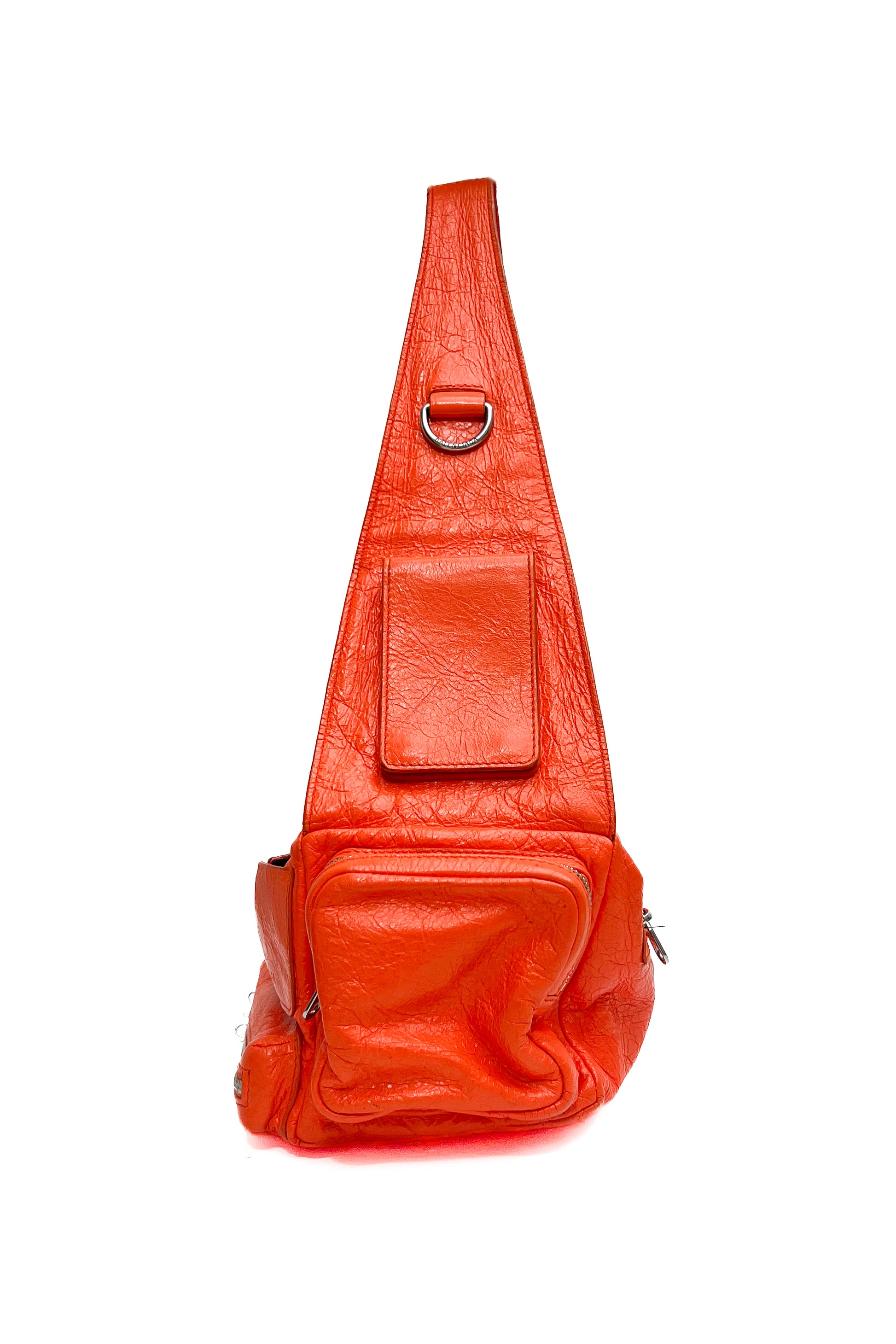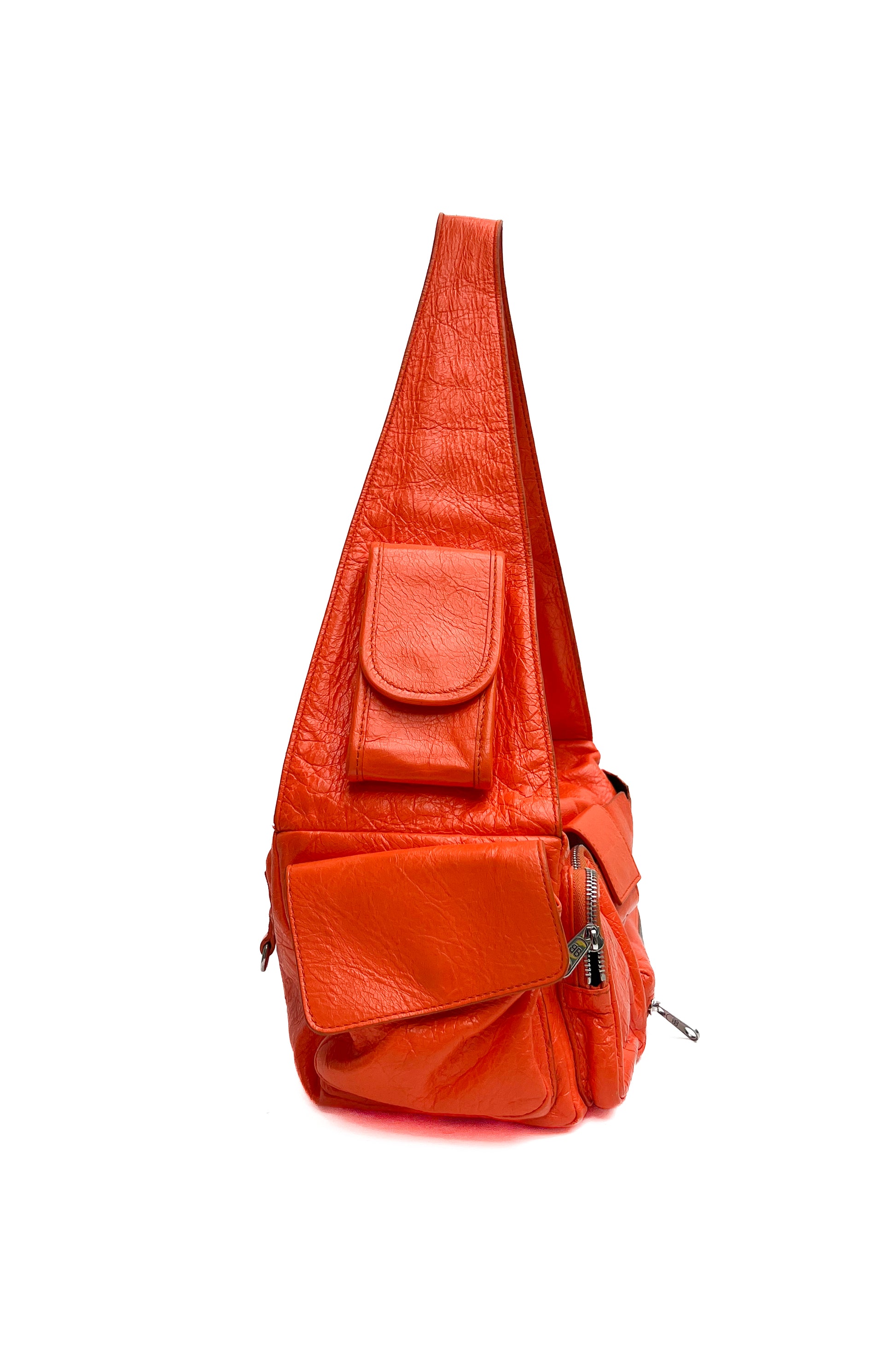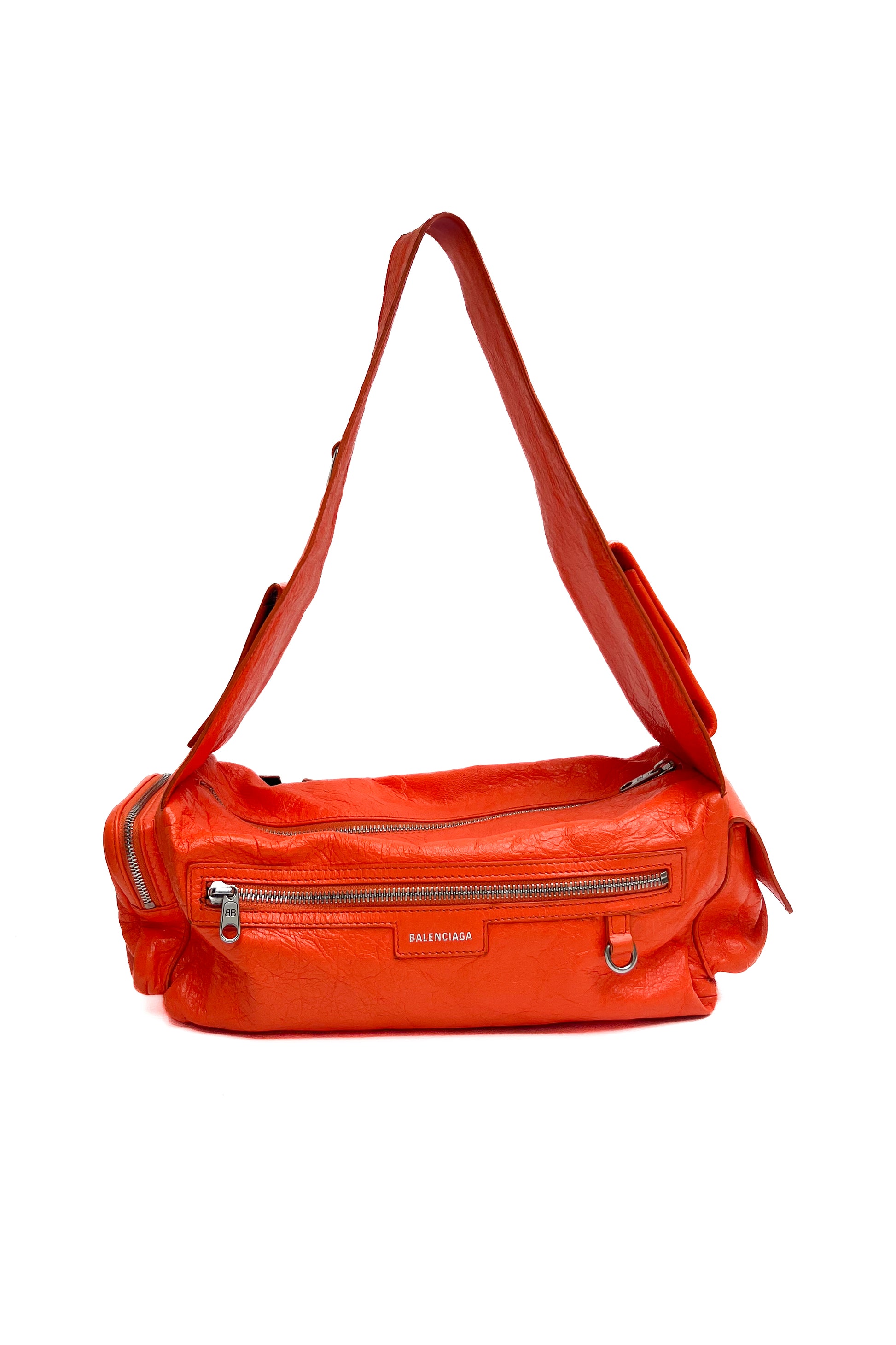 This vintage Balenciaga Superbusy shoulder bag comes in a bright orange soft leather with multiple little pockets that give the bag carater. The front of the bag features the signature Balenciaga logo and the bag has silver hardware details.