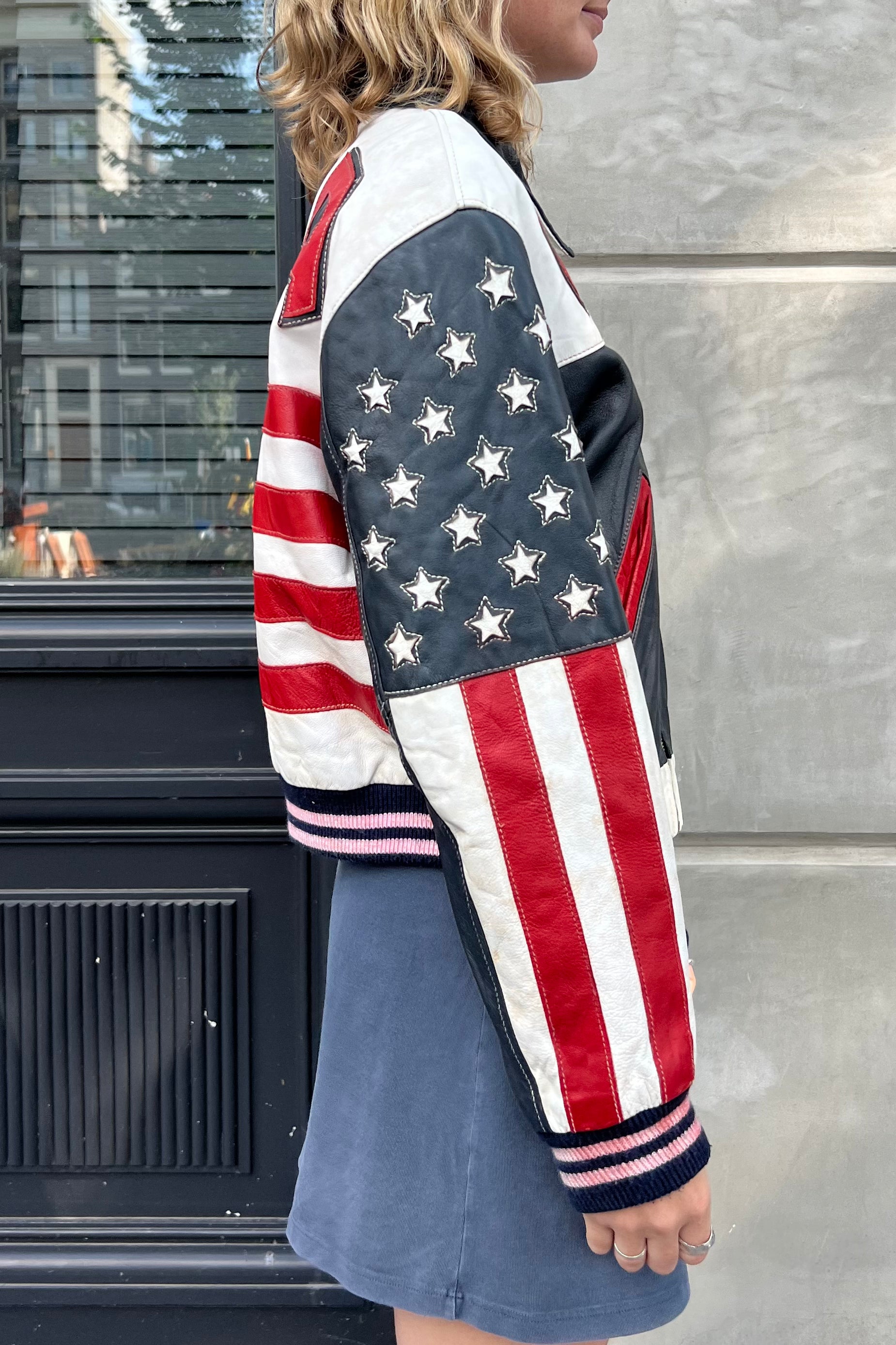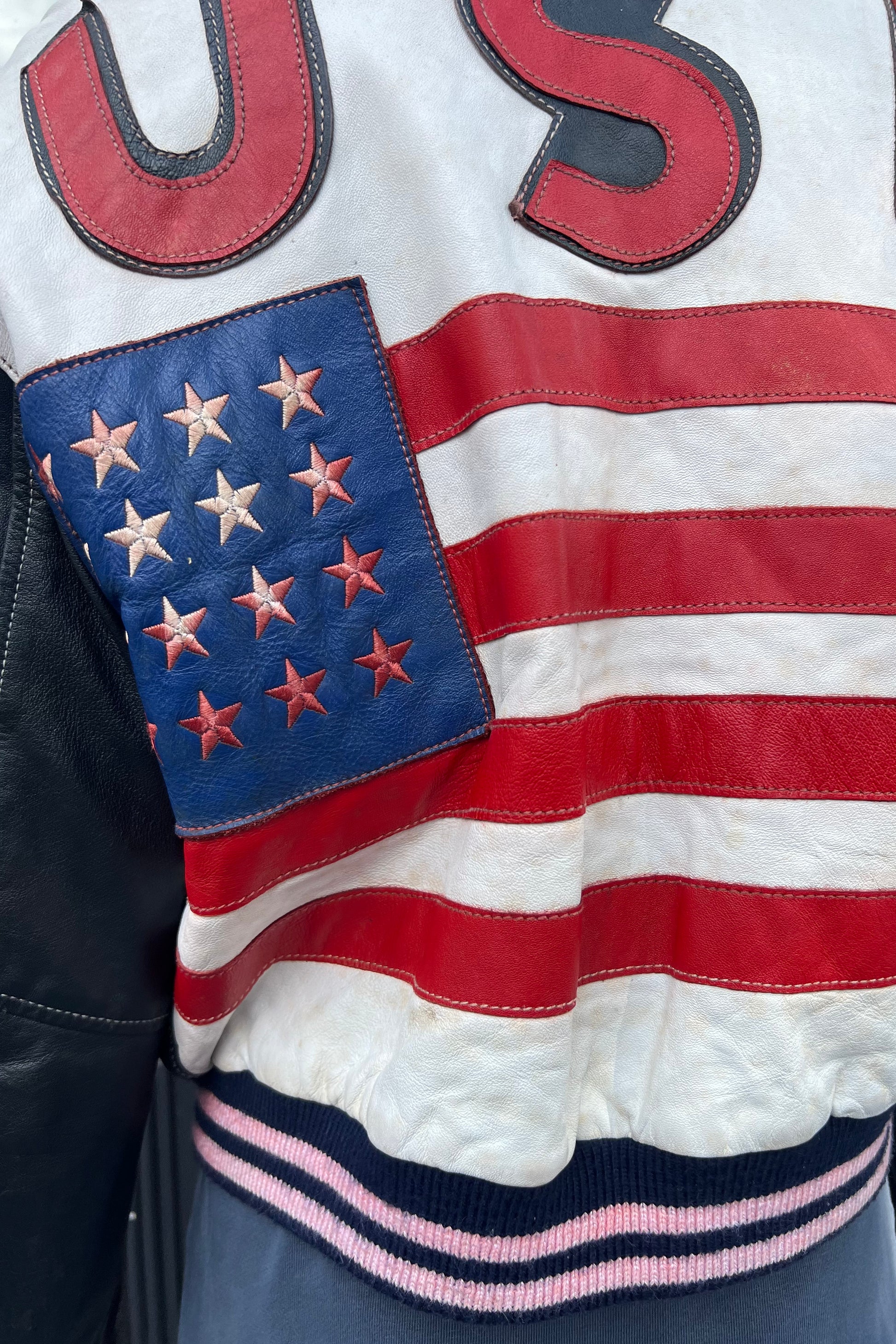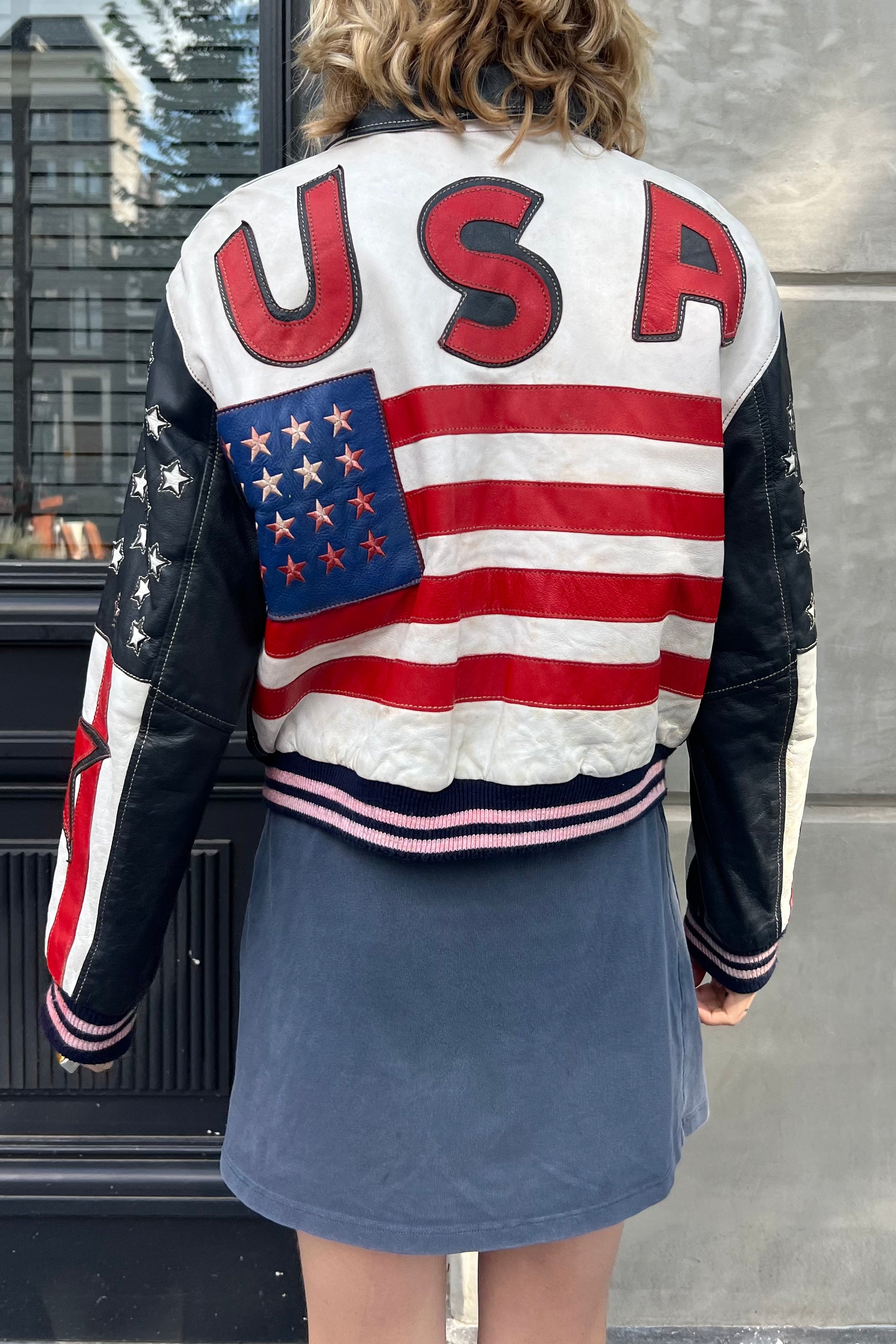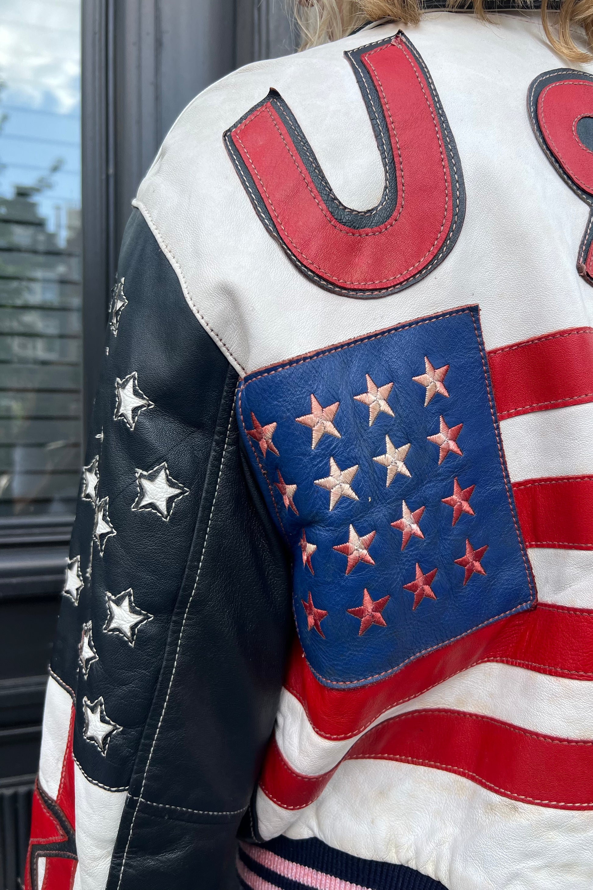 This vintage bomber style leather jacket shows bold American iconography. The front is coloured black with red and white shoulder patches forming the letters "CO". The sleeves motif as well as the back reflect the American flag.