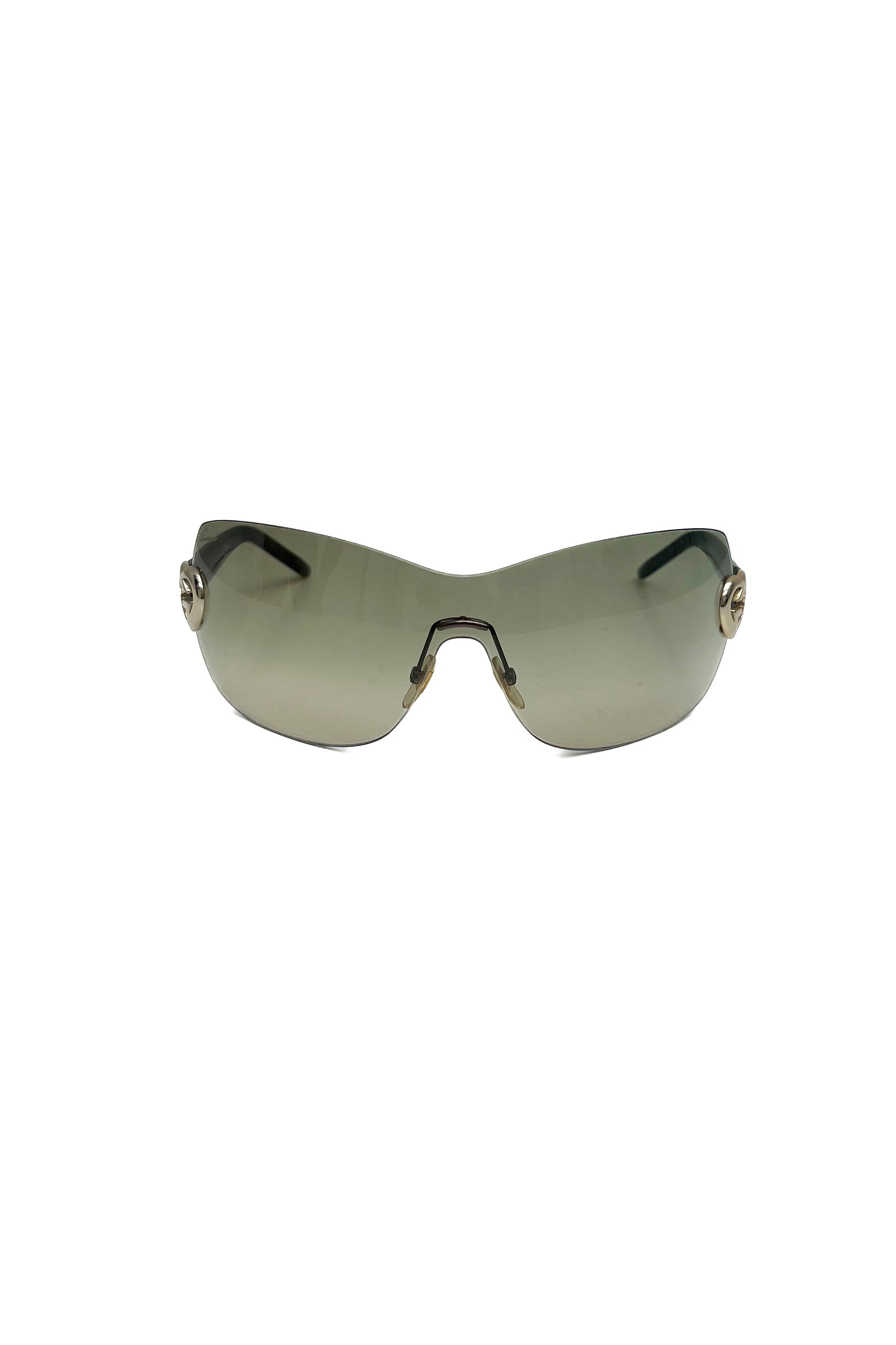These Vintage Gucci sunglasses feature a frameless mask-shaped light lens. The arms are adorned with silver interlocking G logos forming a heart on each side.