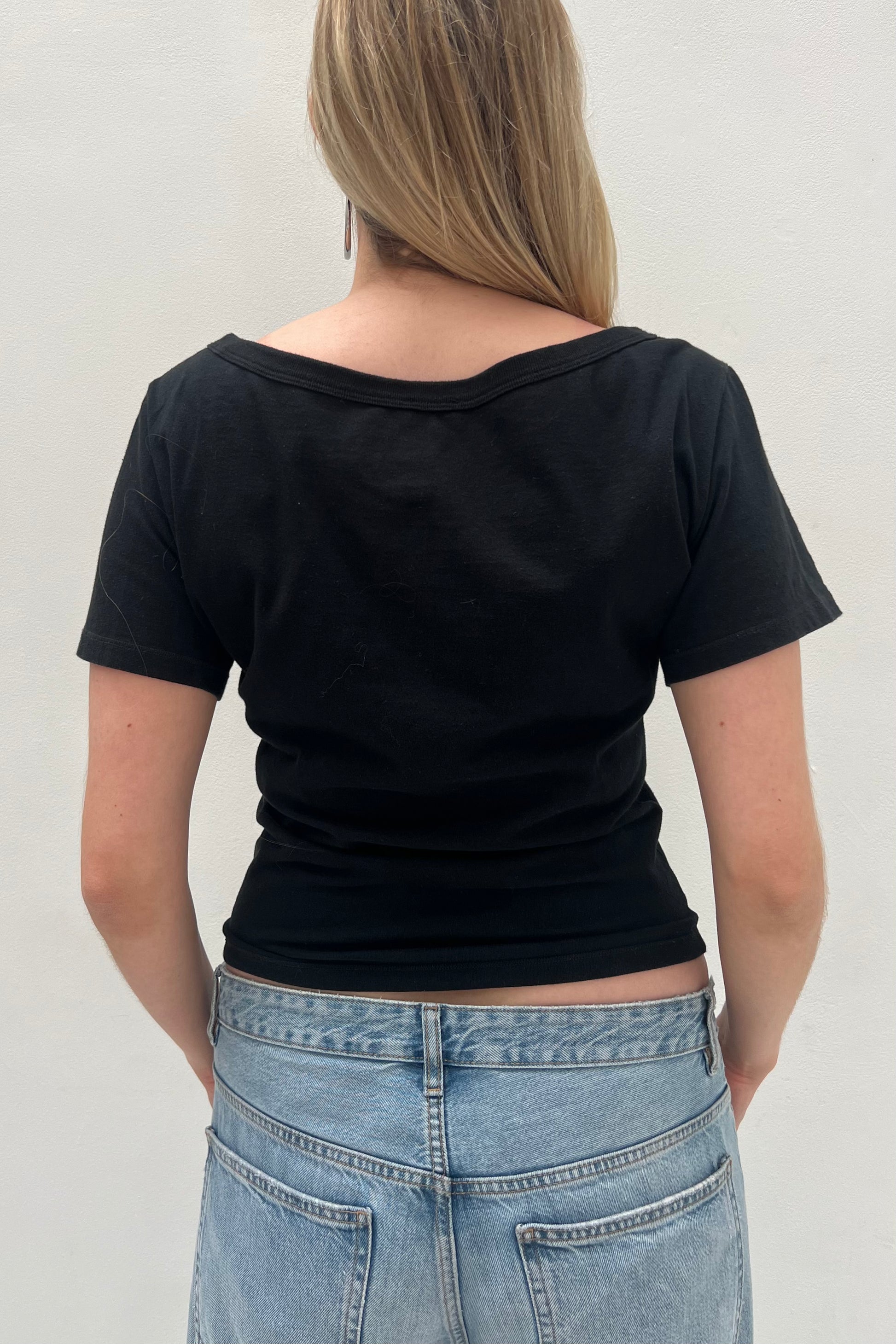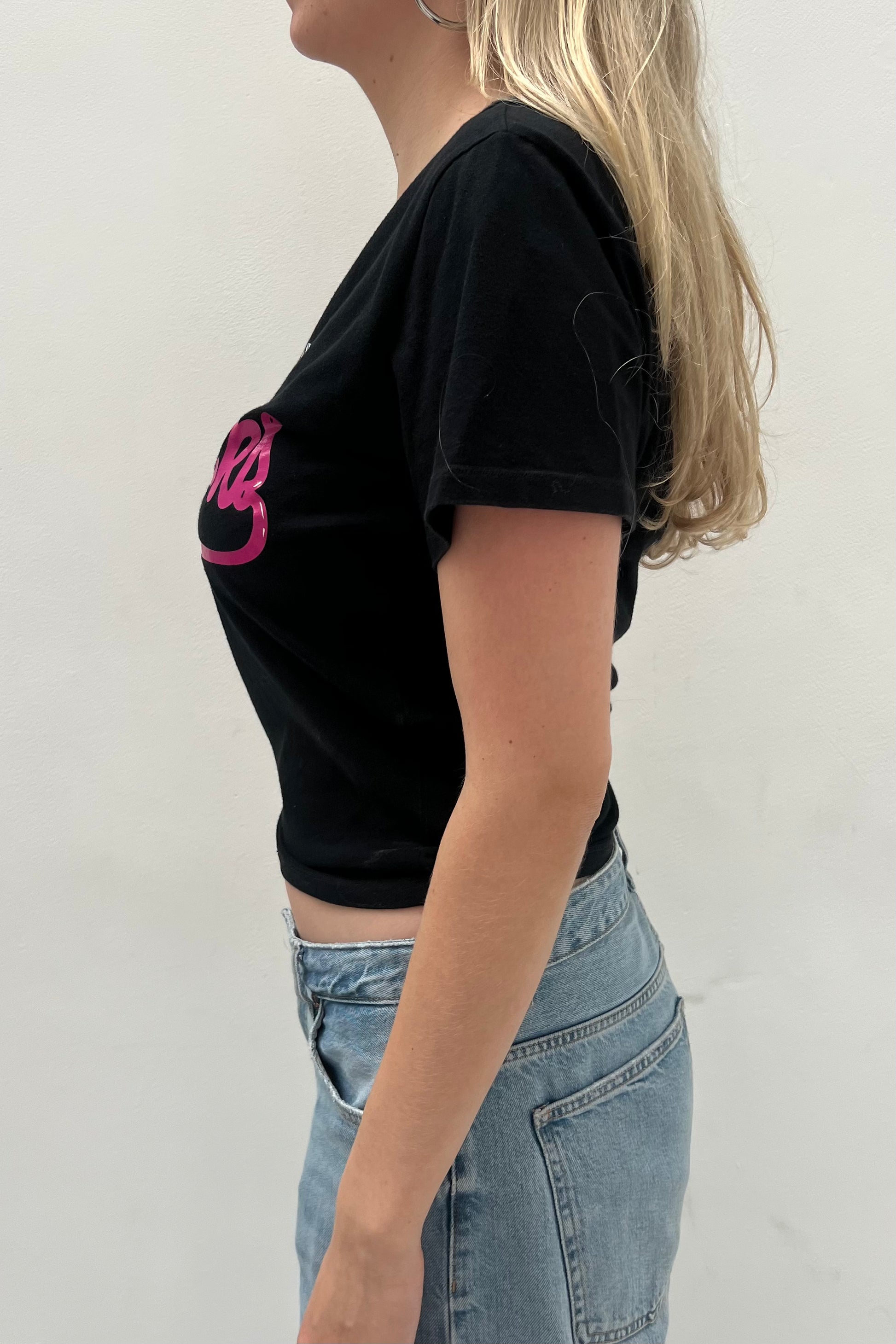 Vintage D&G black cotton tee with hot pink Cheyenne Chicks print. Has a boat neckline and is slightly cropped.