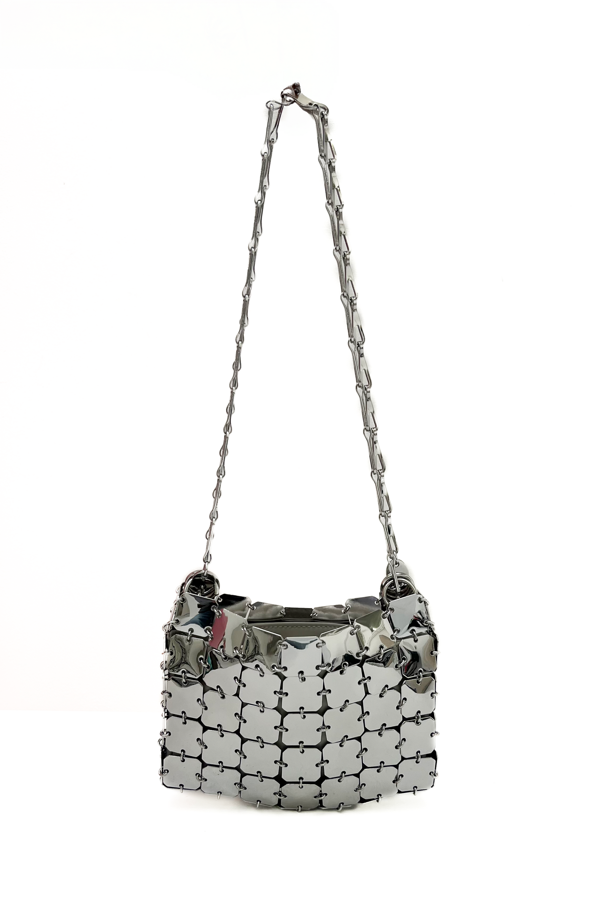 Vintage Iconic Paco Rabanne silver chainmail bag. Can be worn as a shoulder bag & crossbody. Features off white leather lining.