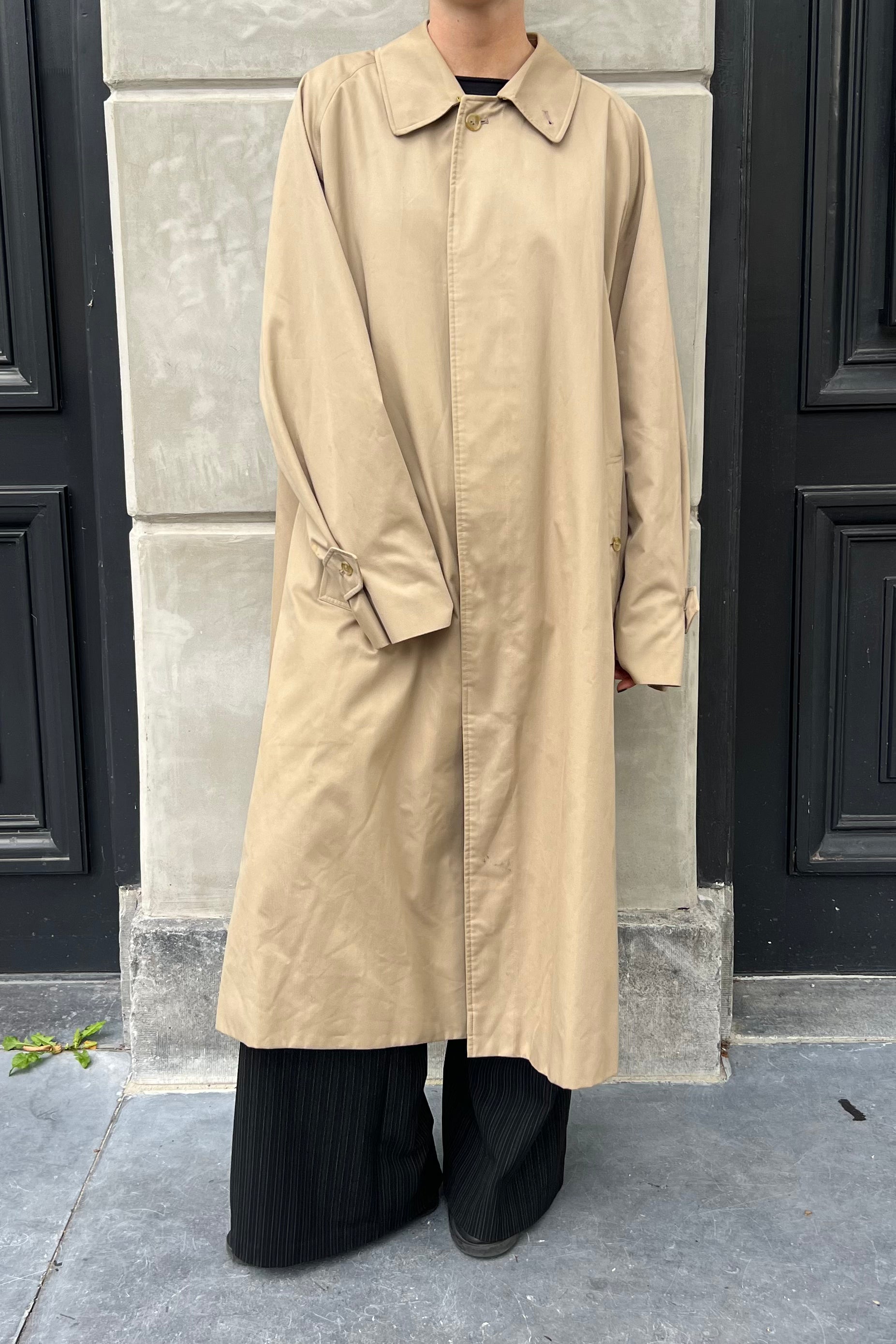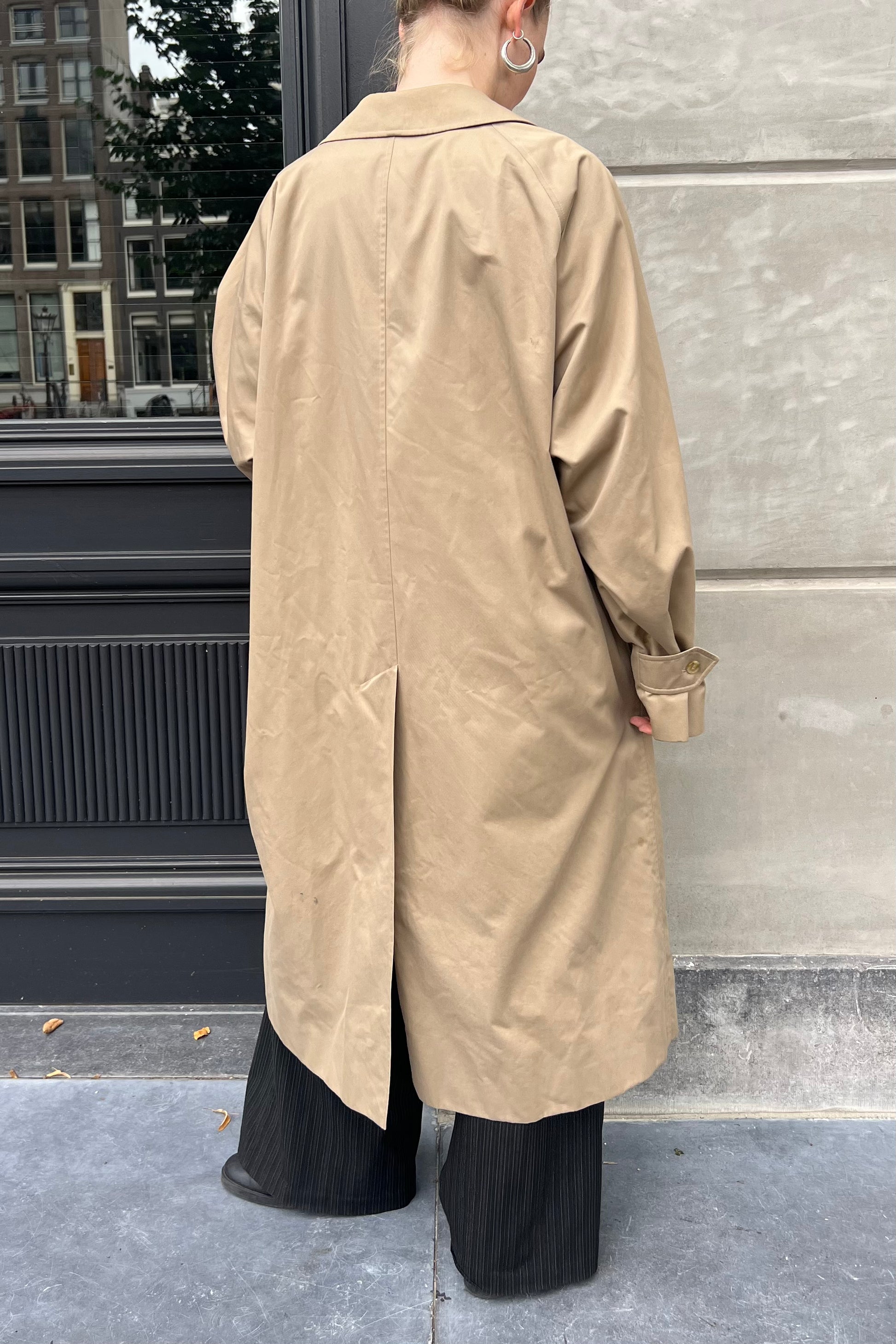 Classic Burberry trench coat in a warm beige tone. Features the timeless straight-cut silhouette with two internal pockets accessible from the outside. Detailed with buttoned cuffs and lined with the iconic Burberry nova check pattern.