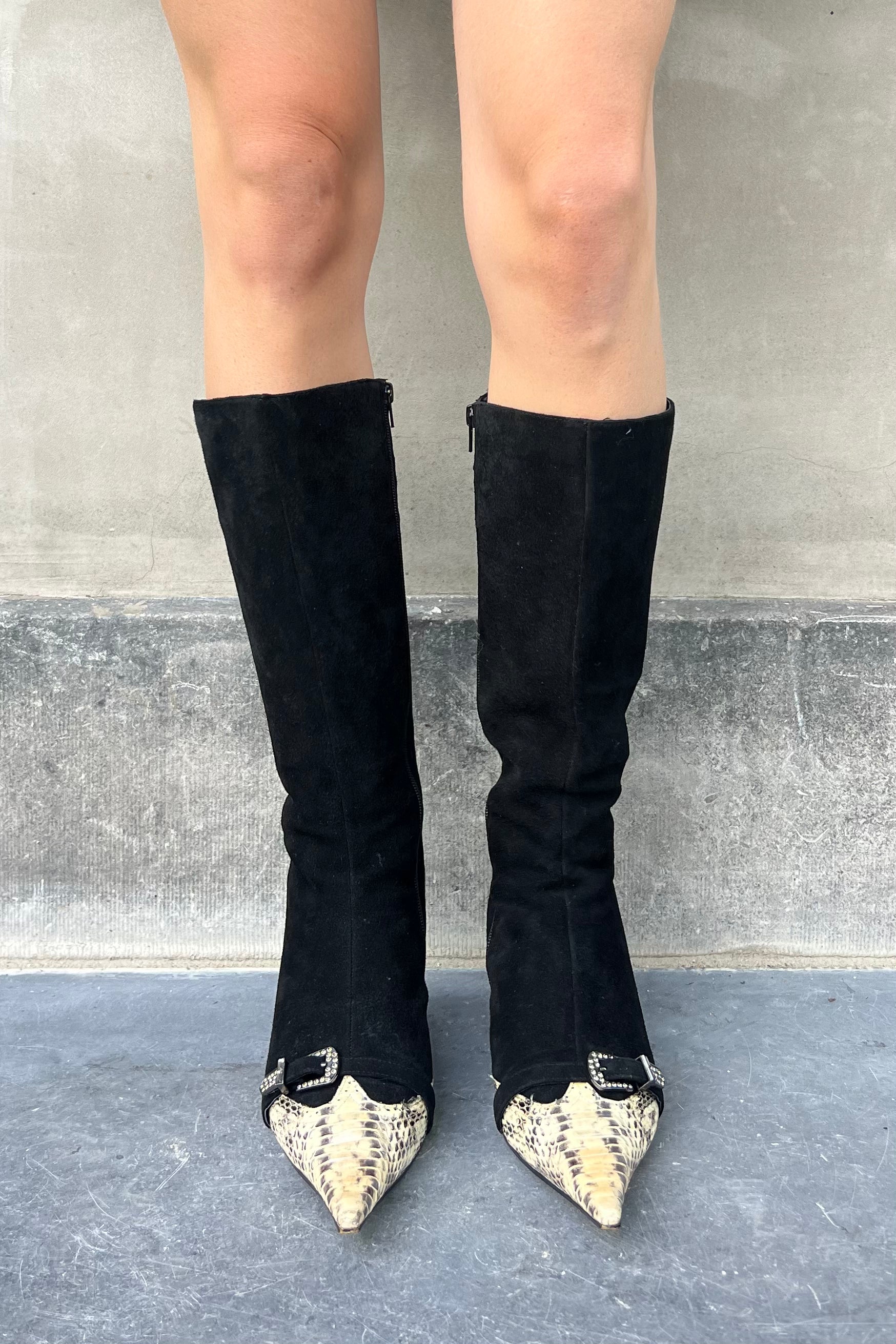 Vintage Roberto Botella boots crafted from black suede, accented with cream croc-embossed leather and finished with a kitten heel. A thin belt with silver hardware and rhinestones decorates the sharply pointed toe.
