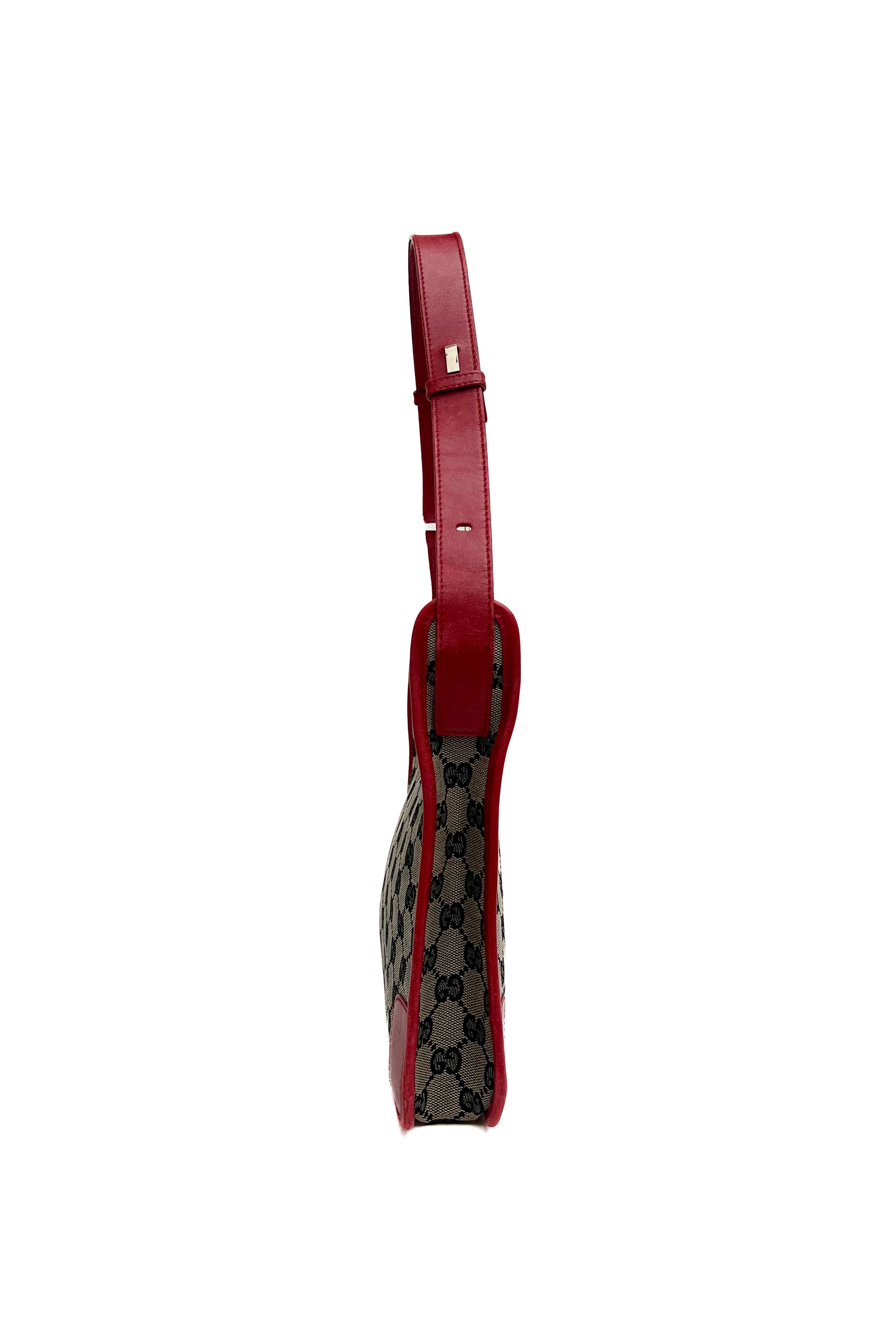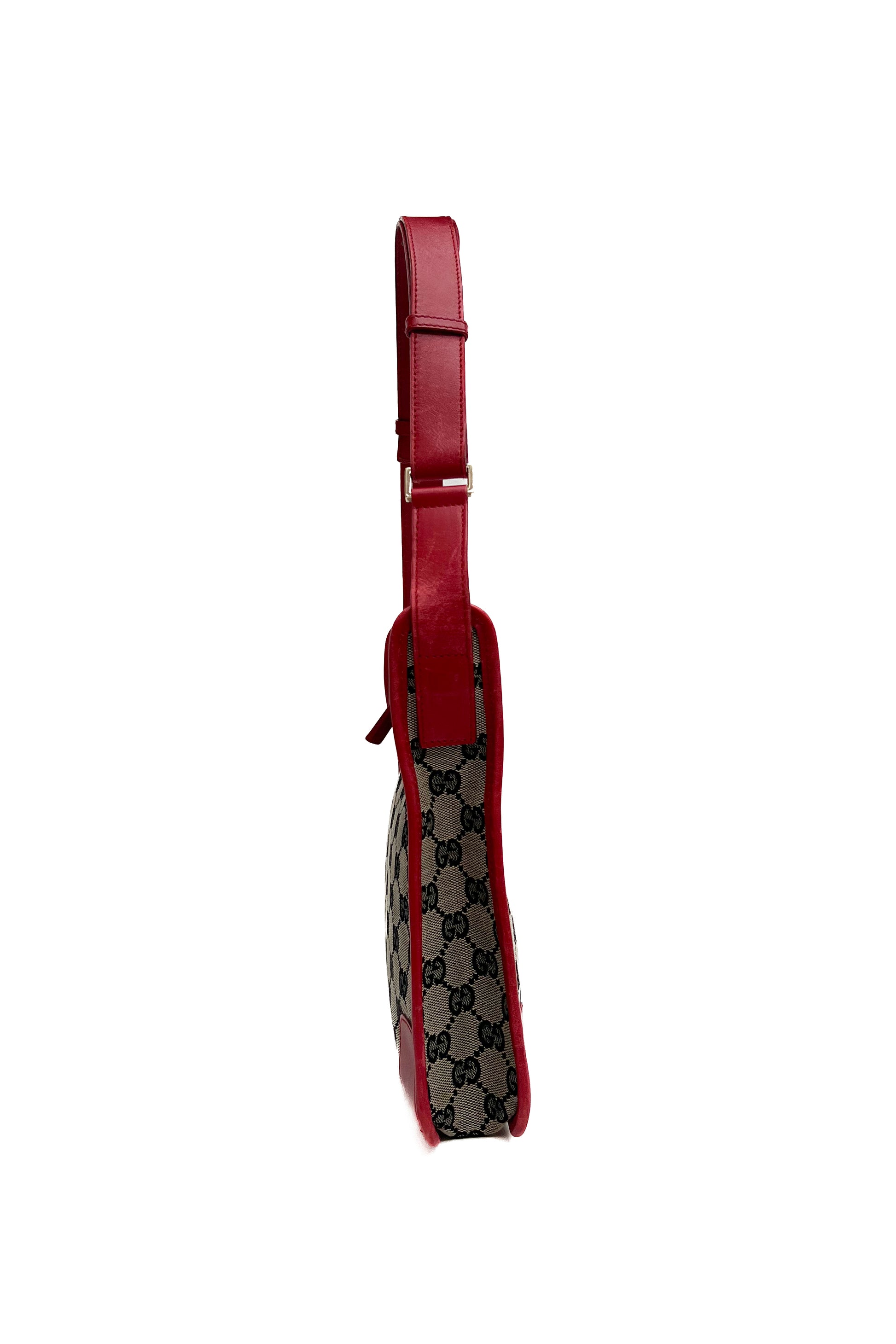 Navy monogram canvas Gucci shoulder bag with red leather details and handle. The inside has an internal slip pocket.