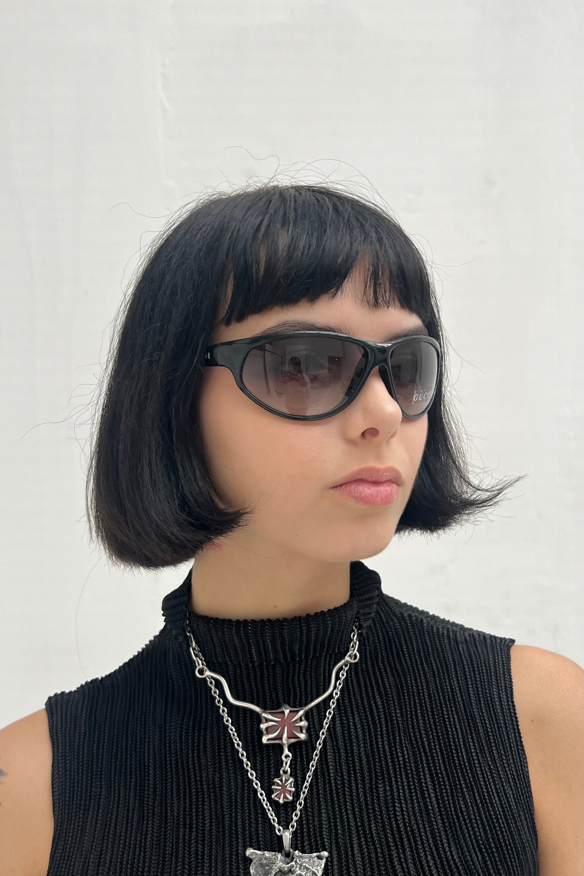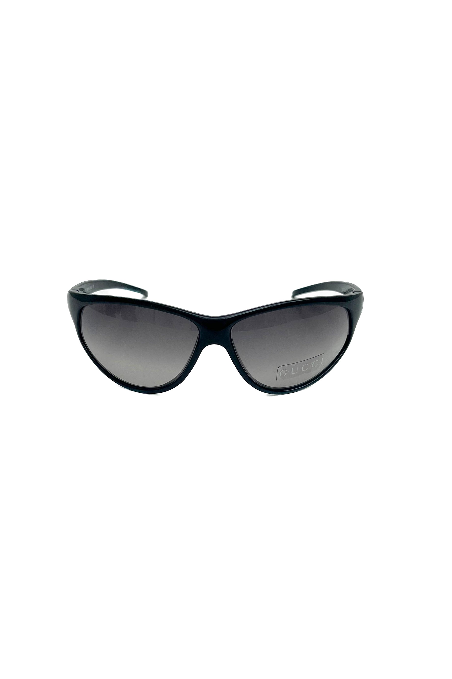 These Vintage simple speedy Gucci sunglasses come in all black with a little silver Gucci logo on both sides and dark lenses.