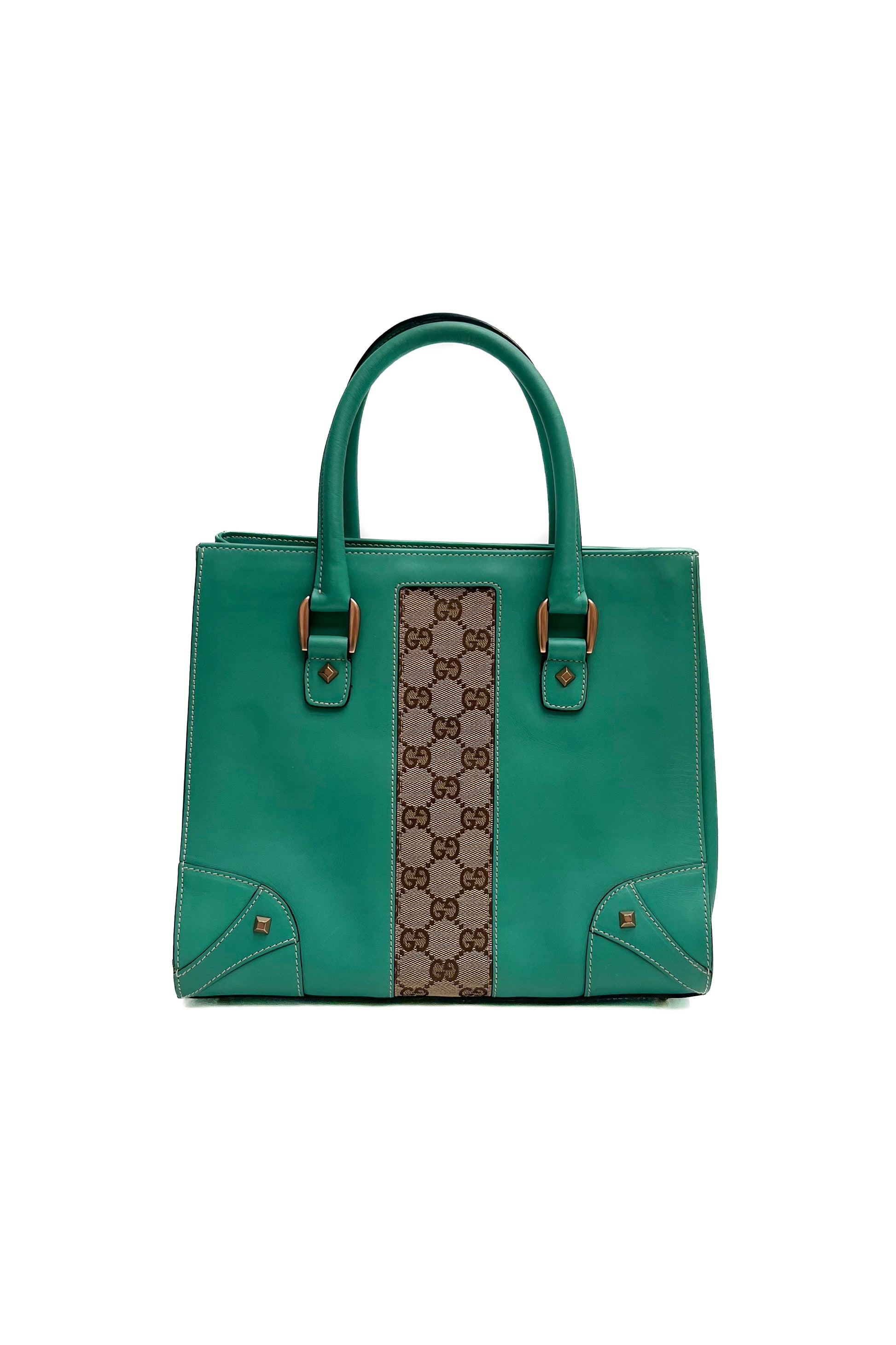 Vintage leather turquoise Gucci bag with GG monogram canvas details on the front and back. It comes with double turquoise leather handles and bronze hardware details.