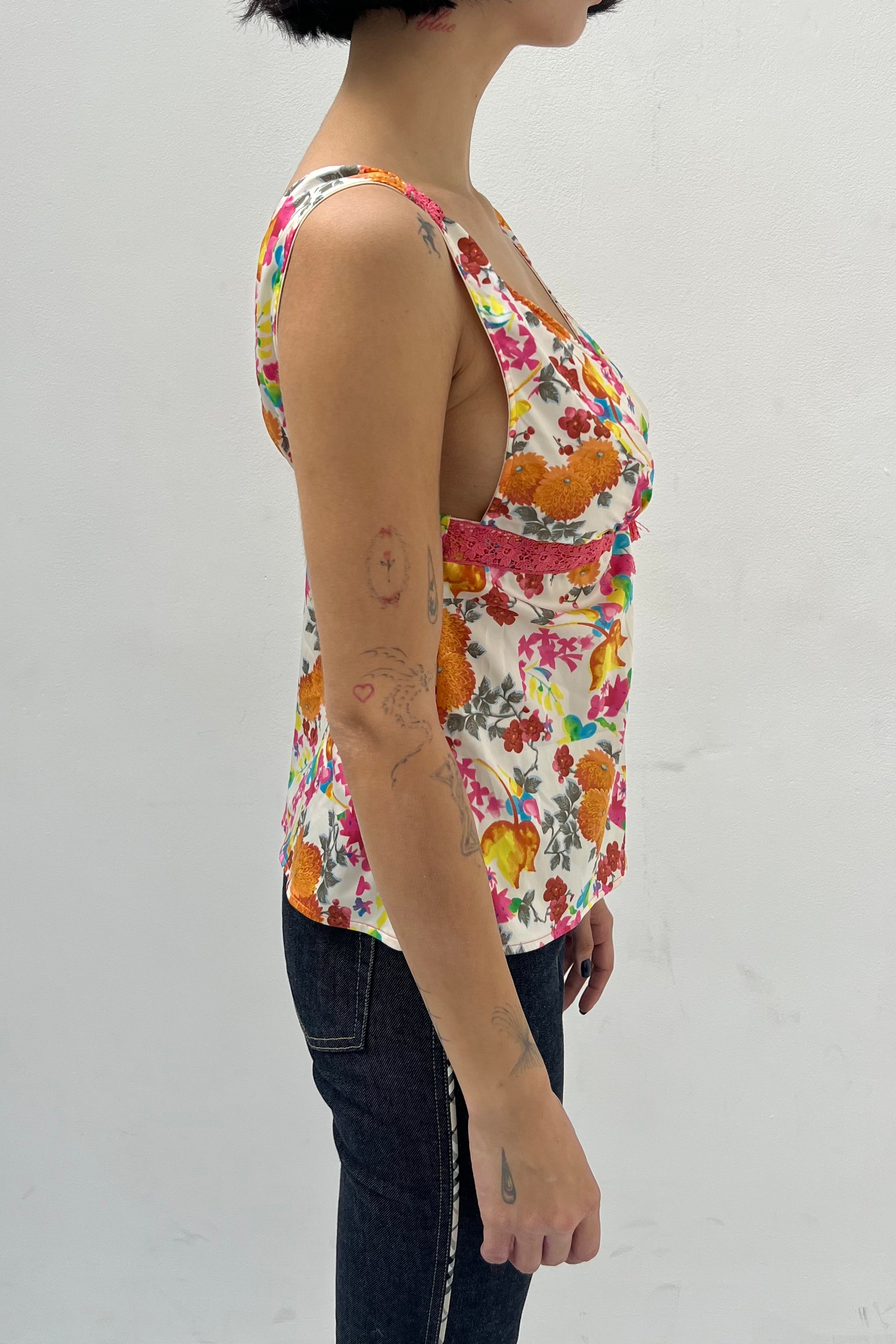 Vintage silk Christian Dior multicolor floral top from the John Galliano era. Features pink lace detail in the front and on the shoulders.