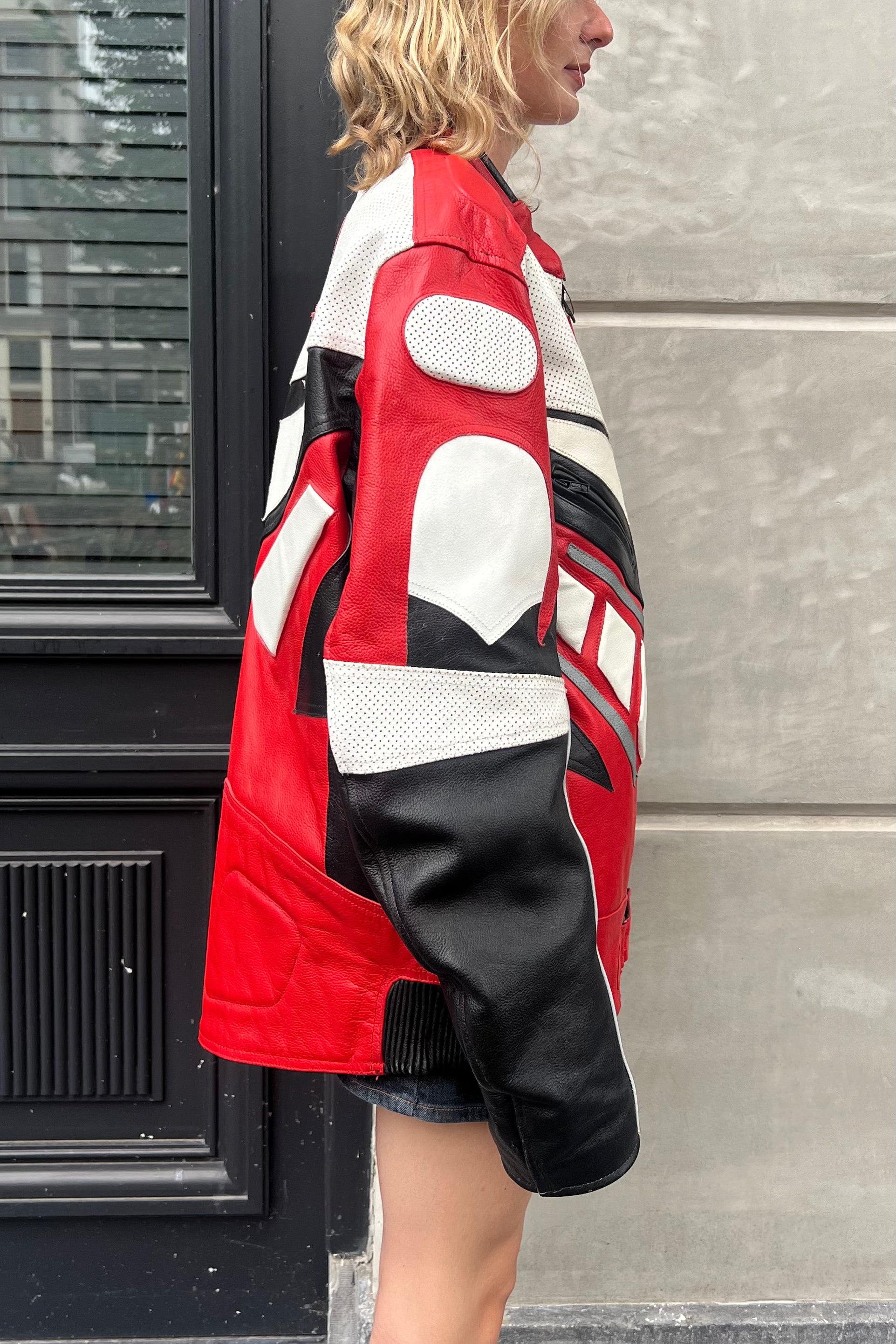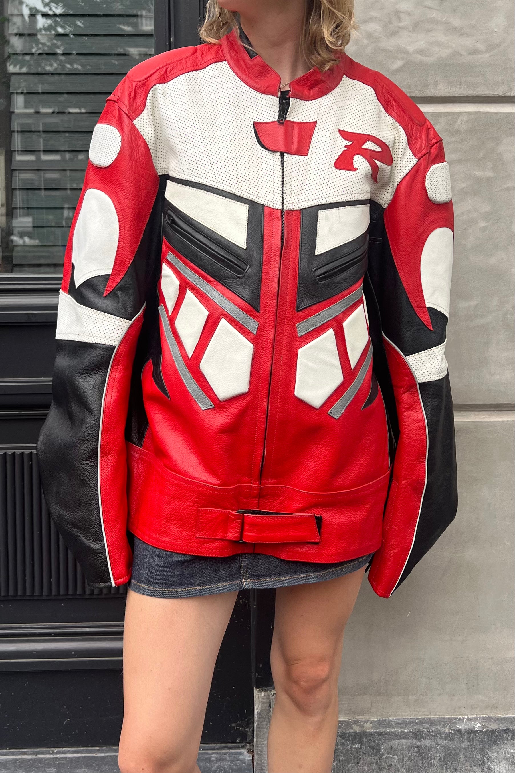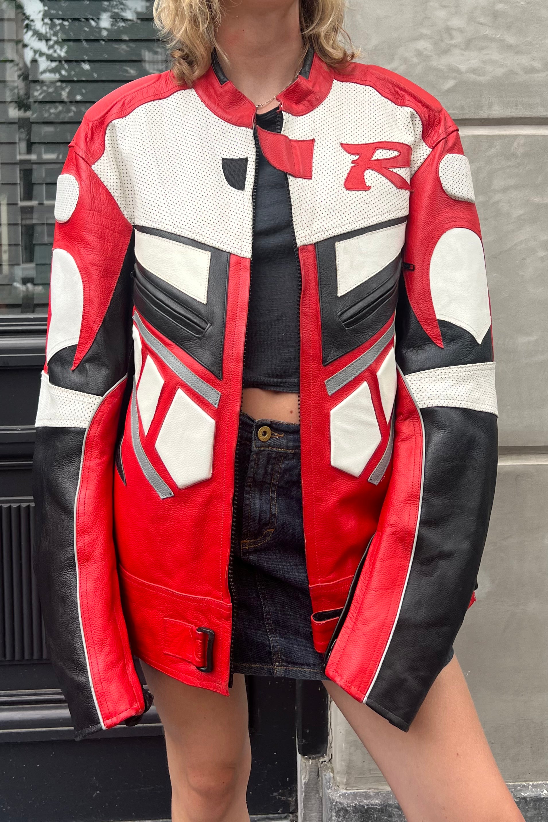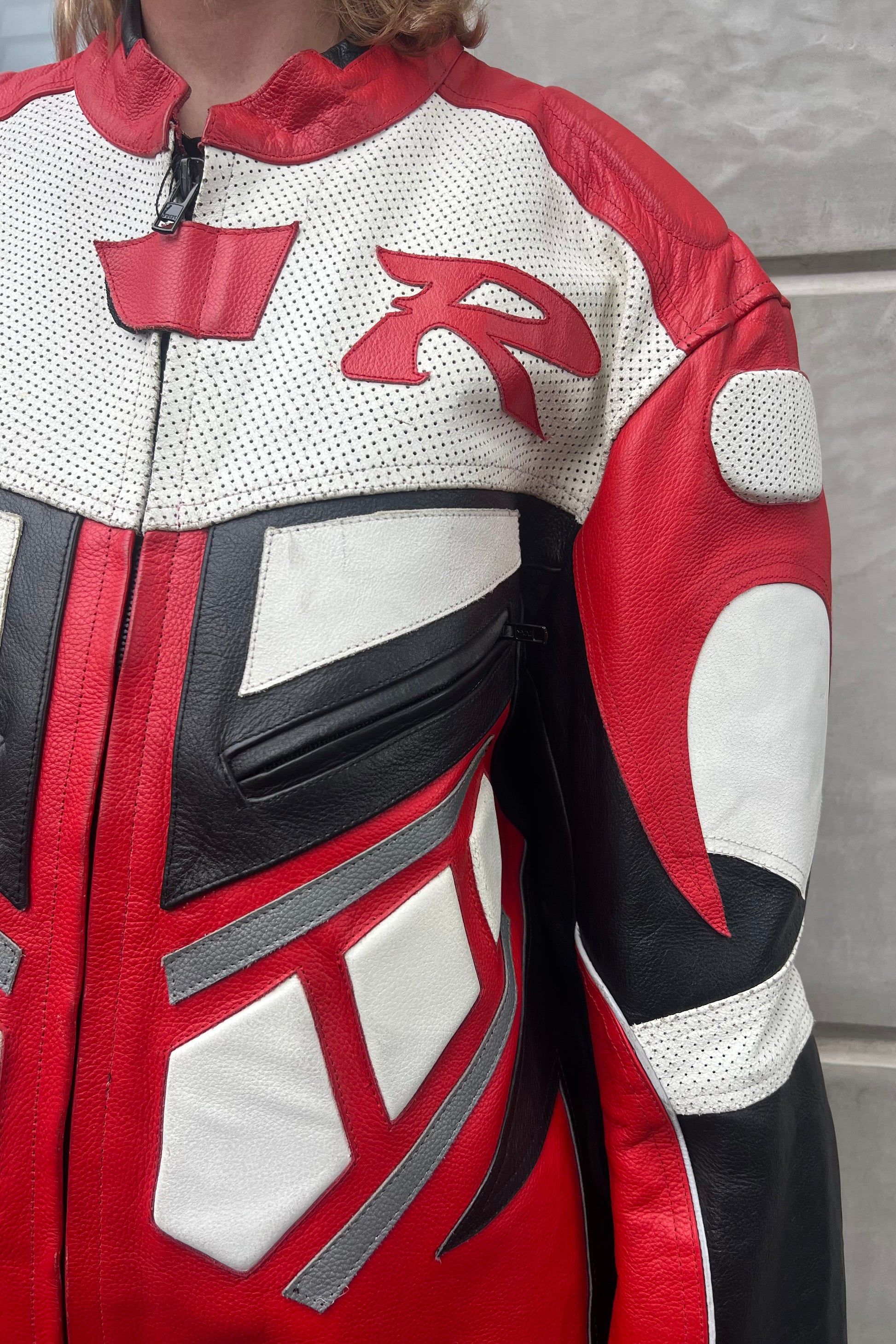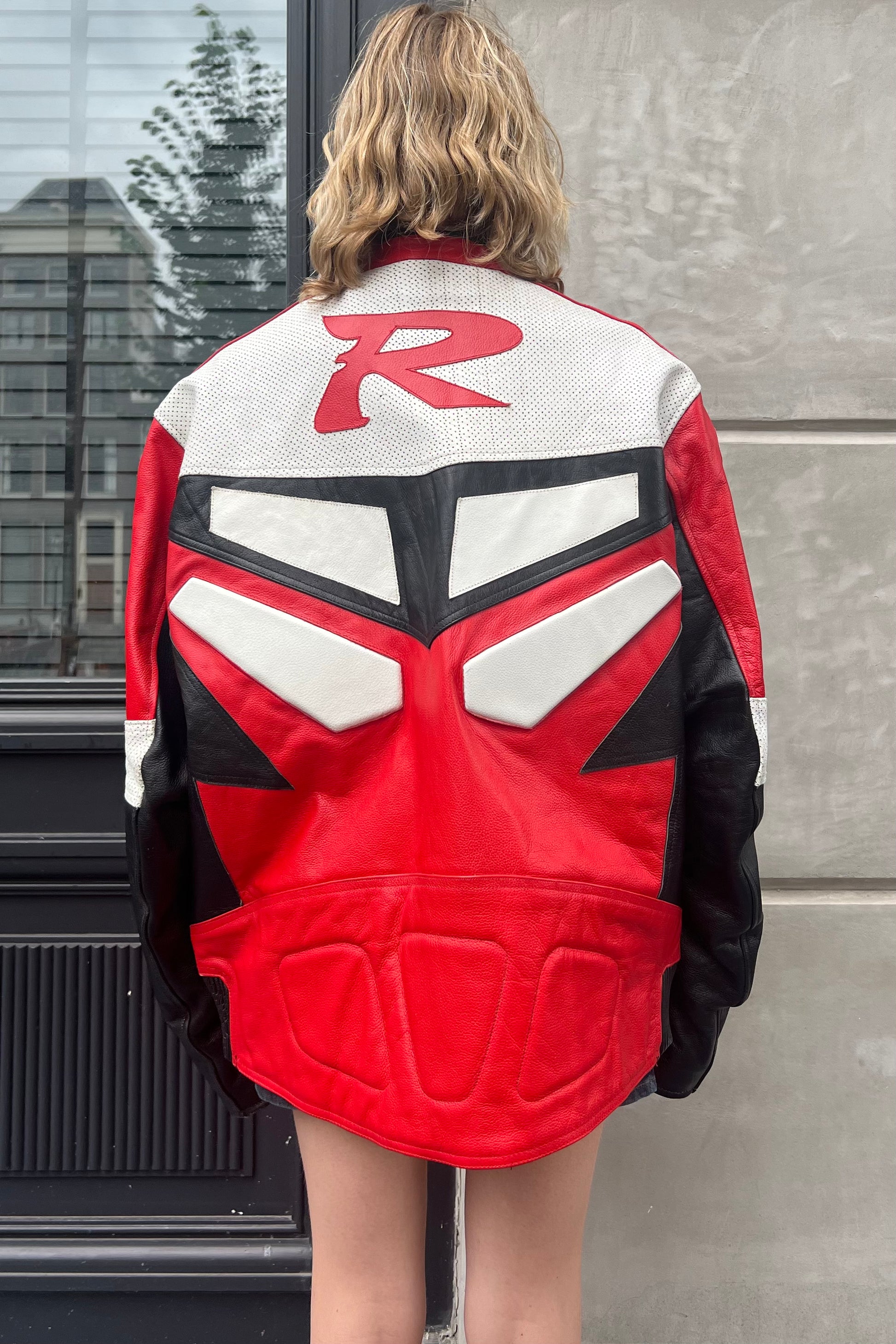 This vintage racing motorcycle jacket made from thick sturdy leather comes in white, red, and black. It features zip pockets, adjustable tabs, and a striking "R" letter on the chest and back.